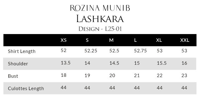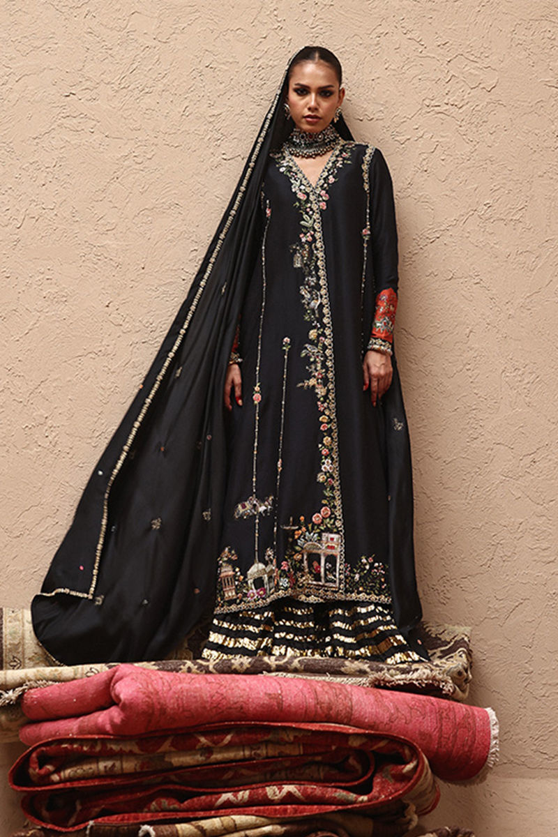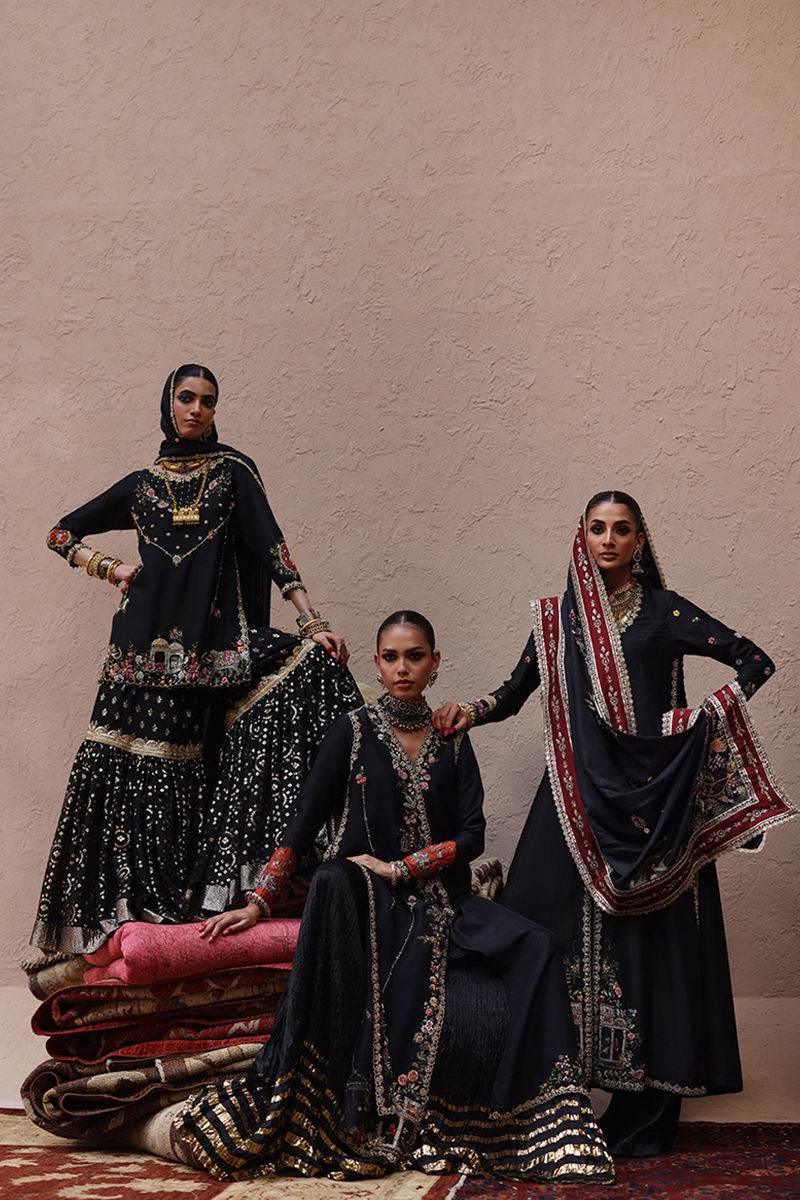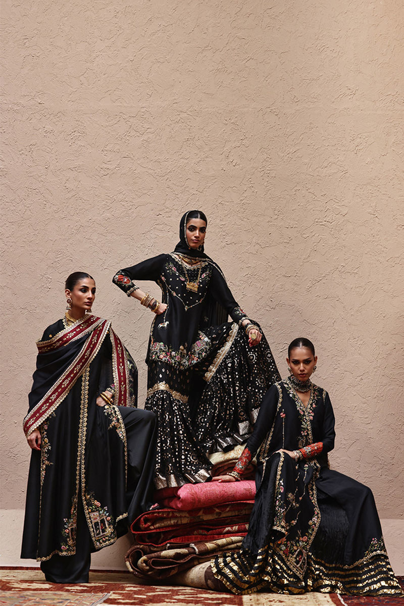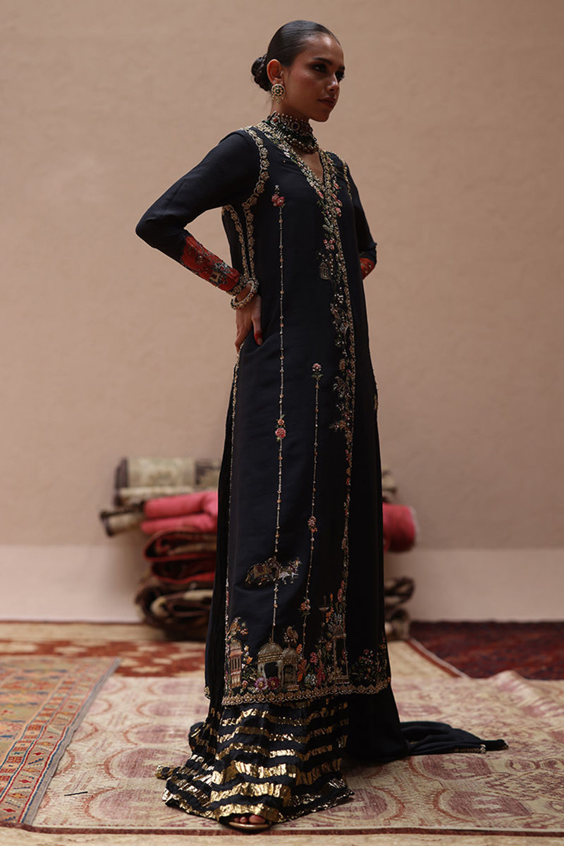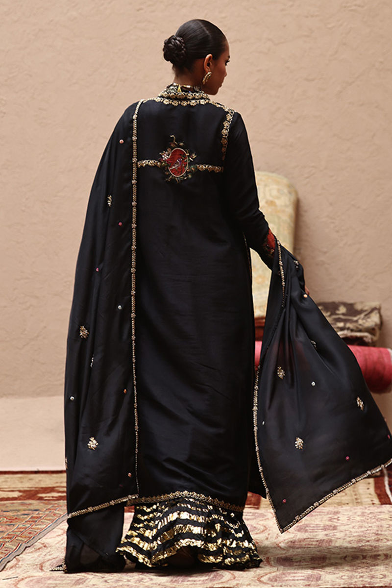 Embodying Mughal grandeur, this chogha-style ensemble is crafted from pure 80gms raw silk with digitally rendered motifs, enriched with resham, zari, zardozi, and intricate embellishments of cutdana, crystals, stones, sequins, dabka, nakshi, and pearls on the front, back, and sleeves. Paired with crushed culottes, the look exudes refined elegance. Optional pure medium silk dupattas include a heavy version with a four-sided gold embroidered bail, motifs, zardozi work, and resham botis, or a lighter option with allover motifs and delicate zardozi and resham botis. An optional classic black sheesha silk shawl with Mughal-inspired digital print, zari, and zardozi completes the ensemble.