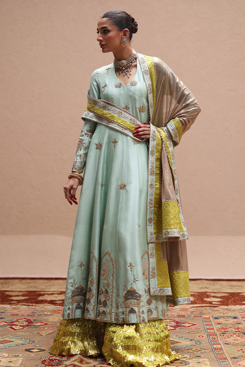 This aqua angarkha kalidaar in pure 80gms raw silk is adorned with light and dark gold zari embroidery, antique lame, and intricate zardozi work featuring kora, dabka, cutdana, stones, pearls, nakshi, sequins, and silver bird motifs on the front, sleeves, and back. Paired with crushed lime dhaka pants for a fresh, vibrant contrast, it can be styled with your choice of dupatta: a pure medium silk with a four-sided gold border, a pure organza with scalloped zari embroidery, sequined handworked border and chan, or a gold lame dupatta enriched with zari embroidery, handworked borders, and banarsi detailing.