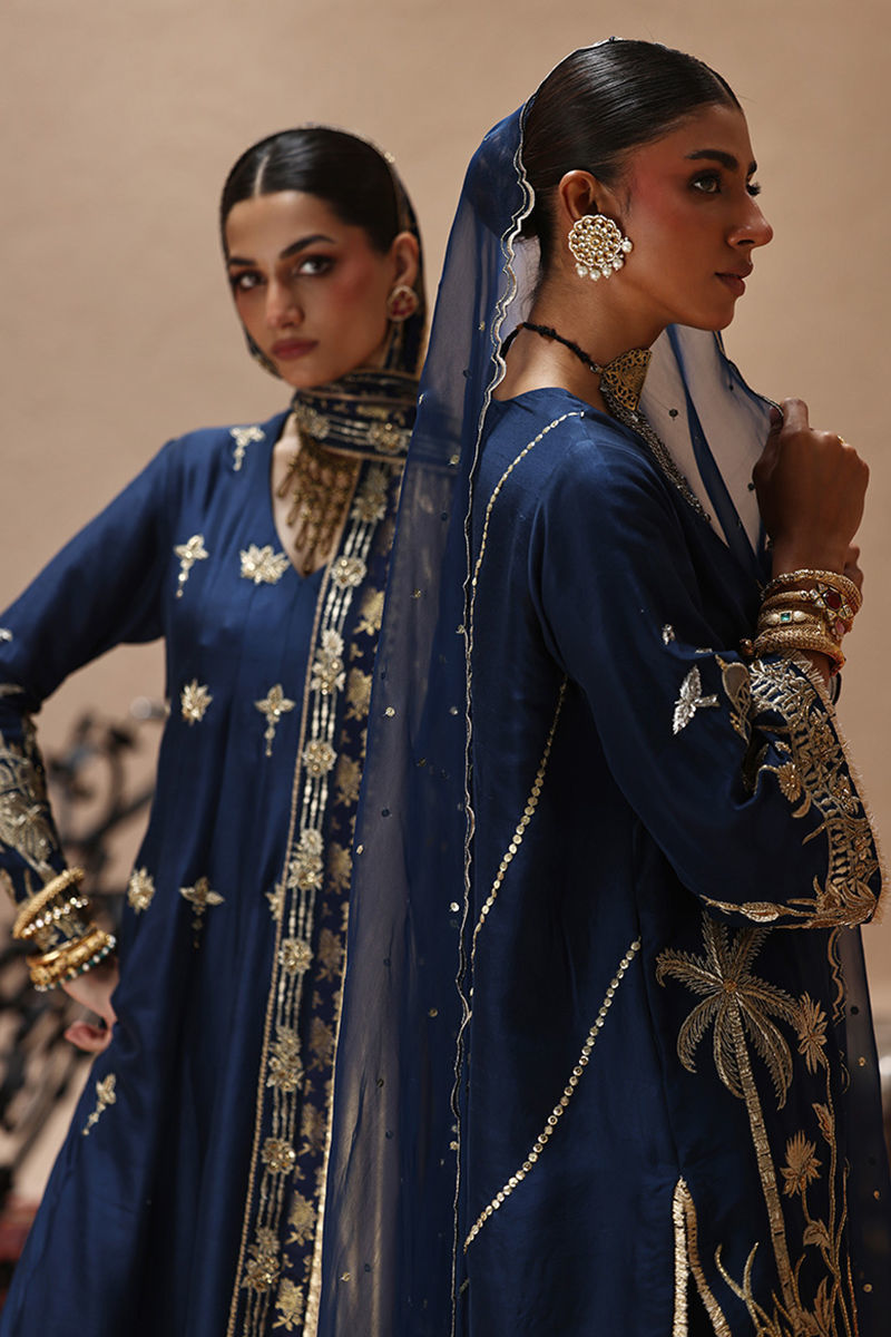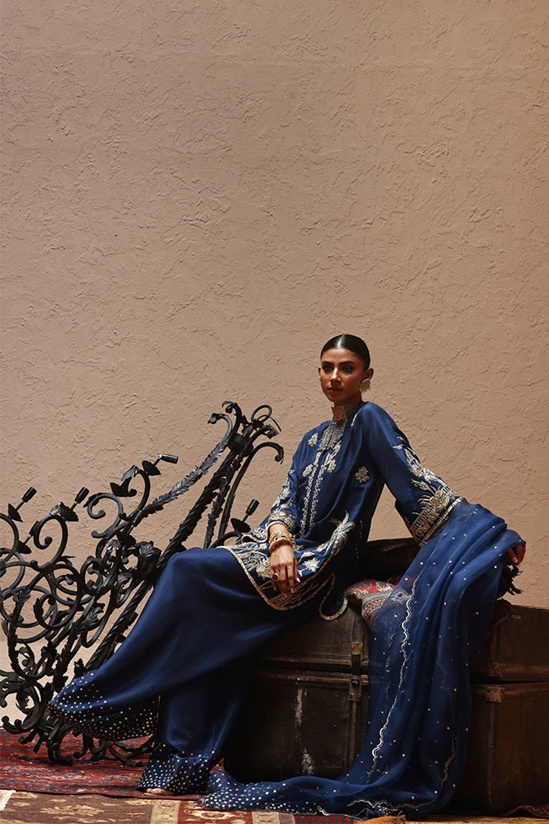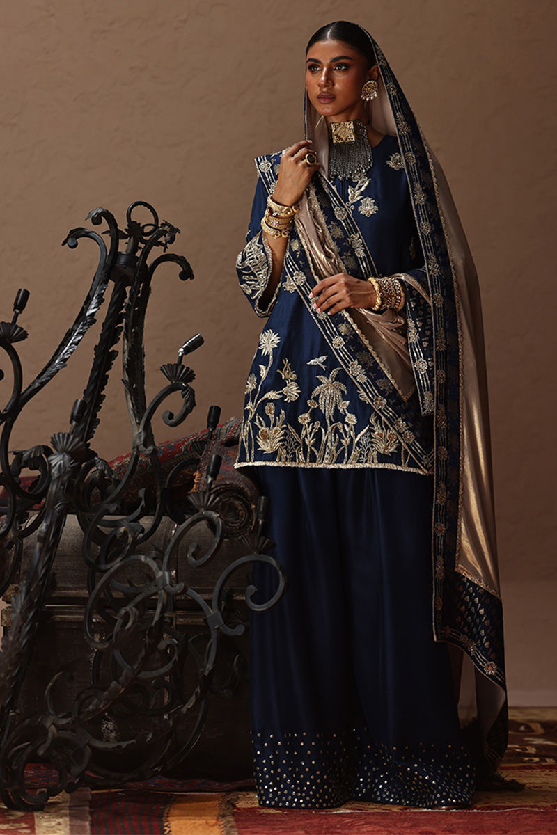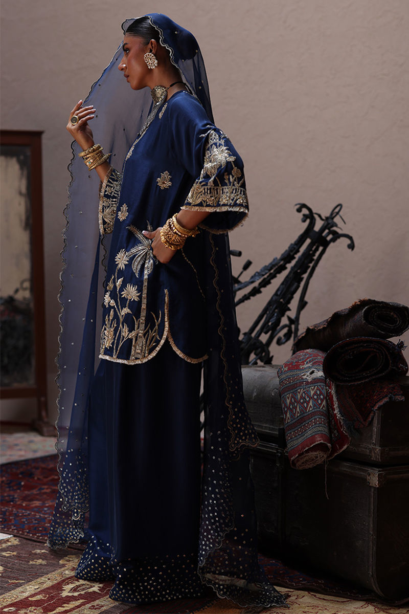 This deep blue ensemble in pure 80gms raw silk features a short shirt with pockets, richly adorned with light and dark gold zari embroidery, antique lame, and intricate zardozi work including kora, dabka, cutdana, stones, pearls, nakshi, sequins, and silver bird motifs on the front, sleeves, and back. Paired with farshi culottes detailed with sequins at the hem, the look is completed with your choice of dupatta: a pure silk with a four-sided gold border, an organza with scalloped zari embroidery, sequined handworked border and chan, or a regal gold lame with zari embroidery, banarsi finishing, and handworked borders.
