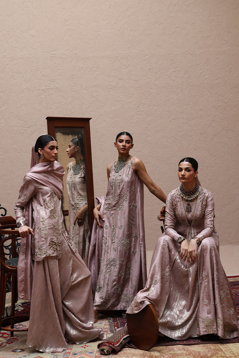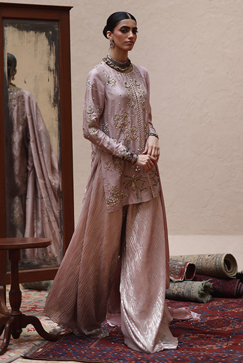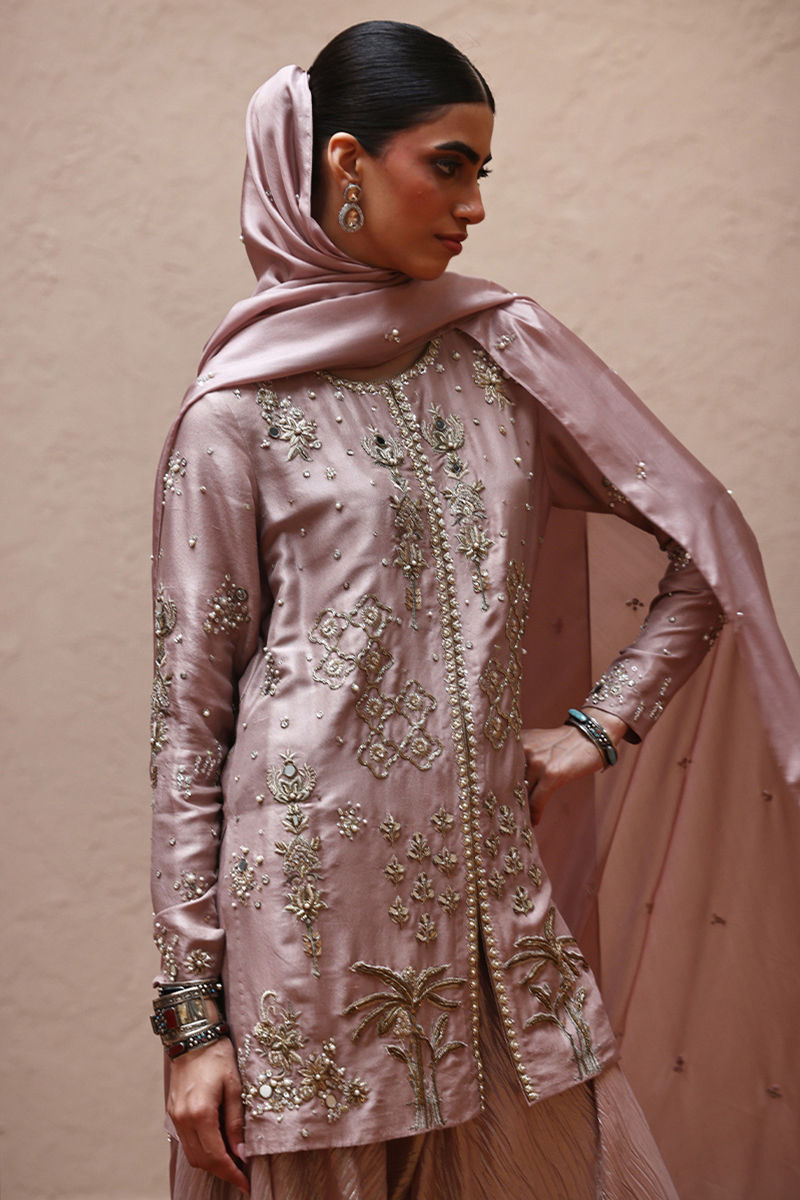 Misty Rose short shirt in pure 80gms raw silk, featuring gold and antique zari embroidery with zardozi work that includes kora, dabka, cutdana, stones, pearls, nakshi, sequins, and mirror on the front, sleeves, and back. Paired with flowy shimmer crush culottes and a pure medium silk dupatta with all-over botis and chan, embellished with pearls, mirrors, and stones.