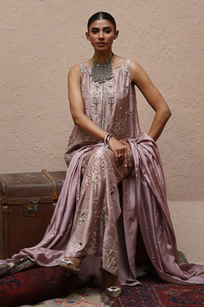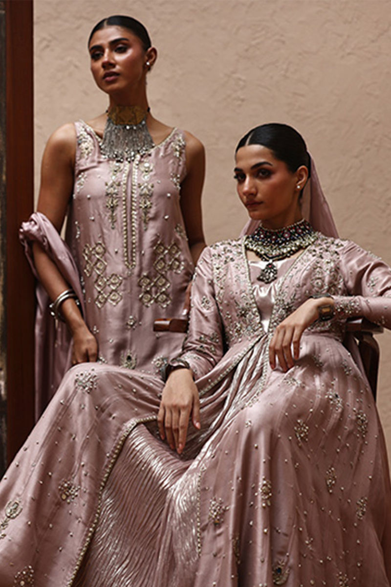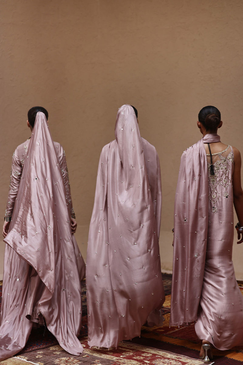 The straight kaftan with slits in Misty Rose color is crafted from pure 80gms raw silk and embellished with gold and antique zari embroidery, enriched with zardozi work featuring kora, dabka, cutdana, stones, pearls, nakshi, sequins, and mirrors on the front, sleeves, and back.It comes with versatile bottom options, including pants in pure raw silk or cotton charmeuse, and culottes in either fabric. The look is completed with a pure medium silk dupatta detailed with all-over botis and chan, delicately accented with pearls, mirrors, and stones.