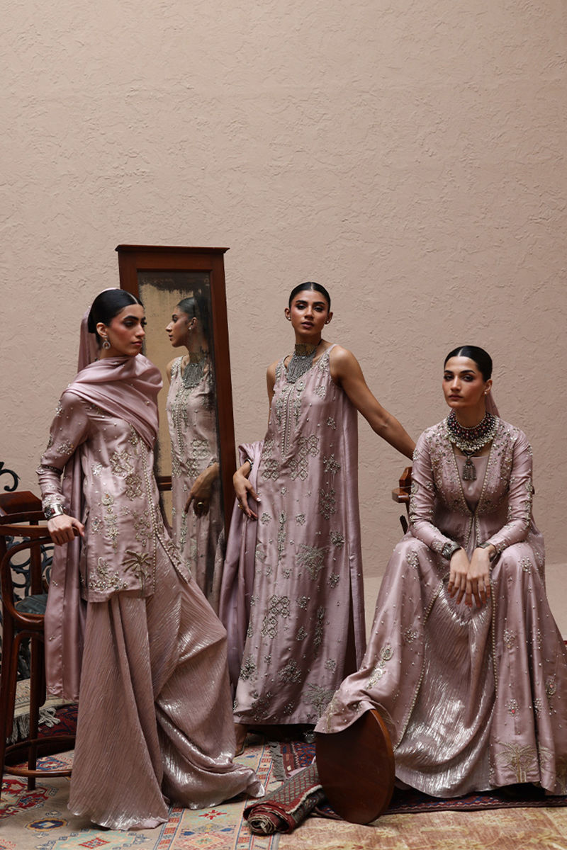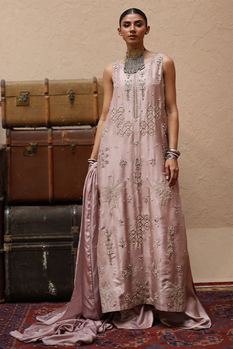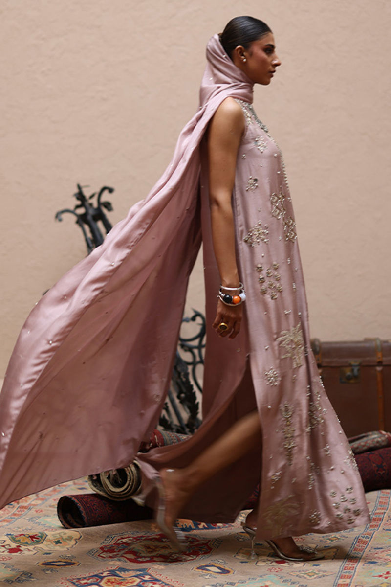 The straight kaftan with slits in Misty Rose color is crafted from pure 80gms raw silk and embellished with gold and antique zari embroidery, enriched with zardozi work featuring kora, dabka, cutdana, stones, pearls, nakshi, sequins, and mirrors on the front, sleeves, and back. It comes with versatile bottom options, including pants in pure raw silk or cotton charmeuse and culottes in either fabric. The look is completed with a pure medium silk dupatta detailed with all-over botis and chan, delicately accented with pearls, mirrors, and stones.