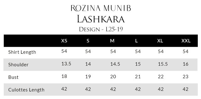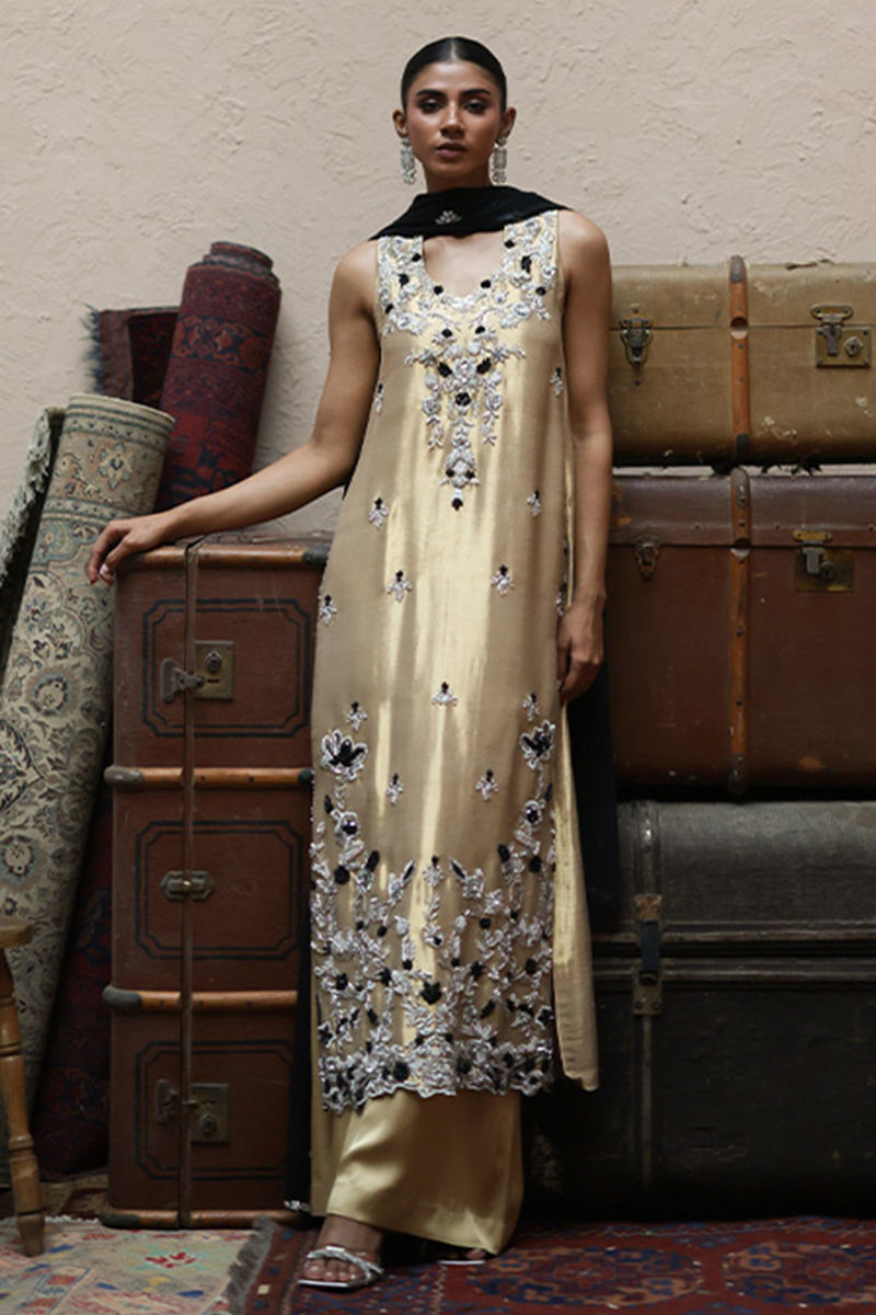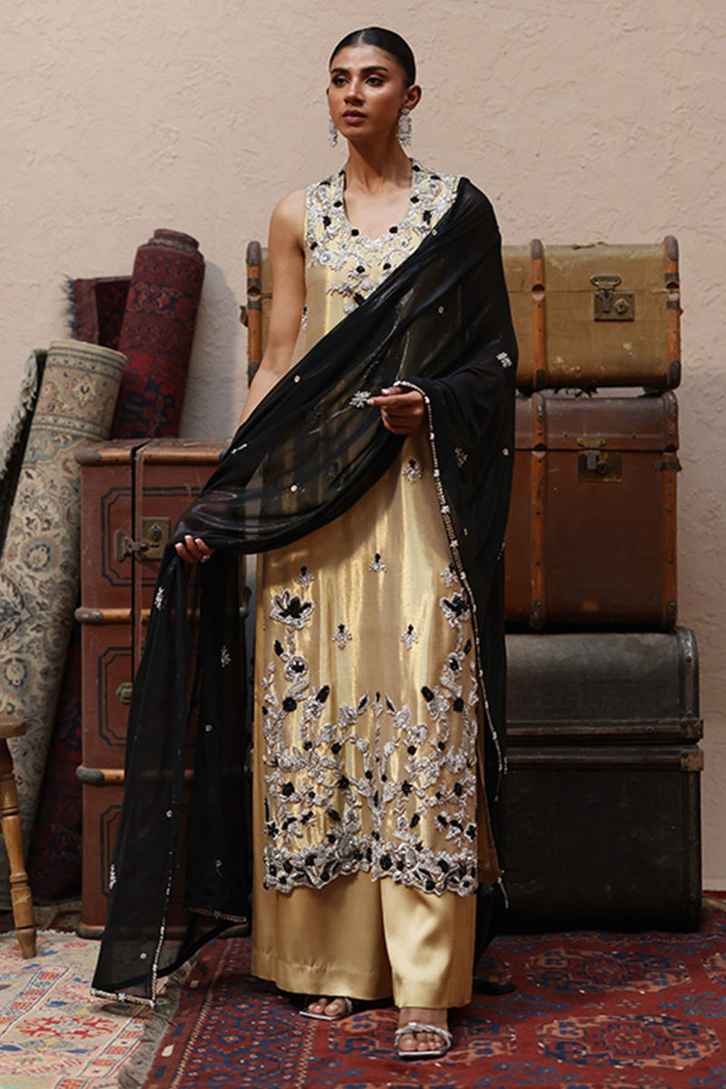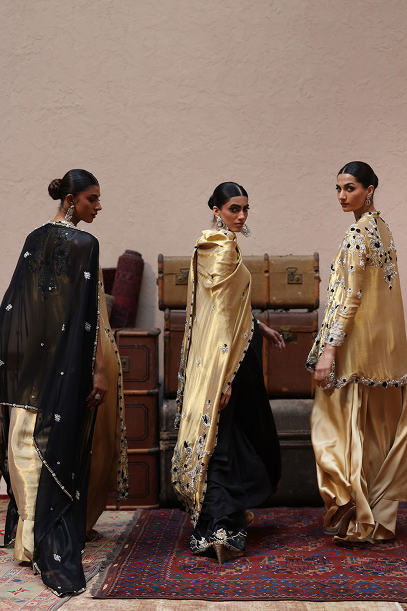The straight long shirt in Rich Gold is tailored from luxurious lame fabric, intricately adorned with silver and black zari embroidery and enriched with heavy zardozi work including kora, dabka, cutdana, stones, pearls, nakshi and sequins on the front and back. Paired with cotton charmeuse culottes, the ensemble embodies effortless grace and sophistication, while a black lame chiffon dupatta completes the look with its four-sided zari and hand-embroidered bail detailed with all-over silver and gold zardozi botis for a regal finish.