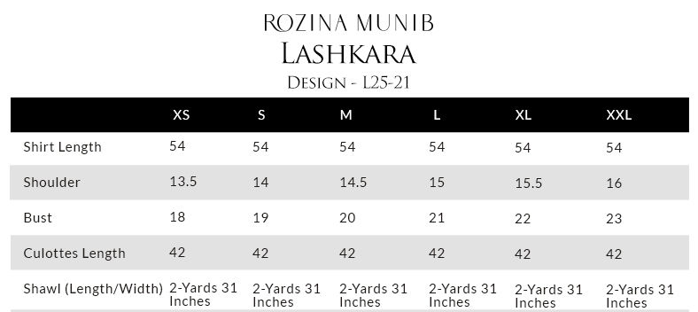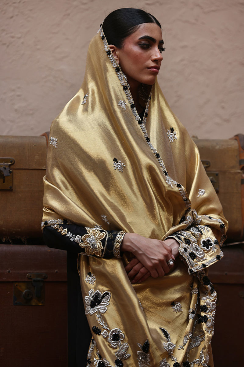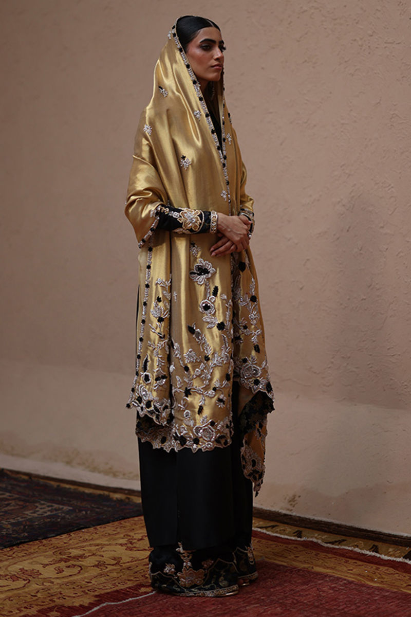The straight long shirt in black, crafted from pure 80gms raw silk, is adorned with silver and gold zari embroidery and enriched with heavy zardozi work featuring kora, dabka, cutdana, stones, pearls, nakshi and sequins along the back and sleeves. It is paired with cotton charmeuse culottes detailed with silver and gold zari embroidery, zardozi work and a rich banarsi border for a touch of tradition, while a lame shawl in Rich Gold completes the look with exquisite silver and black zari embroidery and heavy zardozi accents, creating a truly regal finish.