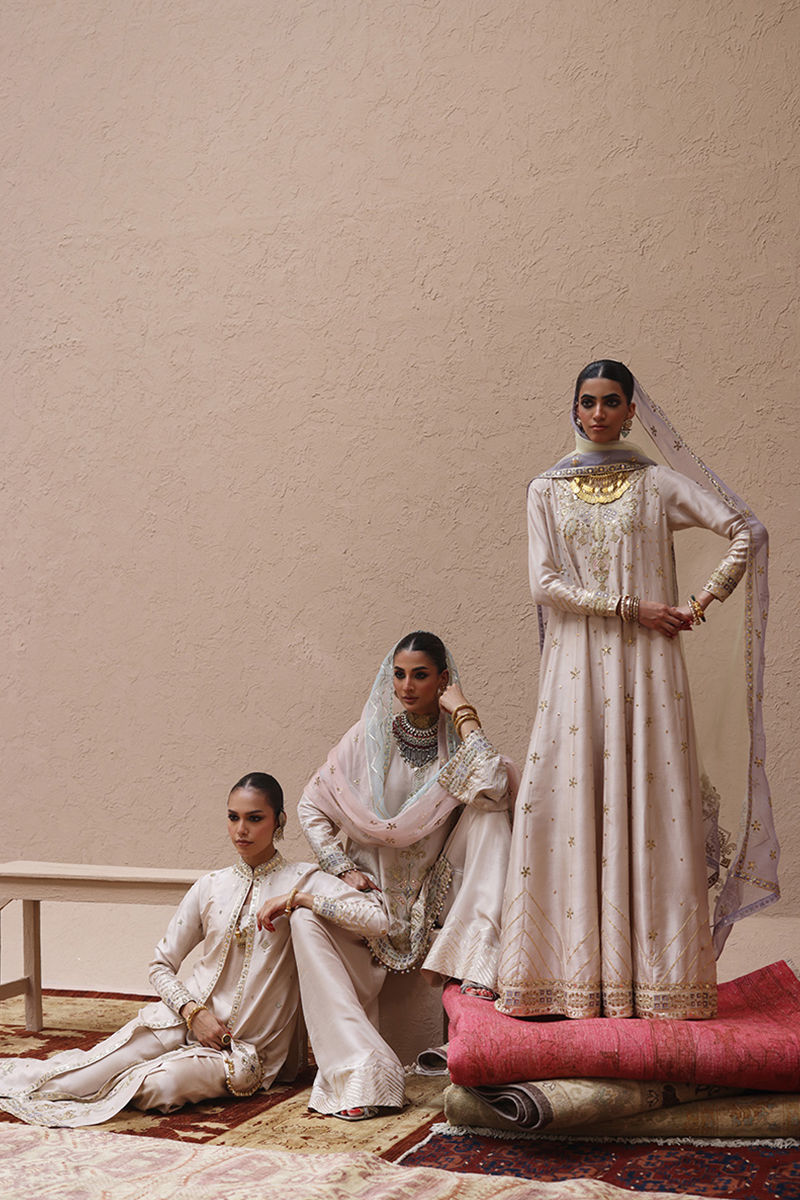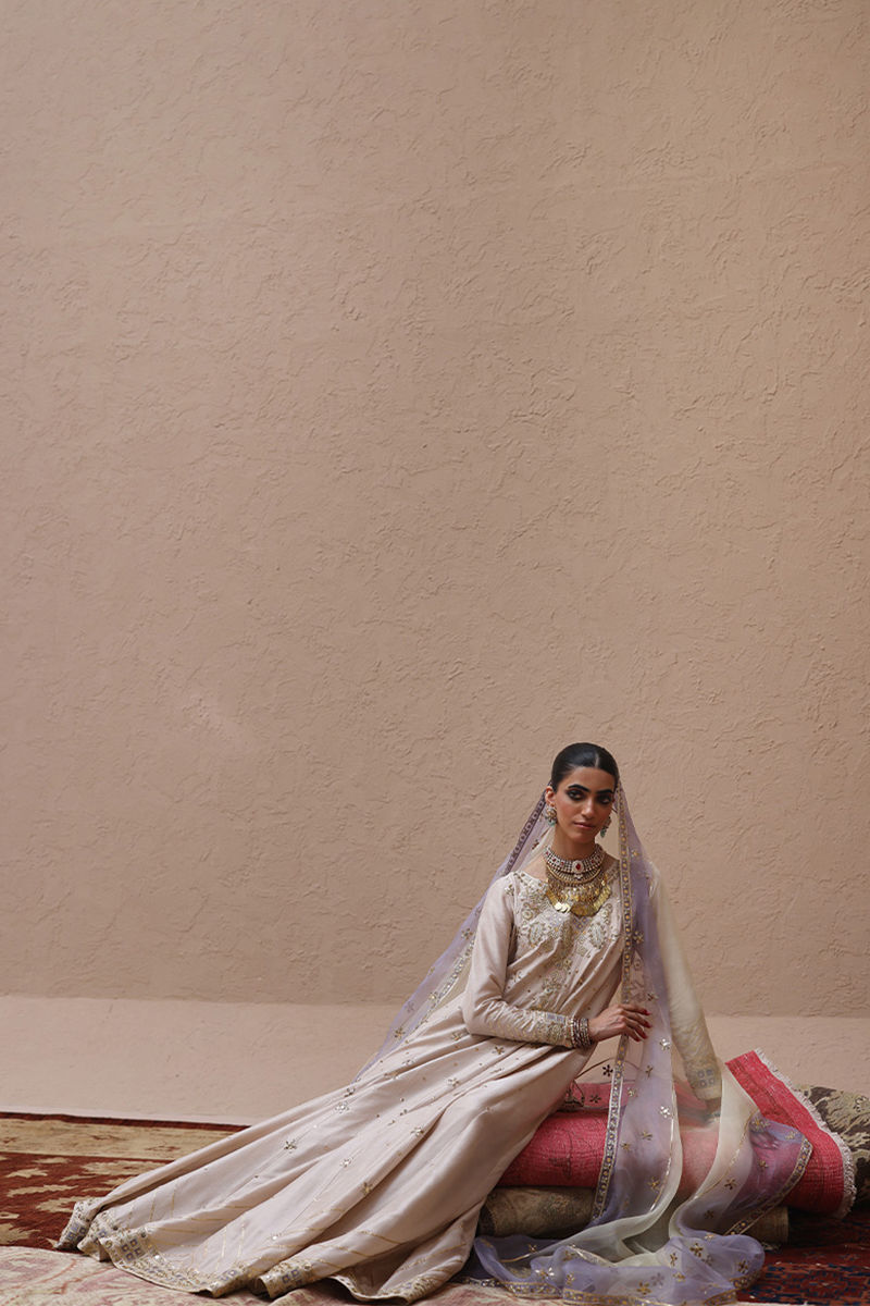 The kalidaar in Seed Pearls color, crafted from pure 80gms raw silk, is adorned with gold gota work, zari embroidery, and colored appliqué. Exquisite zardozi detailing with kora, dabka, cutdana, stones, pearls, nakshi, and sequins graces the front, sleeves, and back, while handmade tassels add a delicate finishing touch. It is paired with cotton charmeuse pants and completed with a pure organza dupatta featuring a four-sided border and all-over embroidery in gota, zari, and sequins for a timelessly elegant look.