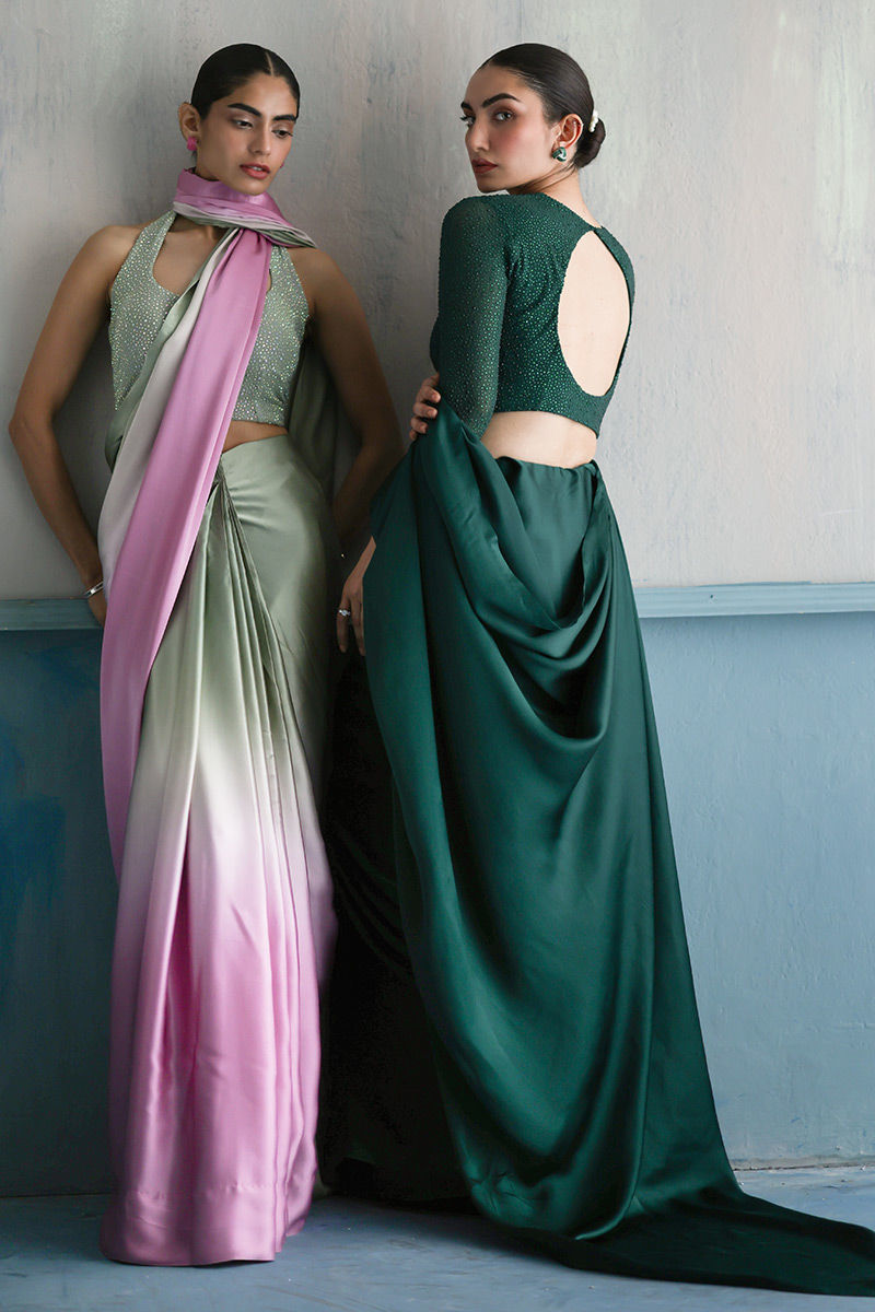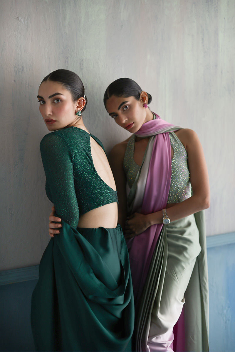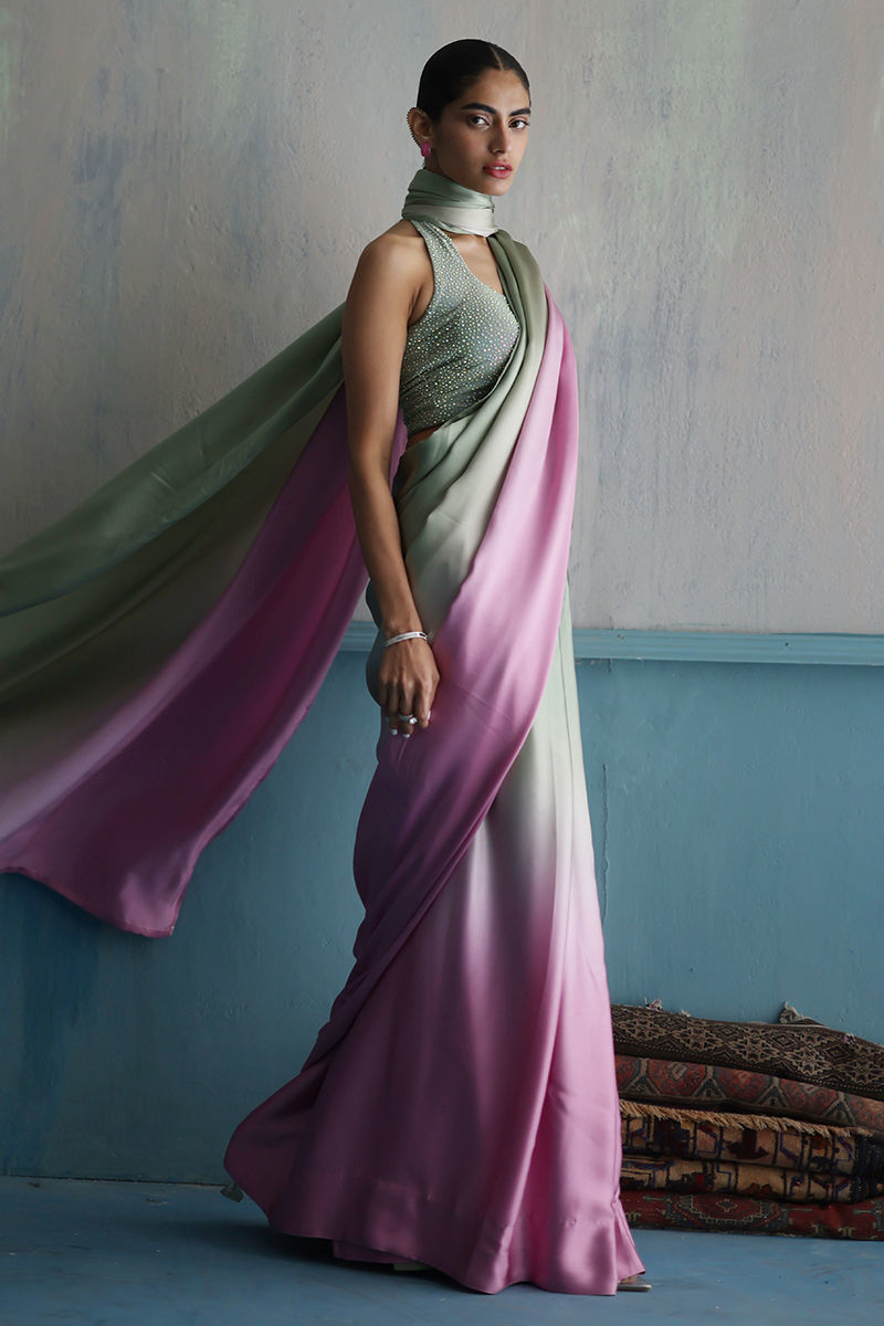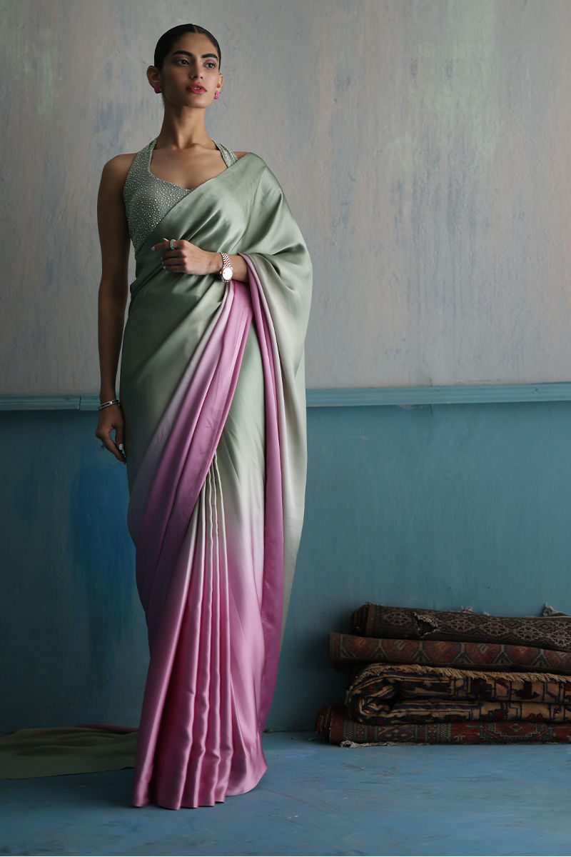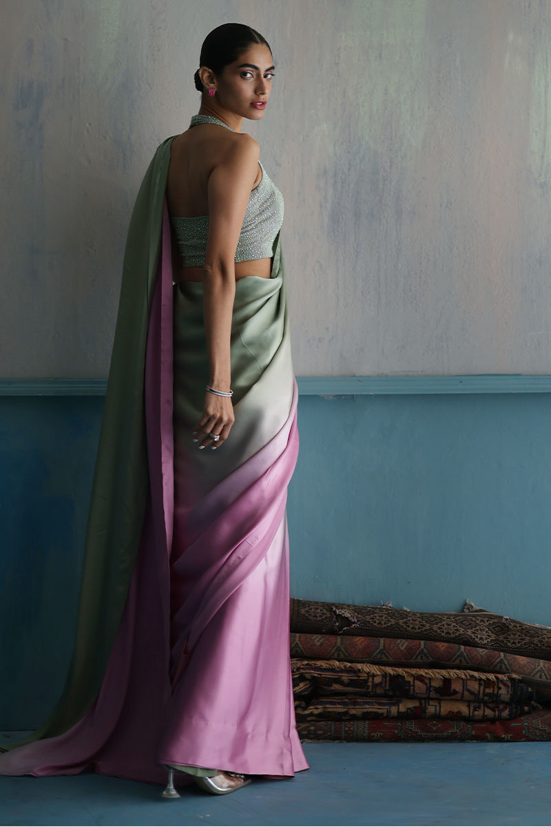 Crafted from the finest charmeuse silk, the "Orchid Mist Ombre Saree" gracefully drapes like a cascade of soft petals. The ombre effect, transitioning from a delicate orchid hue at the borders to a misty lavender at the pleats, mirrors the ever-changing hues of the sky at dawn. Complementing the saree's elegance is a Swarovski-studded blouse that shimmers like morning dew on orchid petals. The intricate placement of Swarovski crystals captures the play of light, making you the center of attention with every step. To make this ensemble uniquely yours, we offer complimentary sleeve additions to the blouse. Choose from various sleeve lengths and styles to suit your comfort and aesthetic preferences.