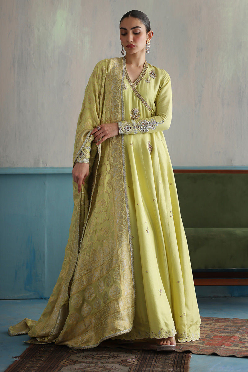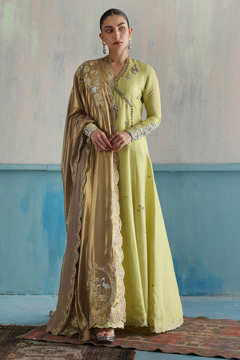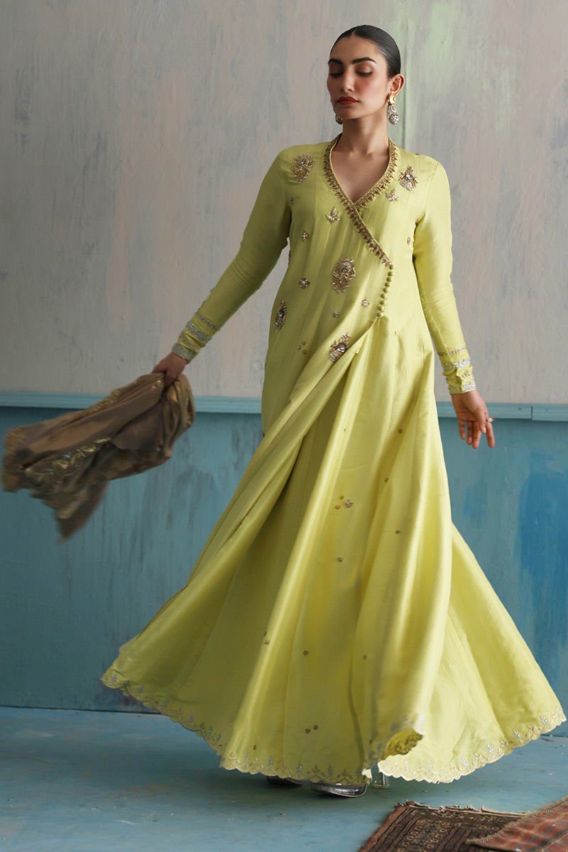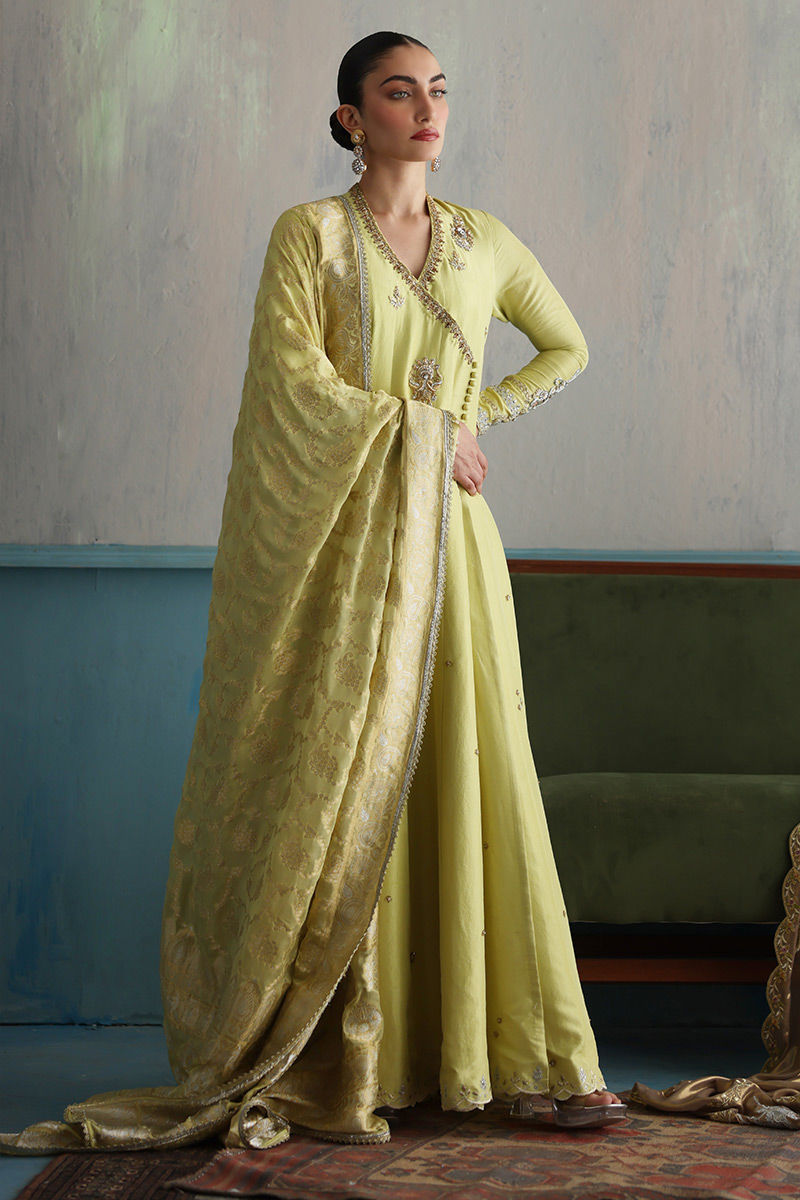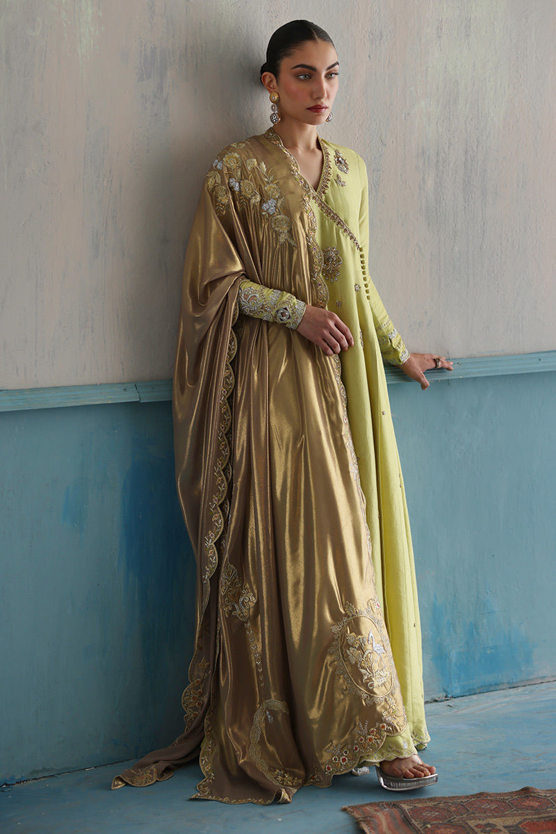 Immerse yourself in luxury with the "Radiant Lime Angrakha Kalidaar Shirt," meticulously handcrafted from pure 80 gms raw silk. The angrakha style and kalidaar silhouette bring a touch of regal grandeur. Adorned in a captivating lime hue, the shirt is a canvas for the intricate zardozi work of naqshi, dabka, kora, zari, sitara, and stones. The ensemble is completed with shimmery silk straight pants or you can also choose pure rawsilk pants. Complement your ensemble with the pure banarsi dupatta. Its timeless charm and intricate motifs add depth to your outfit, seamlessly marrying tradition with contemporary style or you can also style it with the chiffon lame dupatta in antique gold. Embroidered with zari, resham, and zardozi work, it exudes a sense of luxury and adds a touch of vintage elegance to your ensemble. length 56 to 58