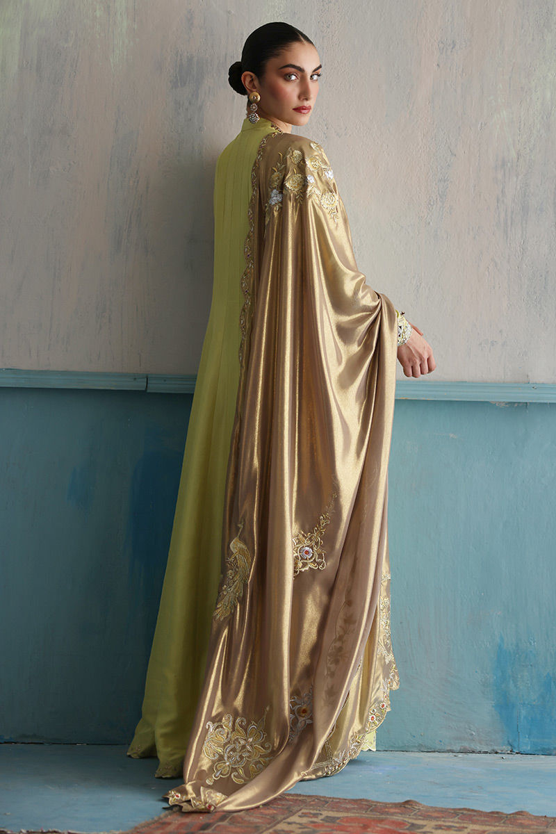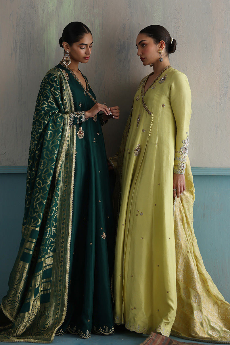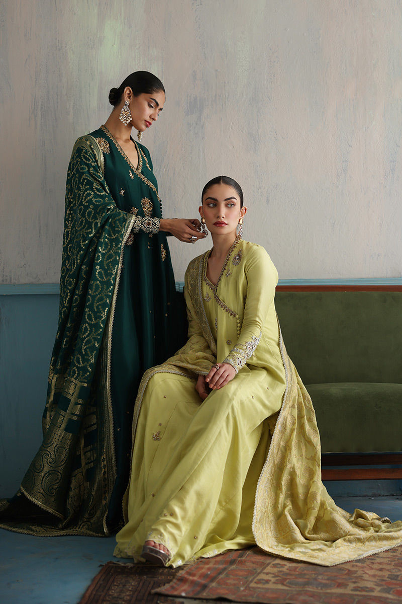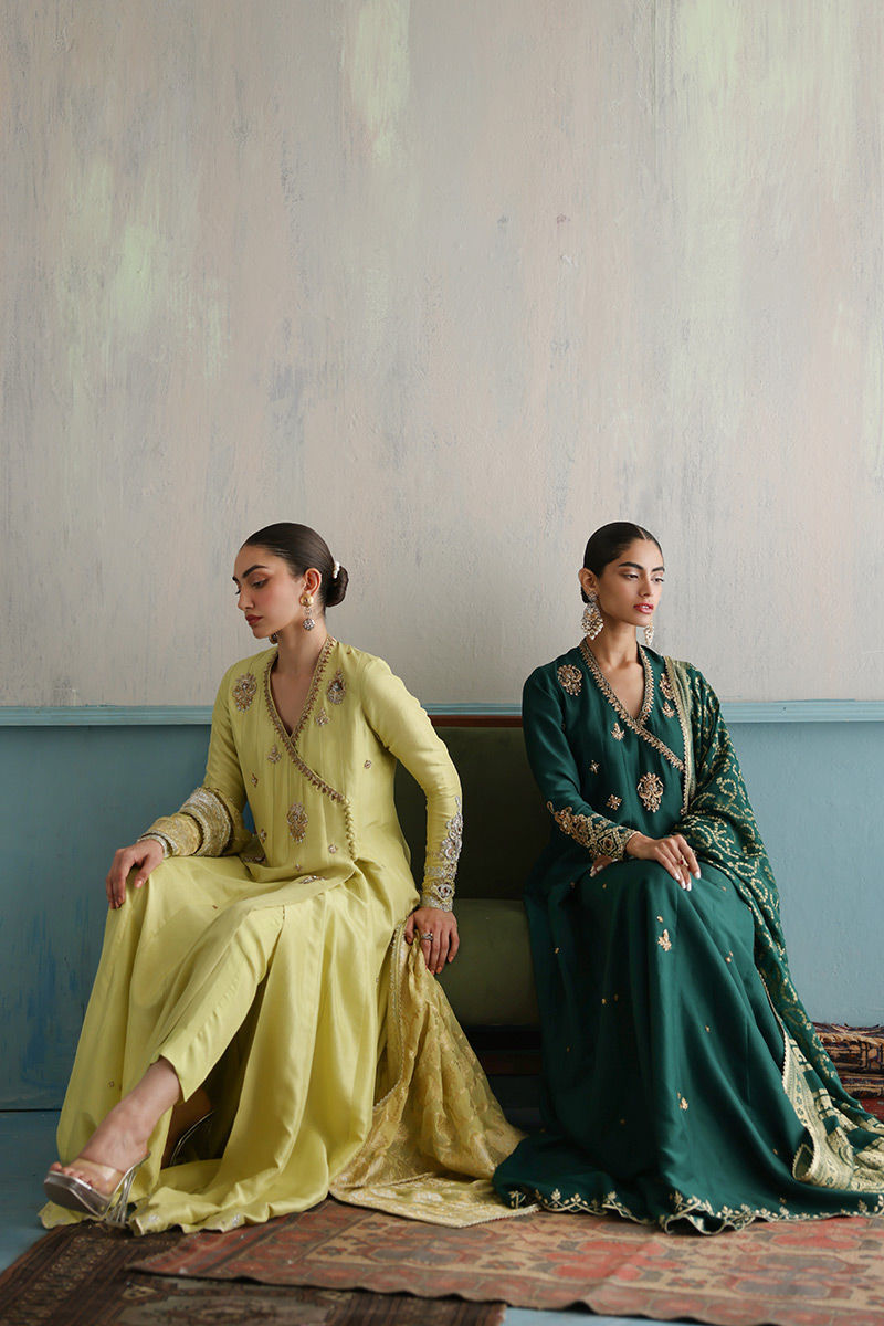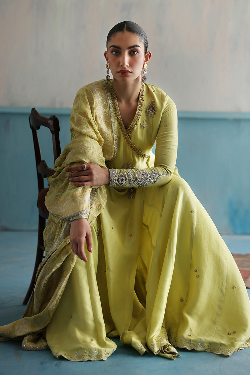 Immerse yourself in luxury with the "Radiant Lime Angrakha Kalidaar Shirt," meticulously handcrafted from pure 80 gms raw silk. The angrakha style and kalidaar silhouette bring a touch of regal grandeur. Adorned in a captivating lime hue, the shirt is a canvas for the intricate zardozi work of naqshi, dabka, kora, zari, sitara, and stones. The ensemble is completed with shimmery silk straight pants or you can also choose pure rawsilk pants. Complement your ensemble with the pure banarsi dupatta. Its timeless charm and intricate motifs add depth to your outfit, seamlessly marrying tradition with contemporary style or you can also style it with the chiffon lame dupatta in antique gold. Embroidered with zari, resham, and zardozi work, it exudes a sense of luxury and adds a touch of vintage elegance to your ensemble. length 56 to 58