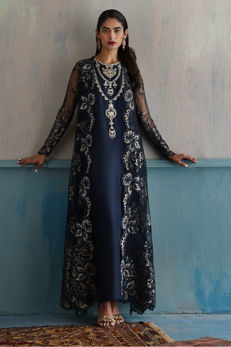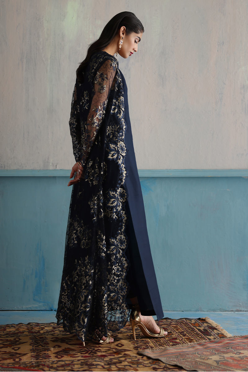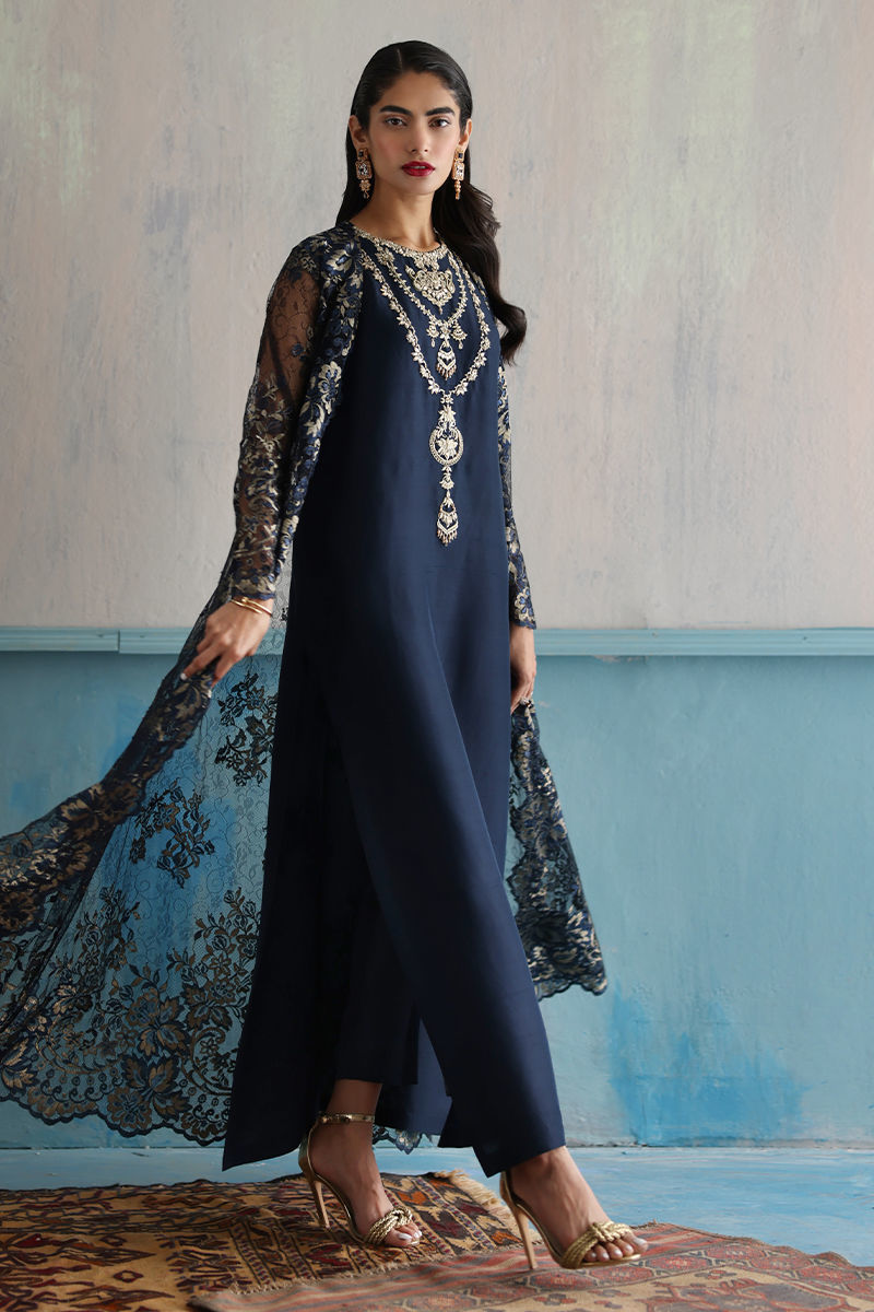 The "Ethereal Phantom Blue Chentley Jacket Ensemble" encapsulates the essence of enchanting allure and contemporary elegance. The outer layer, in a captivating phantom blue chentley fabric, exudes an otherworldly charm. The inner layer, crafted from pure 80 gms raw silk, adds a touch of opulence. The jacket features intricate handwork along the neckline, embellished with dabka, naqshi, Kundan, and tiki stones. This handwork, carefully curated, lends an air of intricate artistry to the ensemble. Complementing the jacket is a pair of shimmer silk straight pants. The shimmer adds a contemporary touch to the ensemble, harmonizing seamlessly with the overall sophistication. length 53 to 55