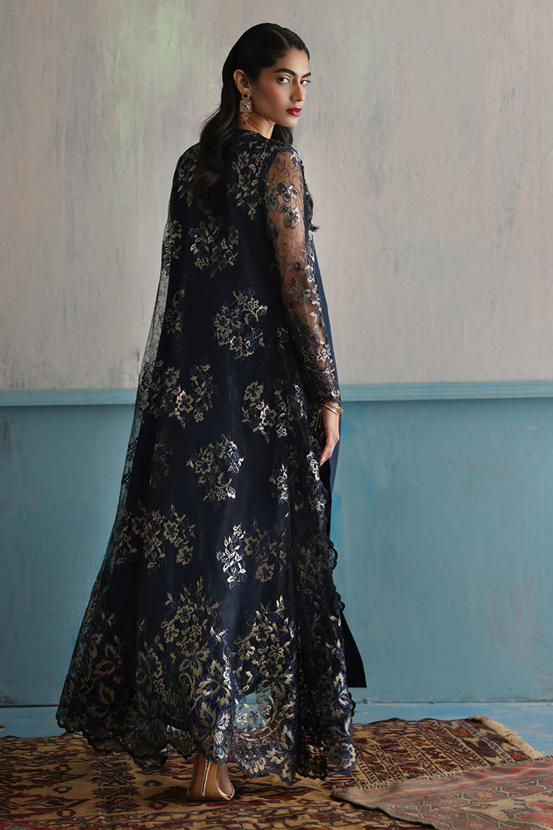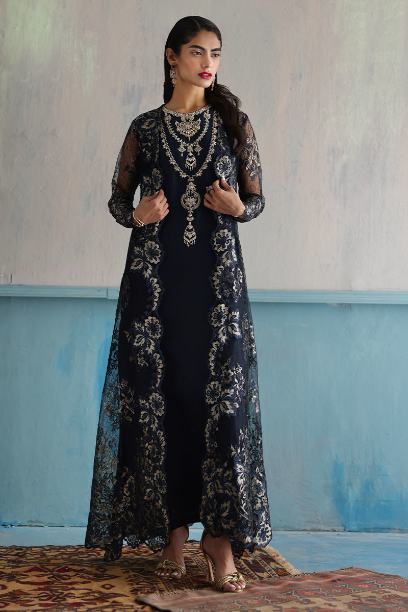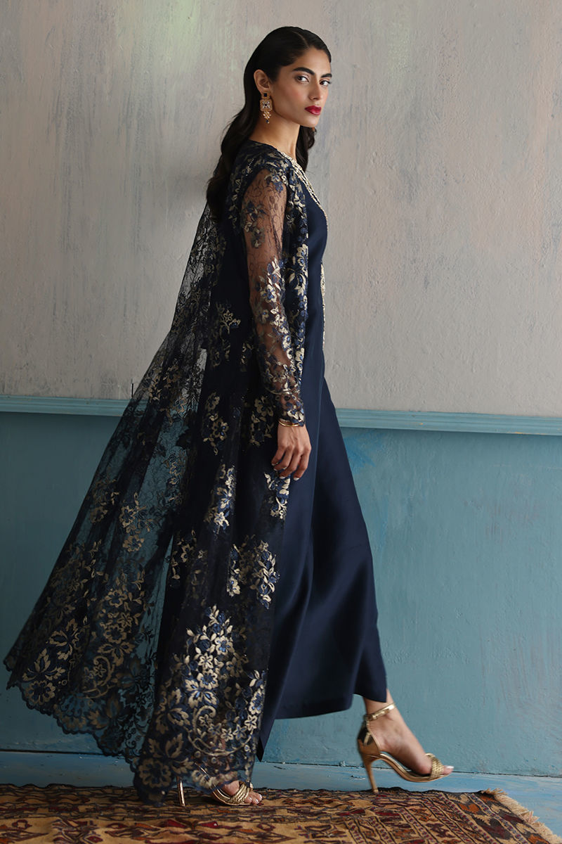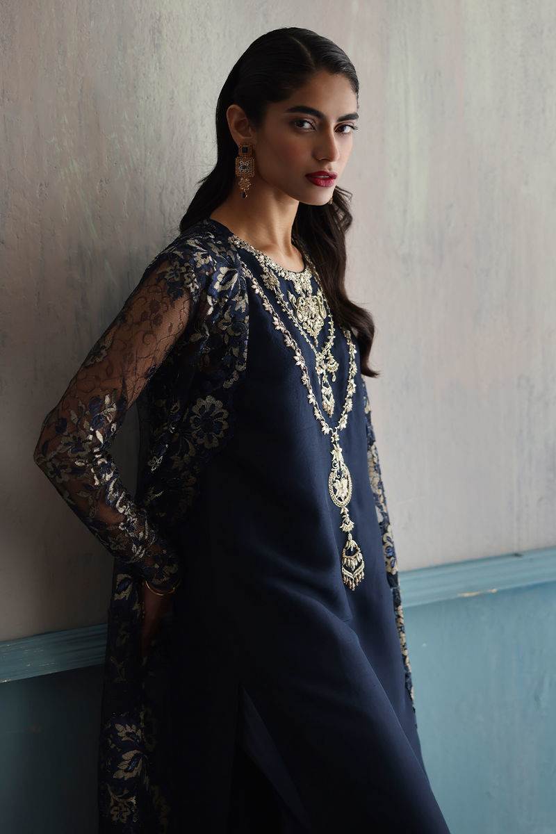 The "Ethereal Phantom Blue Chentley Jacket Ensemble" encapsulates the essence of enchanting allure and contemporary elegance. The outer layer, in a captivating phantom blue chentley fabric, exudes an otherworldly charm. The inner layer, crafted from pure 80 gms raw silk, adds a touch of opulence. The jacket features intricate handwork along the neckline, embellished with dabka, naqshi, Kundan, and tiki stones. This handwork, carefully curated, lends an air of intricate artistry to the ensemble. Complementing the jacket is a pair of shimmer silk straight pants. The shimmer adds a contemporary touch to the ensemble, harmonizing seamlessly with the overall sophistication. length 53 to 55