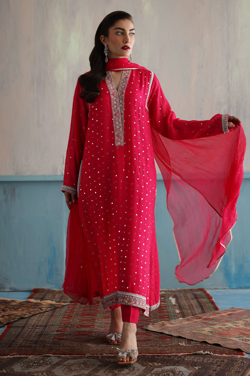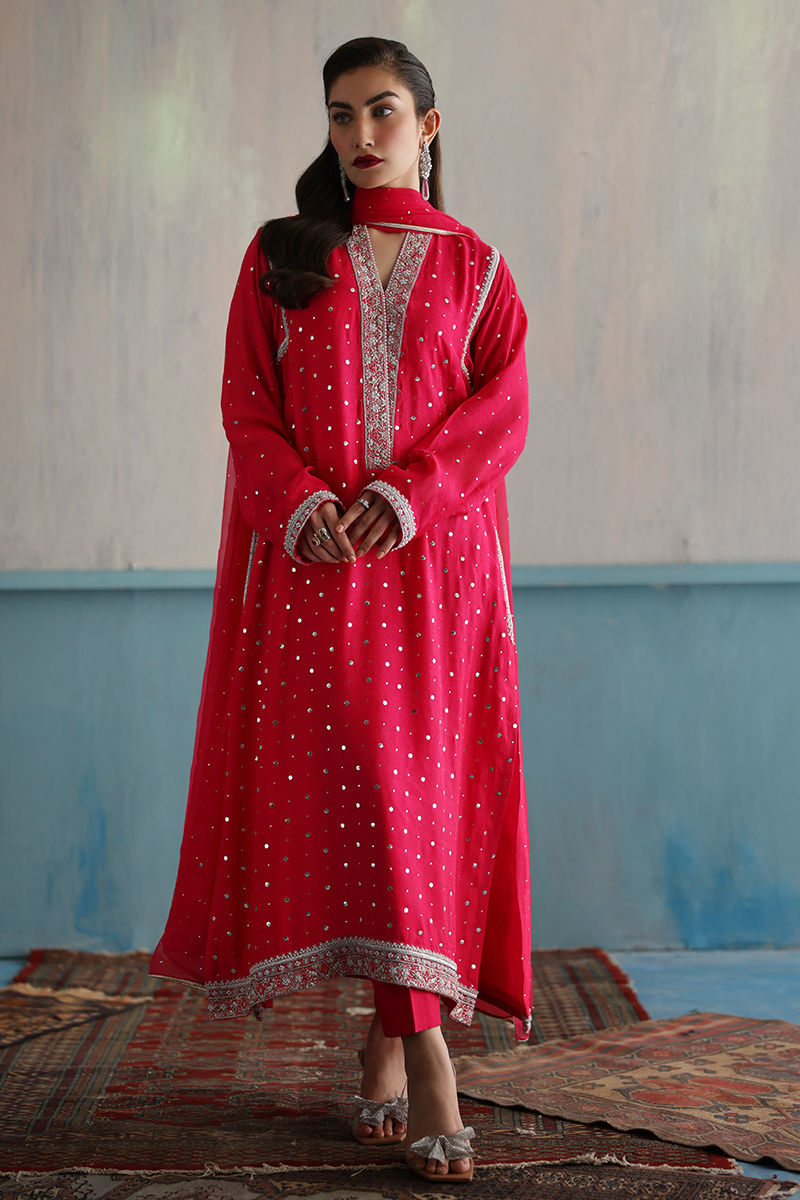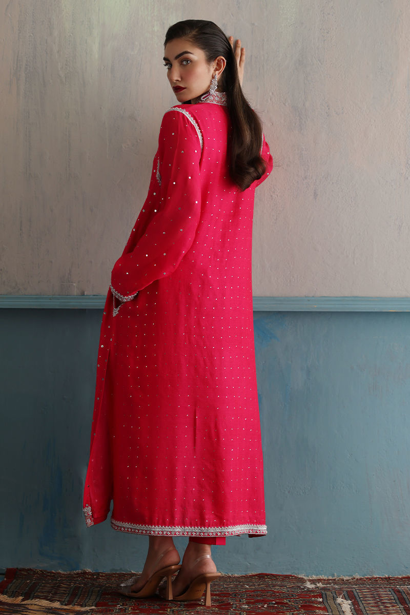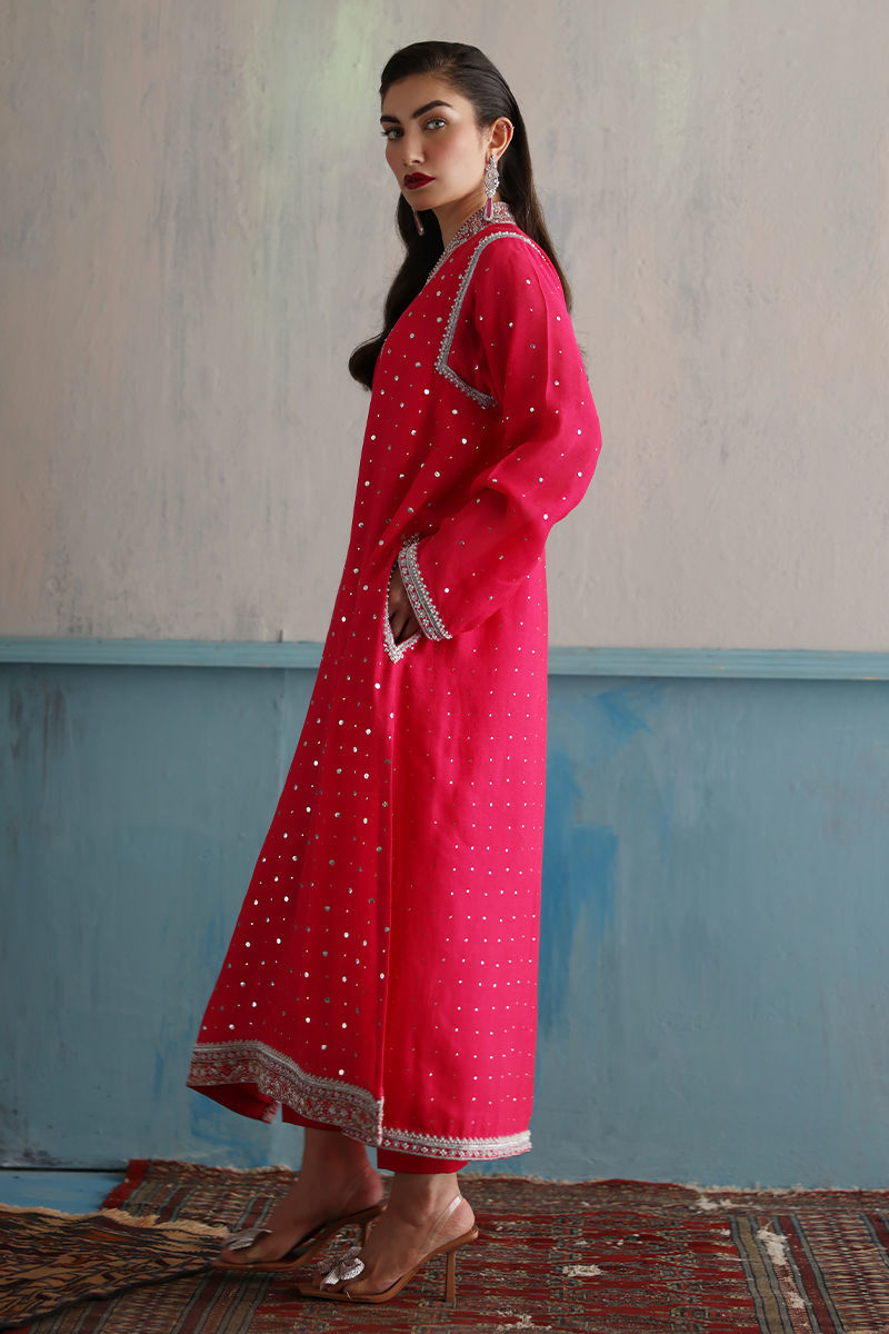 The "Elegance in Virtual Pink Khaadi Ensemble" captures the essence of refined luxury and contemporary grace. The ethereal virtual pink hue envelops you in an air of delicacy. The shirt features intricate handwork on the front, back, and sleeves, adorned with kamdani and Mukesh. The neckline, sleeves border, daman front and back, armholes, and pockets are beautifully adorned with pure handwork zardozi of tilla, kora, dabka, nakshi, pearls, and sequins. Complementing the shirt is a pair of pure raw silk straight pants. The pants maintain clean lines, allowing the focus to remain on the opulent handwork of the shirt. Complete your ensemble with the pure chiffon dupatta, adorned with all-over handwork of Mukesh and kamdani. The four-side gota lace edging adds a touch of traditional elegance to the ensemble.