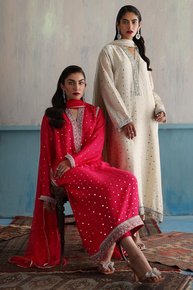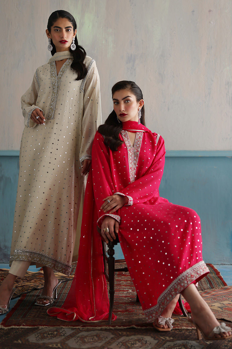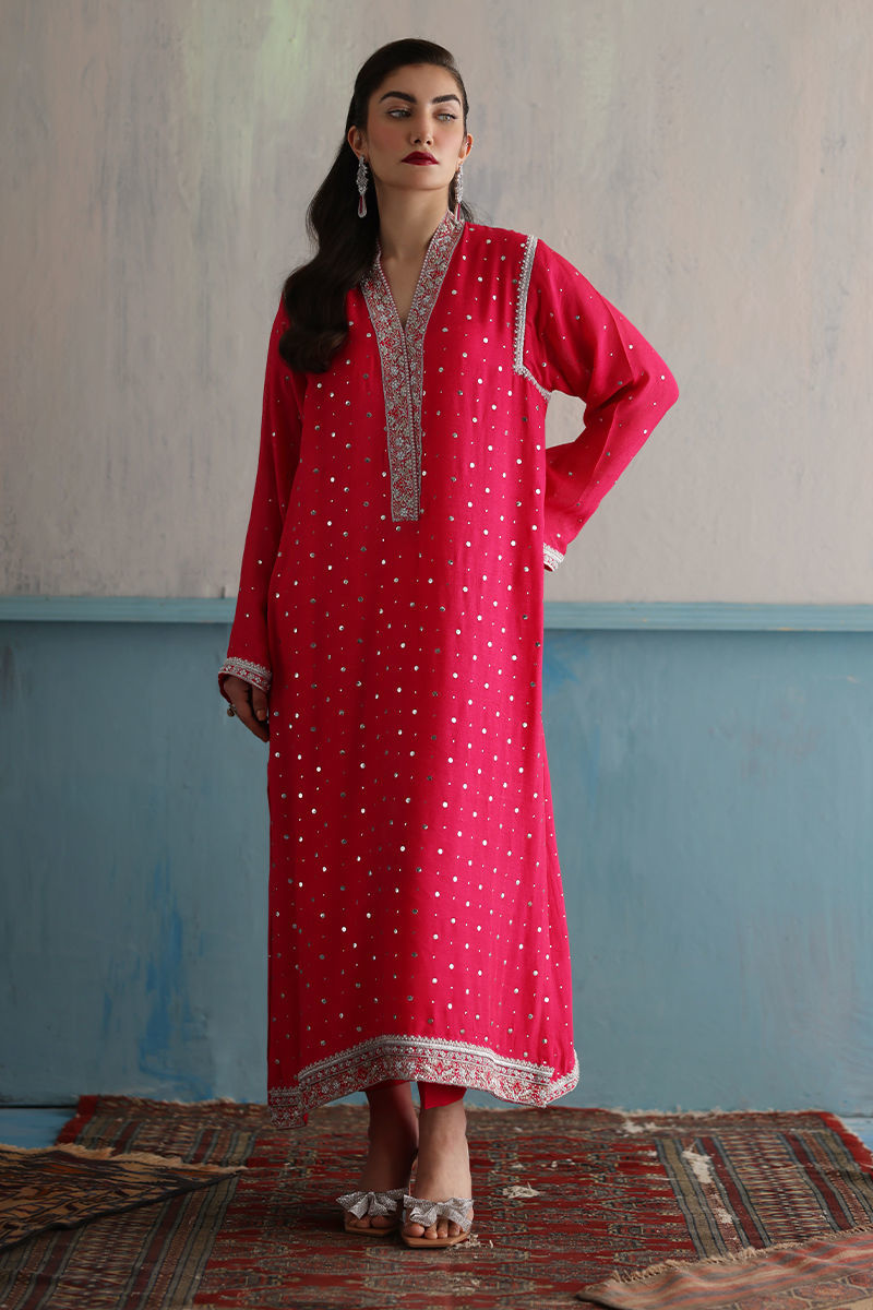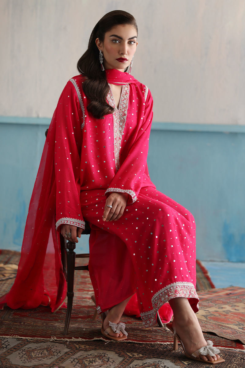 The "Elegance in Virtual Pink Khaadi Ensemble" captures the essence of refined luxury and contemporary grace. The ethereal virtual pink hue envelops you in an air of delicacy. The shirt features intricate handwork on the front, back, and sleeves, adorned with kamdani and Mukesh. The neckline, sleeves border, daman front and back, armholes, and pockets are beautifully adorned with pure handwork zardozi of tilla, kora, dabka, nakshi, pearls, and sequins. Complementing the shirt is a pair of pure raw silk straight pants. The pants maintain clean lines, allowing the focus to remain on the opulent handwork of the shirt. Complete your ensemble with the pure chiffon dupatta, adorned with all-over handwork of Mukesh and kamdani. The four-side gota lace edging adds a touch of traditional elegance to the ensemble.