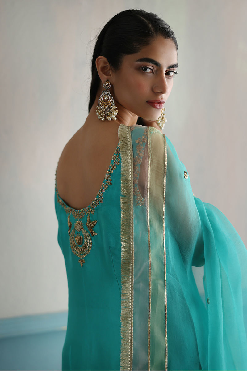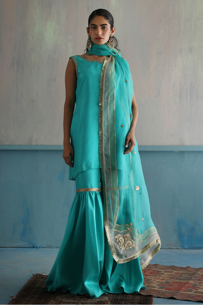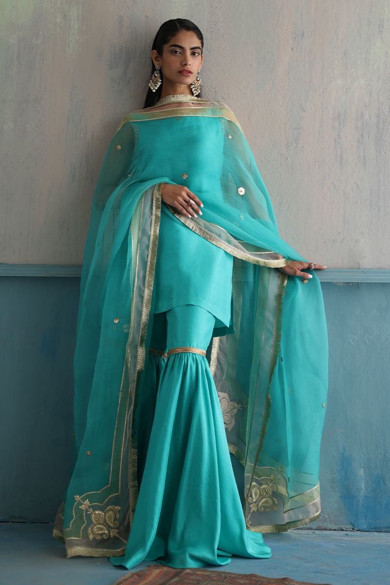 Step into a realm of timeless charm with our "Regal Elegance Color Block Ensemble meticulously tailored from pure 80 gms raw silk. The neckline, both at the front and back, is adorned with intricate zari and zardozi embroidery, adding a touch of regal charm. The option to add complimentary sleeves ensures versatile styling. Complementing the shirt is a pure rawsilk gharara, embellished with gota for a touch of traditional allure. The gharara, with a length of 44 inches, adds a graceful sway to your every step. Complete your ensemble with the pure organza color block dupatta. Embellished with gota Chan and gota motives on the corners, the dupatta exudes intricate beauty. The four-sided kiran lace adds a finishing touch of elegance. length 44