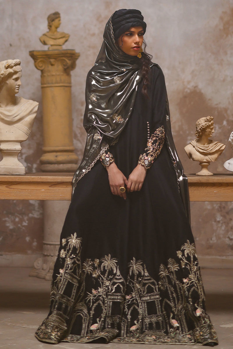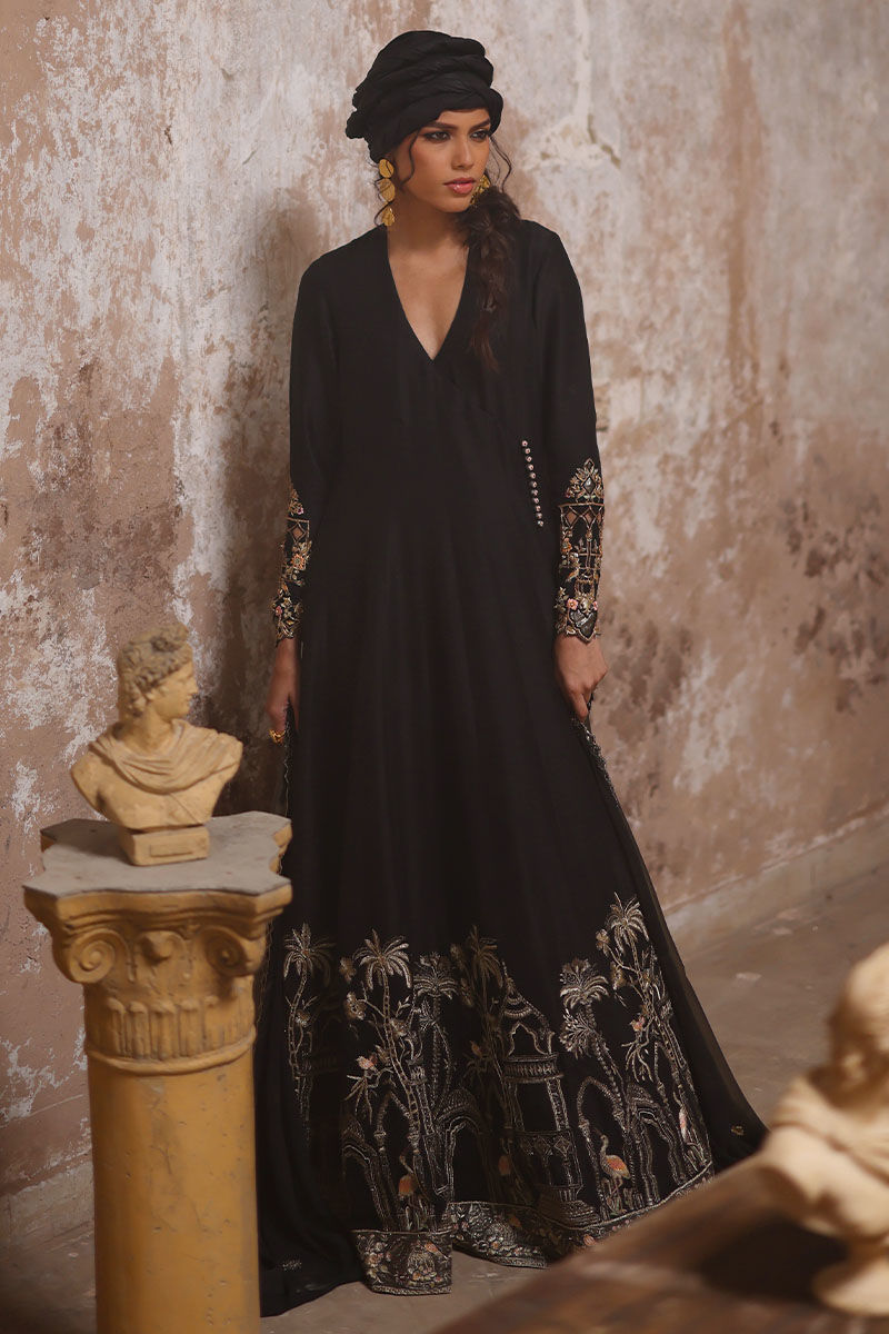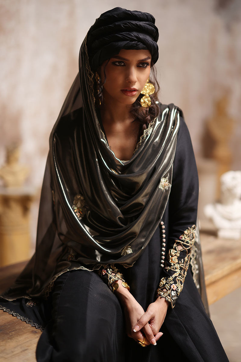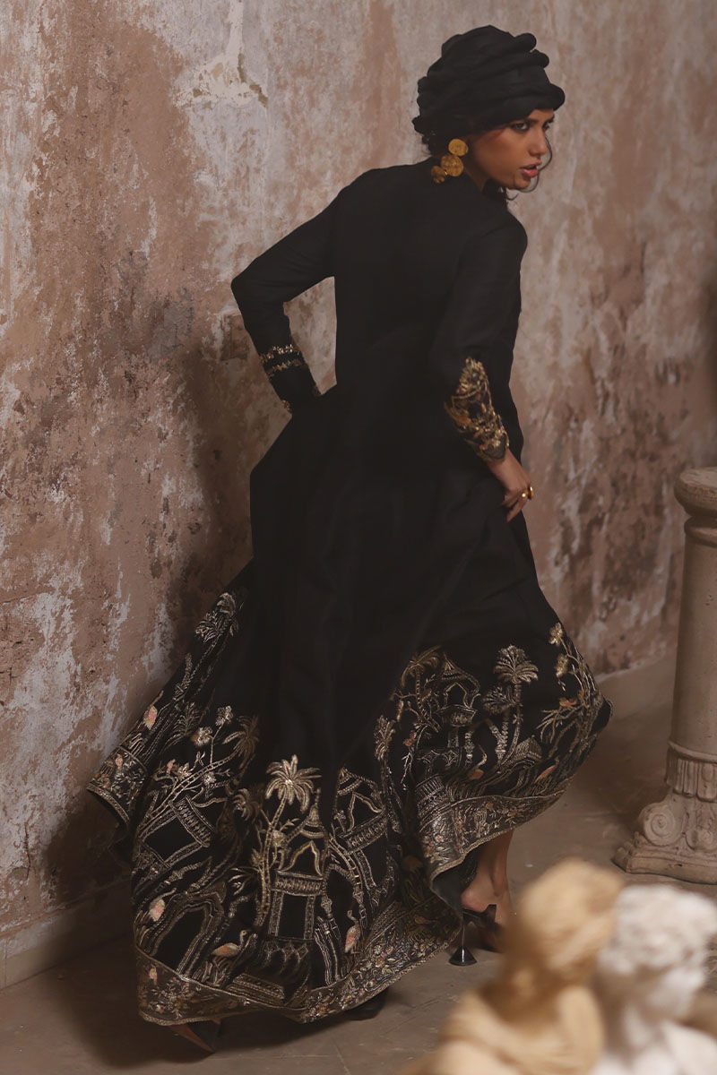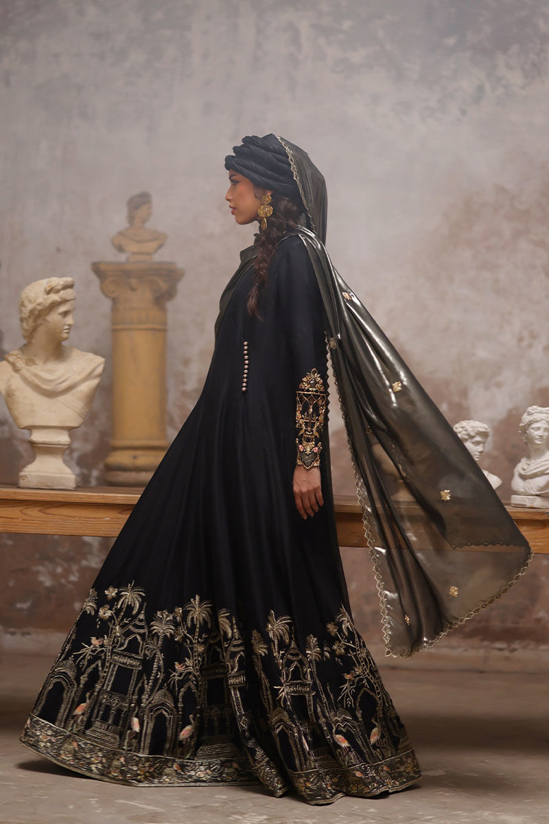 Experience regal elegance with our royal black angrakha kalidaar, crafted from pure raw silk, 80 gms. The outfit features intricate resham and zari embroidery on the daman, while the sleeves are adorned with fully hand worked zardozi, including kora dabka, nakshi, gota, tiki stones, pearls, cutdana, sequins, and resham, complete with cutwork detailing. Paired with semi-pure straight pants and a lame chiffon dupatta, beautifully finished with a four-sided zari embroidery border, cutwork, and booties enhanced with resham and zari embroidery, this ensemble exudes timeless luxury.