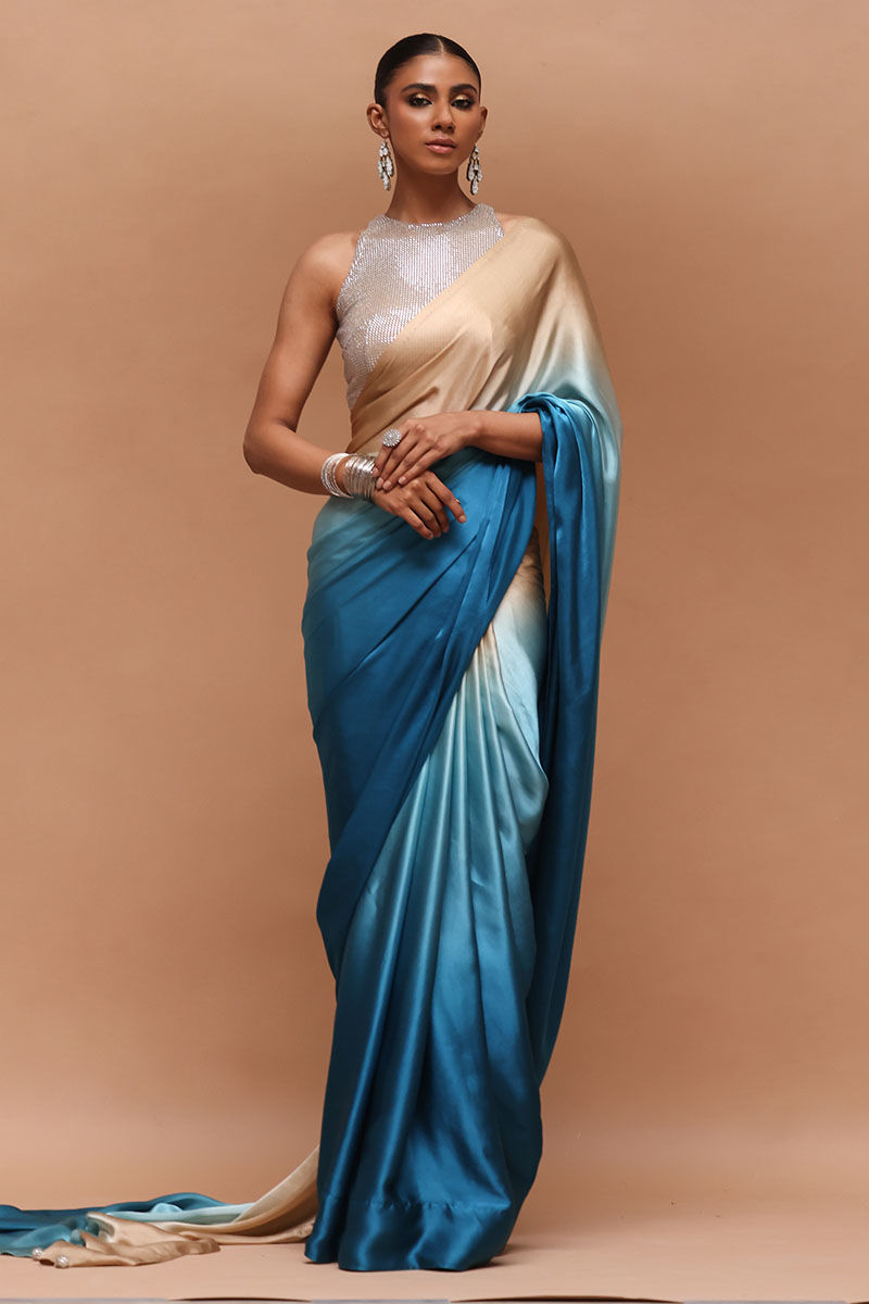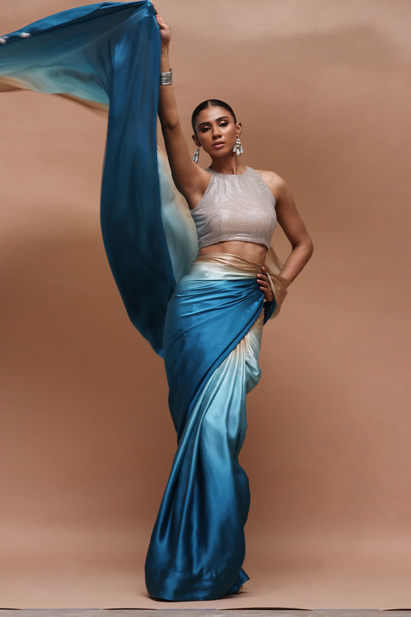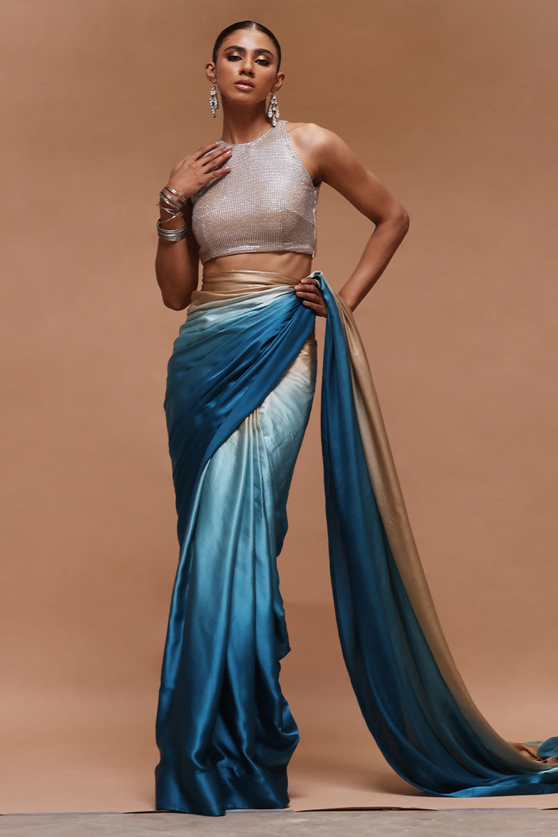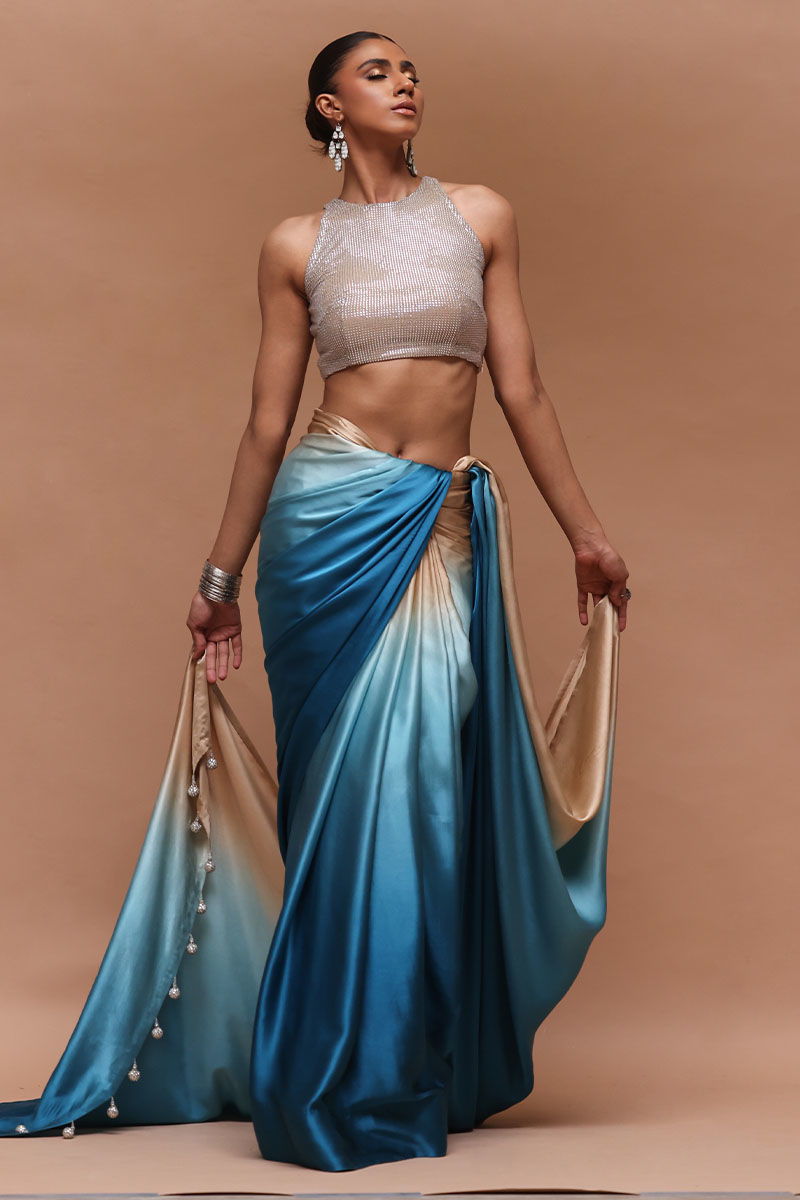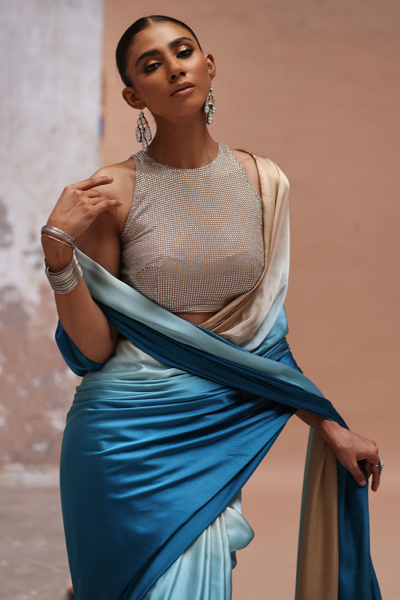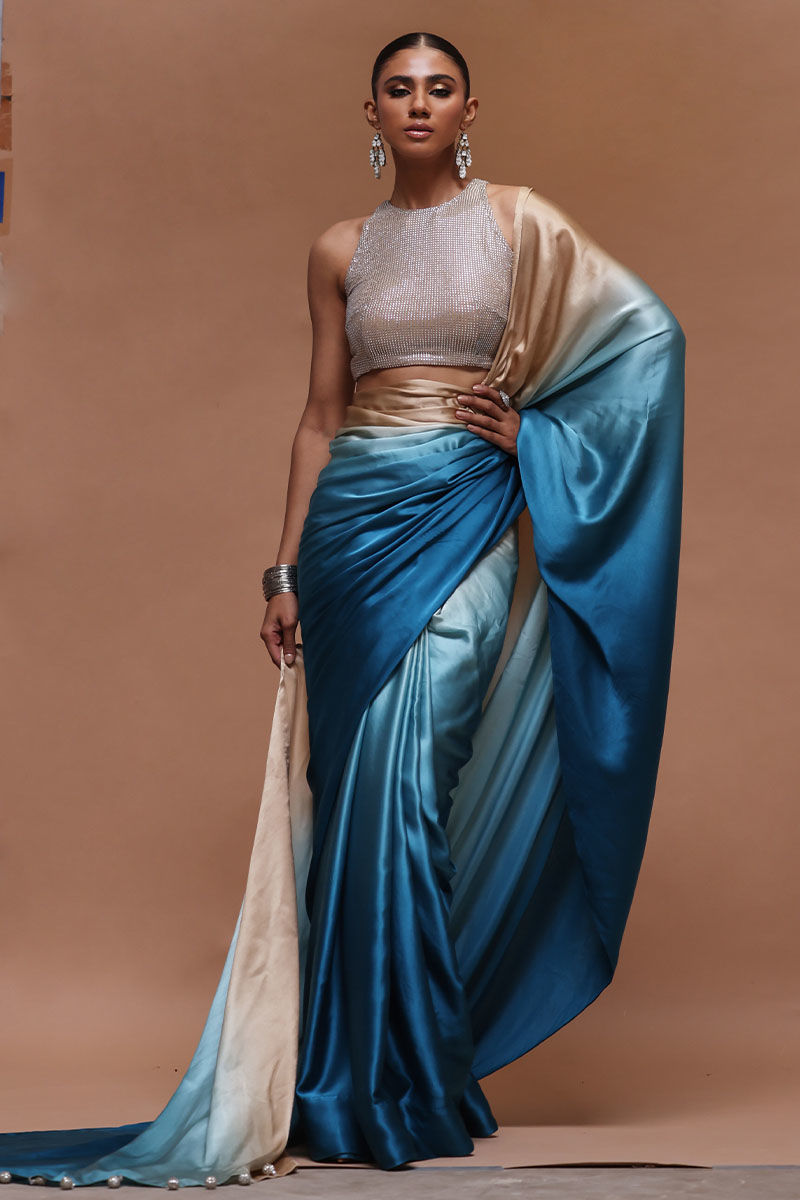 Indulge in luxury with our deep lake ombre saree, made from pure charmeuse silk, 60gms. This elegant saree is adorned with tiki stone and crystal ball tassels, offering a refined touch. It comes with your choice of a beige swarovski halter blouse or a beige Swarovski blouse with sleeves, perfectly complementing the saree's opulent design.