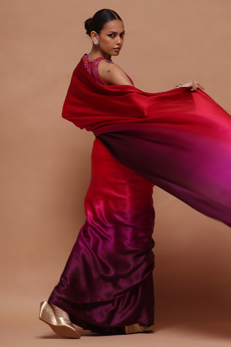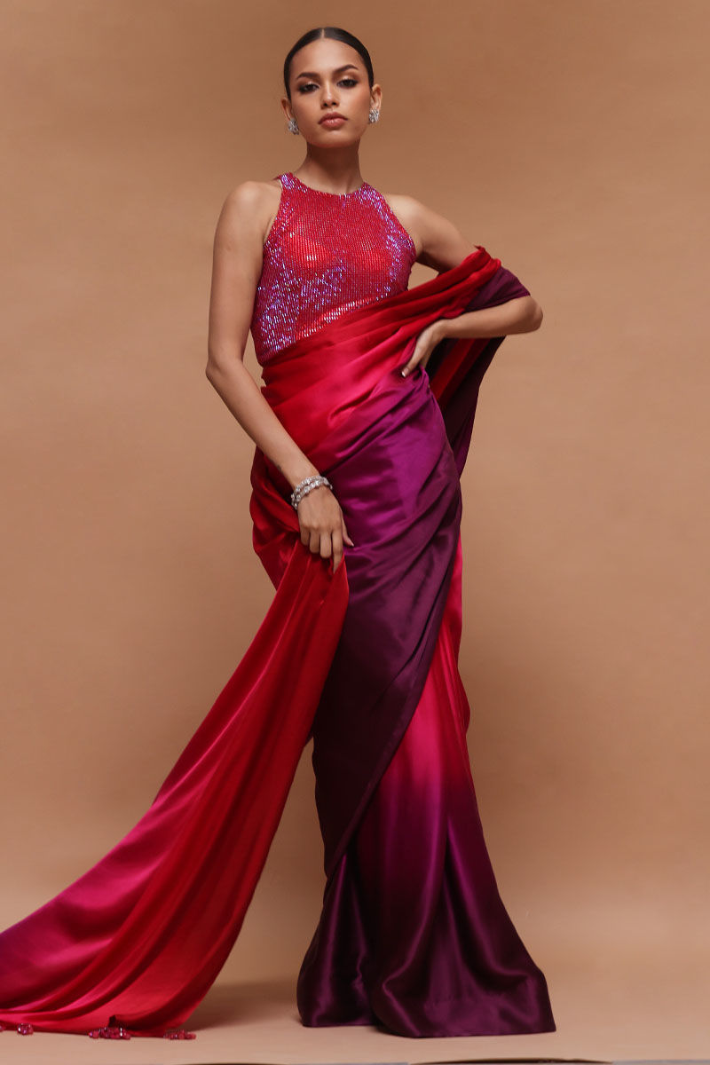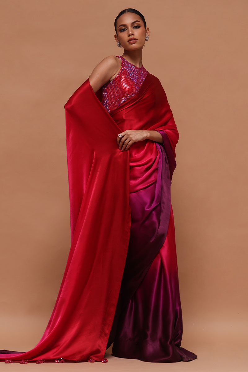 Elevate your elegance with our raspberry ombre saree, crafted from pure charmeuse silk, 60gms. The saree features exquisite crystal grape tassels, adding a luxurious detail to the design. Paired with your choice of a Swarovski halter blouse or a Swarovski blouse with sleeves, this ensemble offers timeless sophistication.