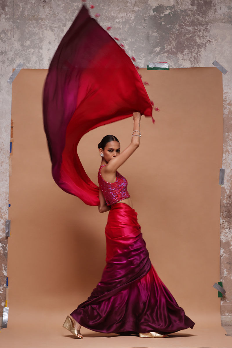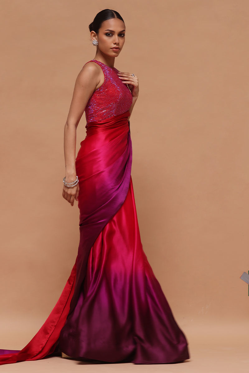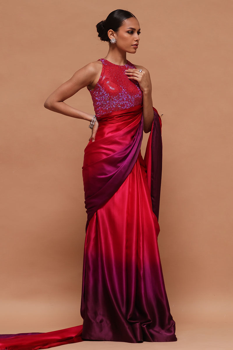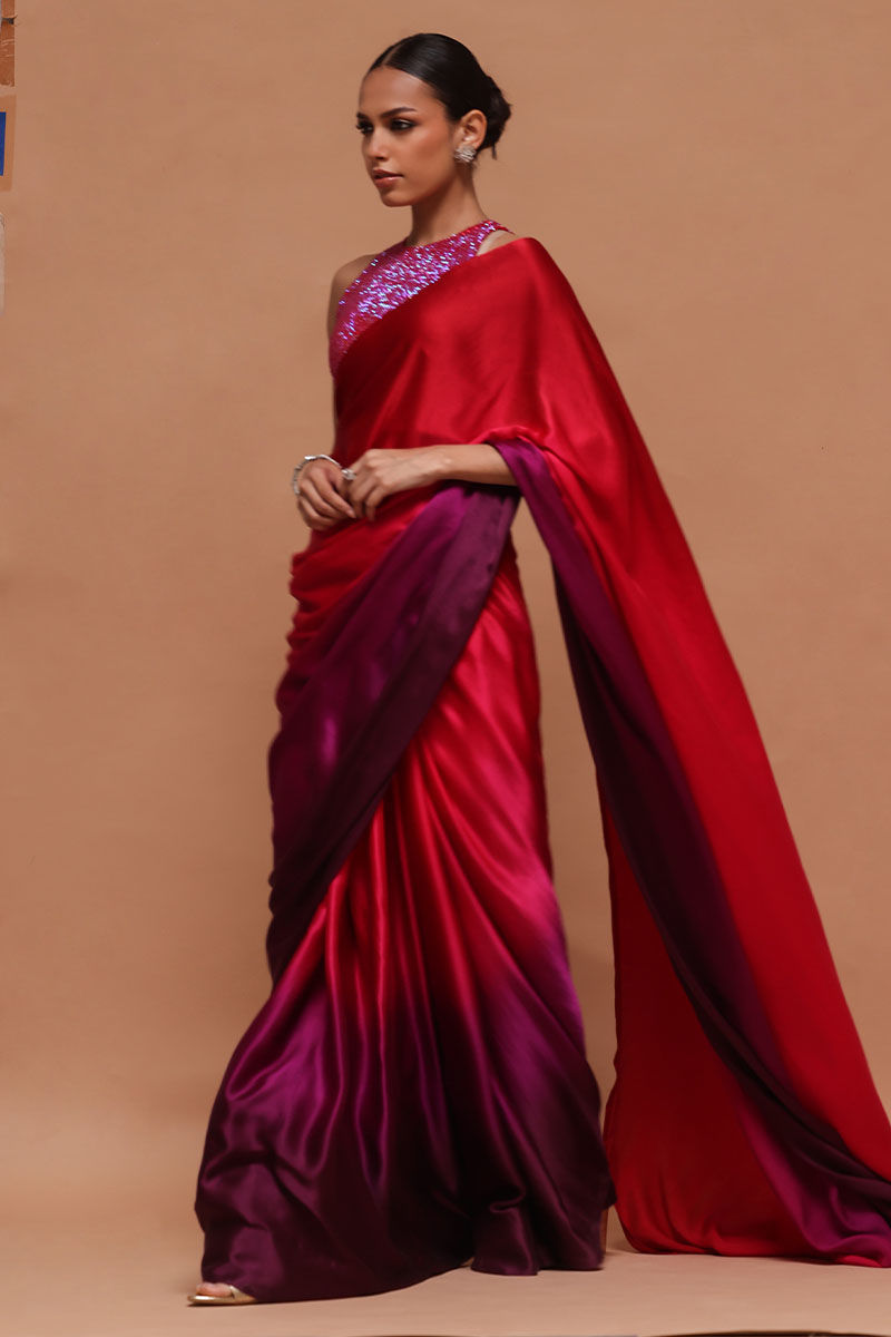 Elevate your elegance with our raspberry ombre saree, crafted from pure charmeuse silk, 60gms. The saree features exquisite crystal grape tassels, adding a luxurious detail to the design. Paired with your choice of a Swarovski halter blouse or a Swarovski blouse with sleeves, this ensemble offers timeless sophistication.