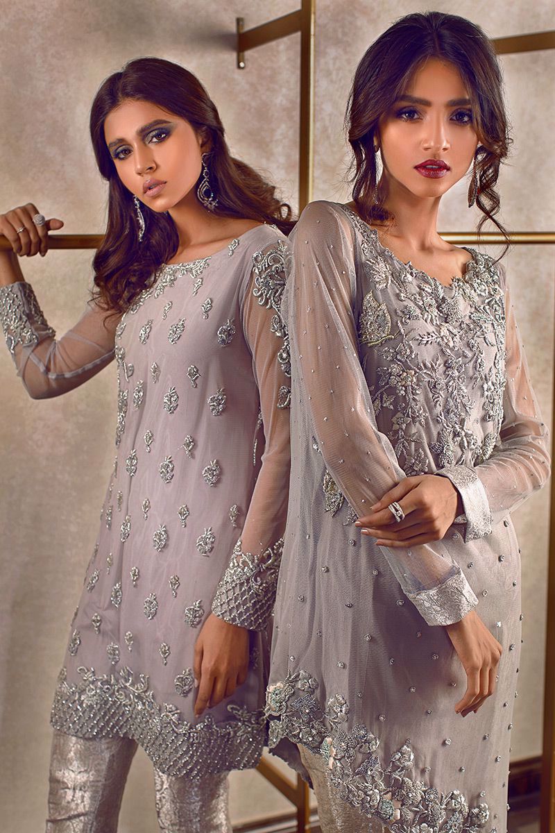 Lavender asymmetrical net is intricately worked with Tila, Resham, Dabka, Naqshi, Swarovski and Crystals. This outfit is completed with bootleg of the fabric Kamkhaab.