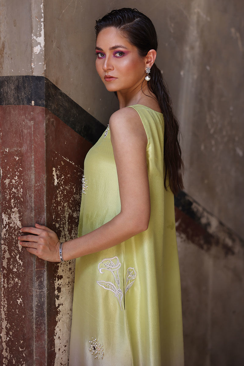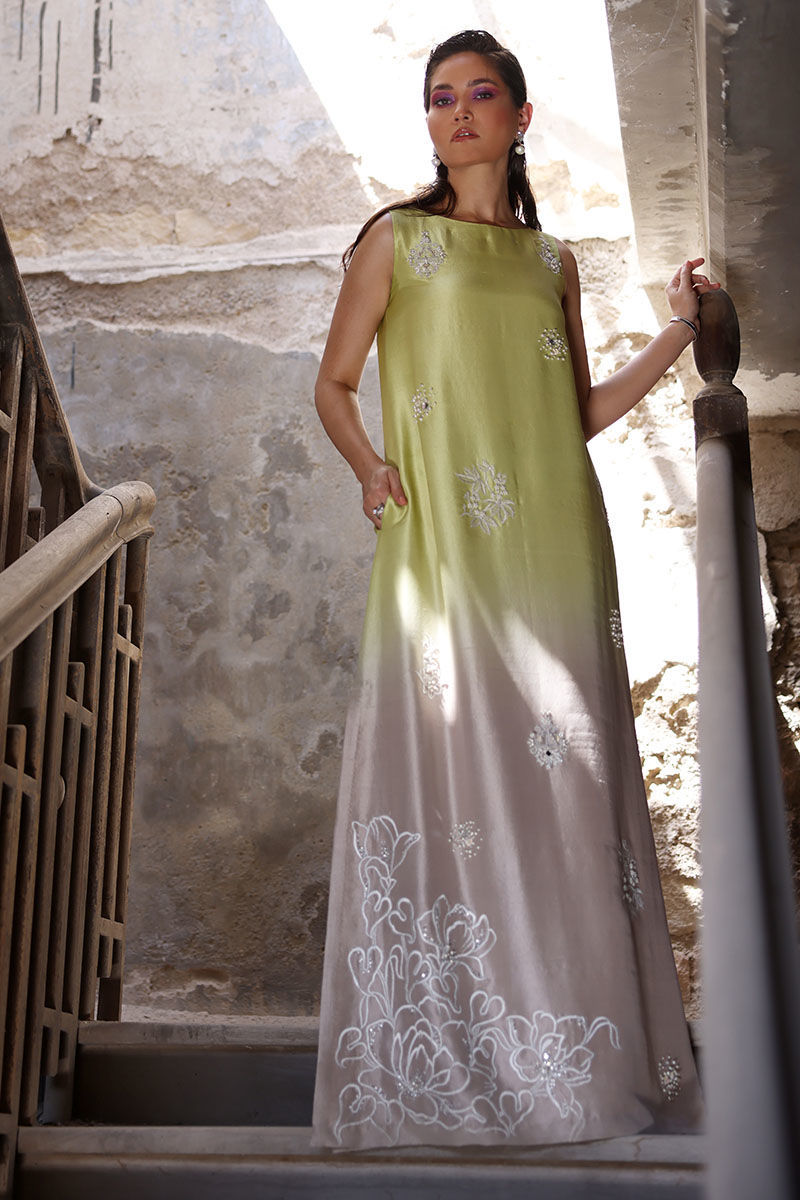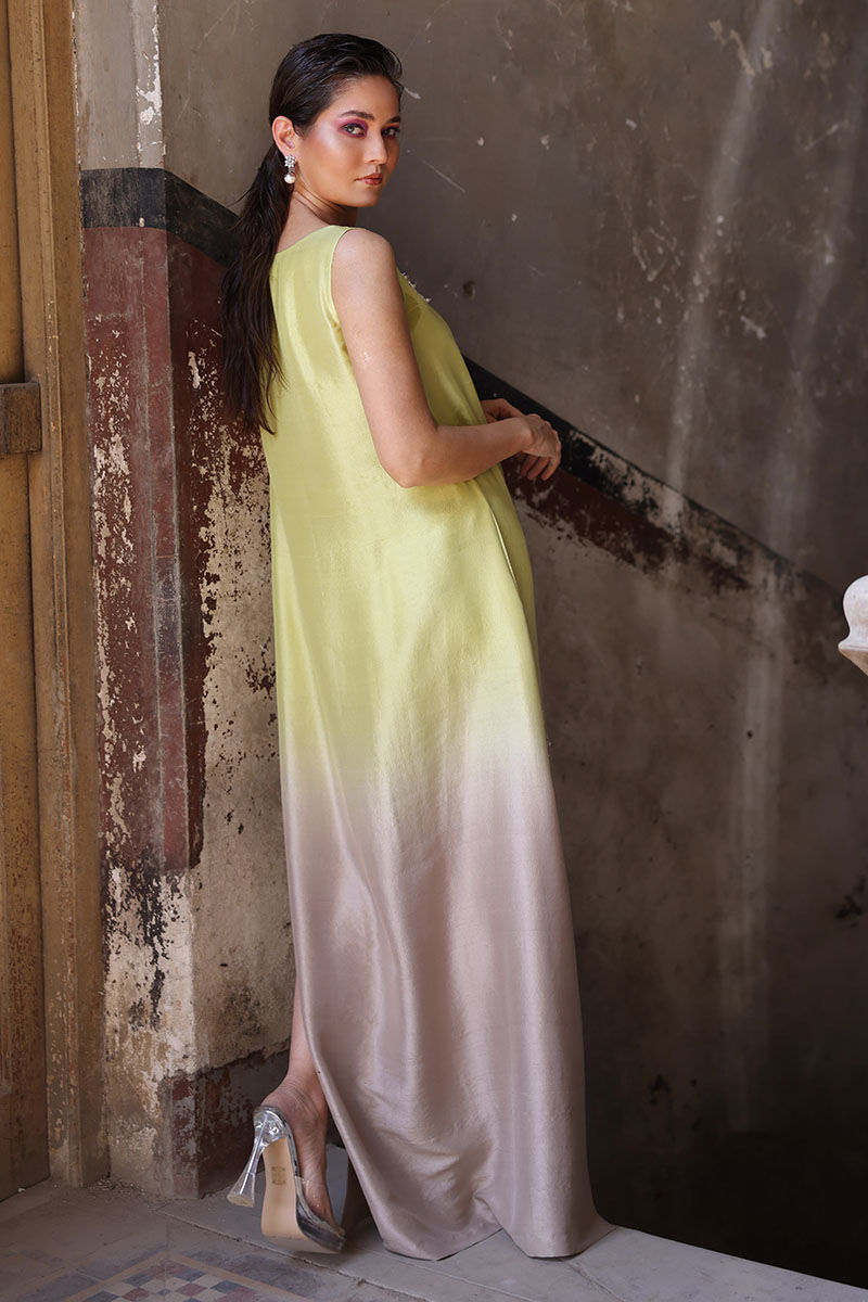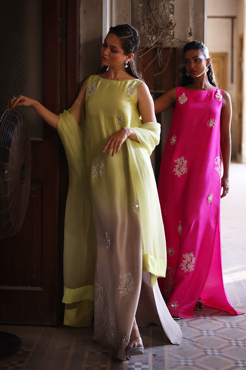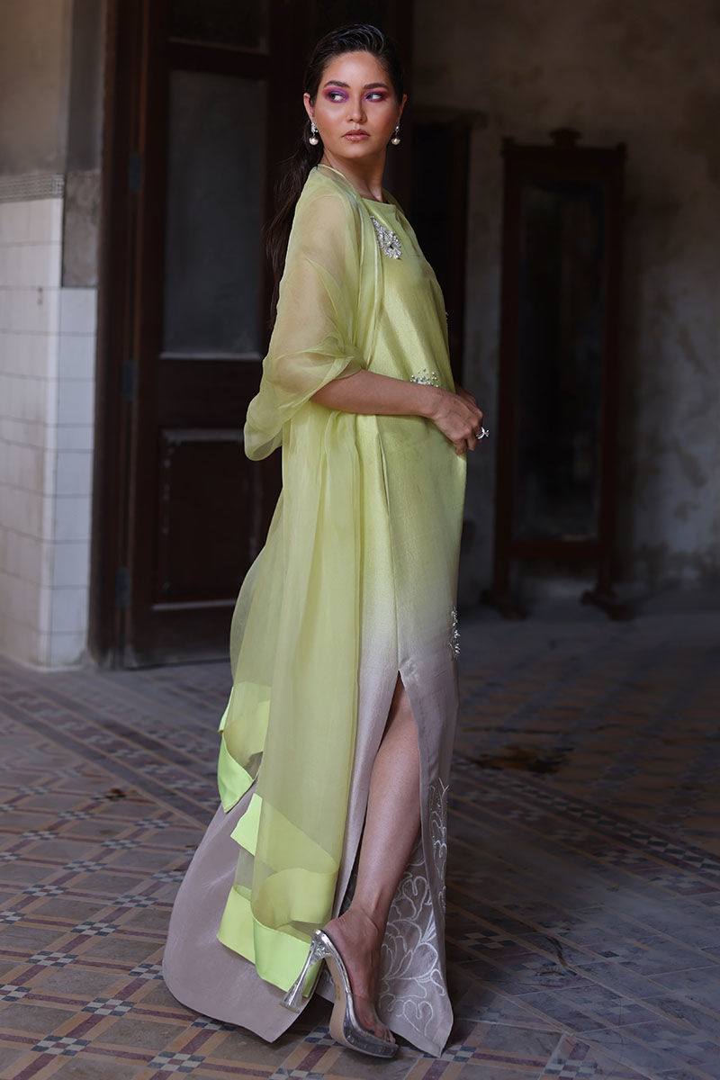 The Kaftan is made from pure raw silk, and comes in a stunning sesame citron shade that is perfect for any occasion. The intricate work of resham beads, mirrors, sequence, and pearls make it a true work of art. With the option of attaching sleeves, this kaftan can be worn in a variety of ways to suit your personal style. To complete the look, paired the kaftan with a pure organza Dupatta.