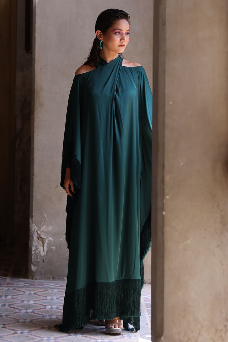 An eye catching Kaftan made from sweet touch silk in jasper green, featuring intricate resham tassels, and experience the luxury of high-quality materials and exquisite craftsmanship. This Kaftan is sure to turn heads and make you feel like a true fashion icon.