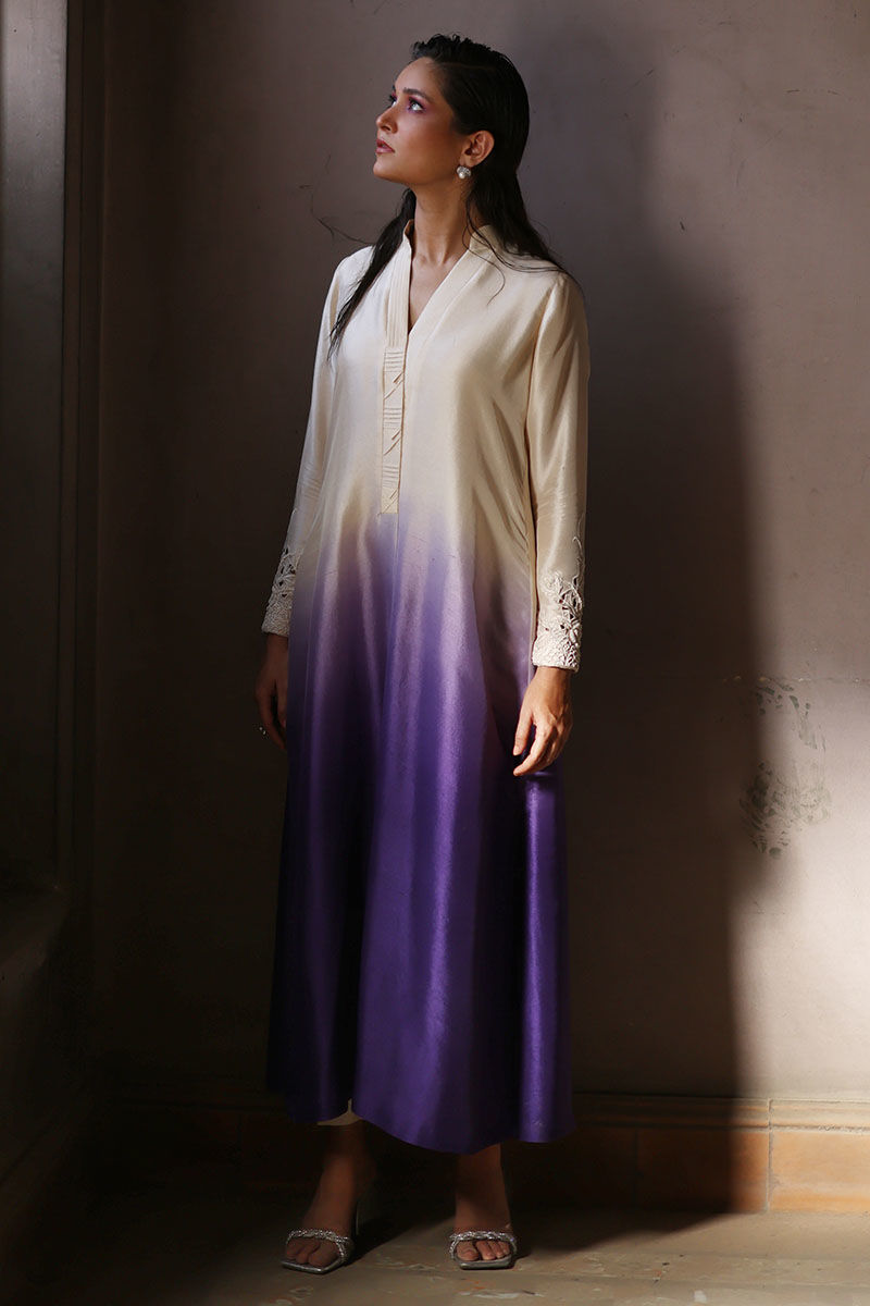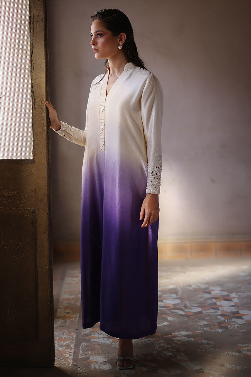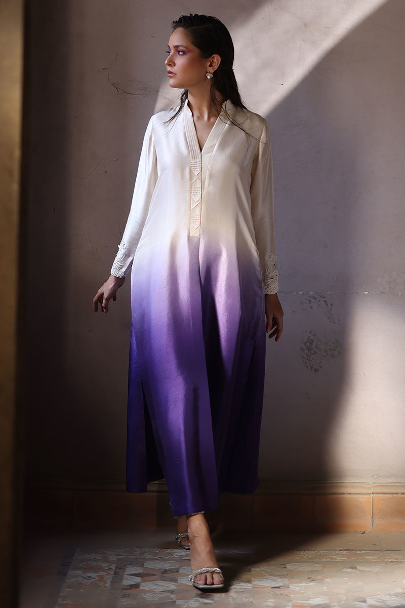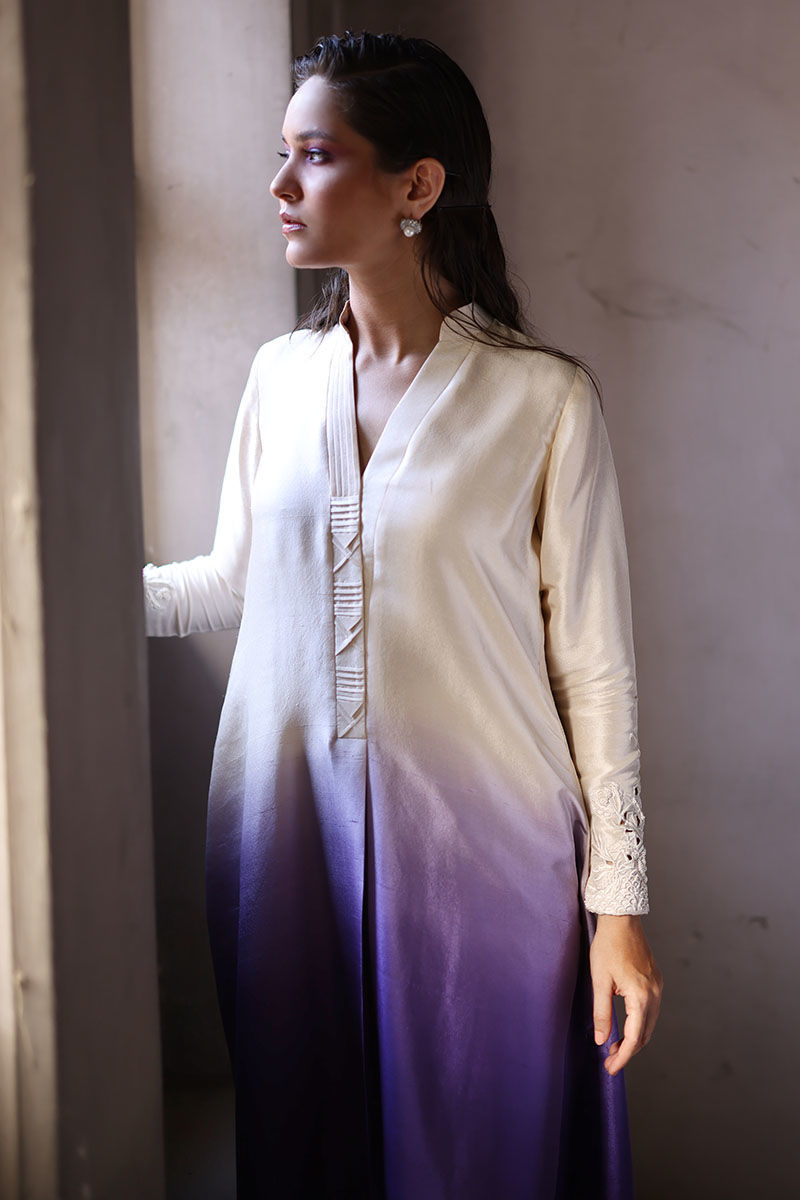 An eye catching box pleat loose A-line cut shirt is made from high-quality pure raw silk, featuring a stunning vanilla grape ombre effect. The neckline is beautifully detailed with fabric manipulation, the sleeves are adorned with intricate cutwork of resham and beads, adding a touch of glamour to the shirt. The pants are available in two materials, shimmer silk and pure raw silk.