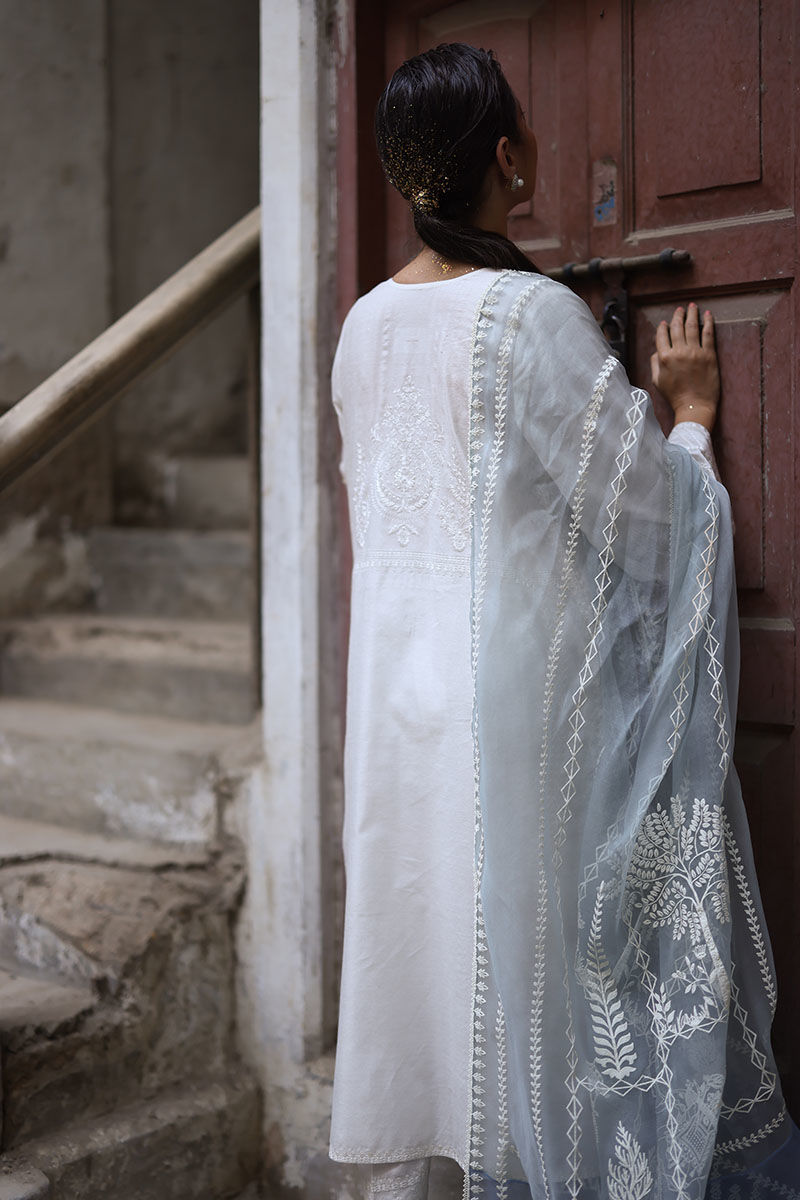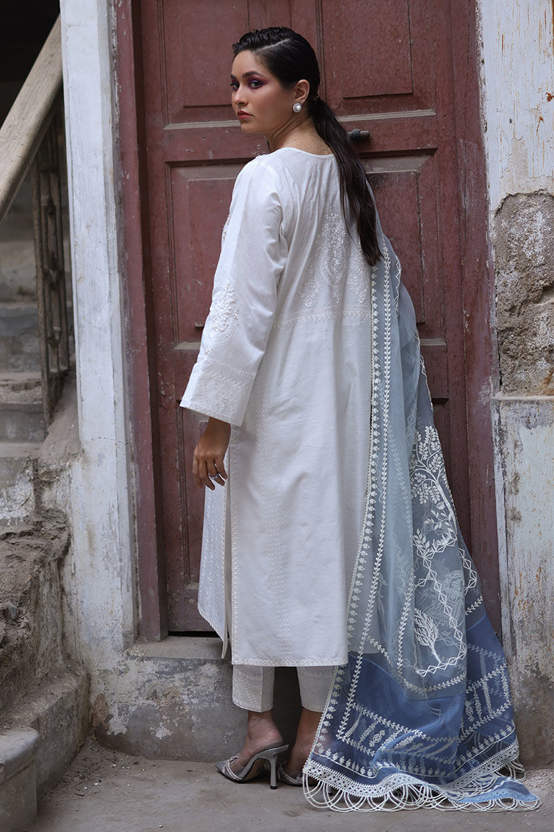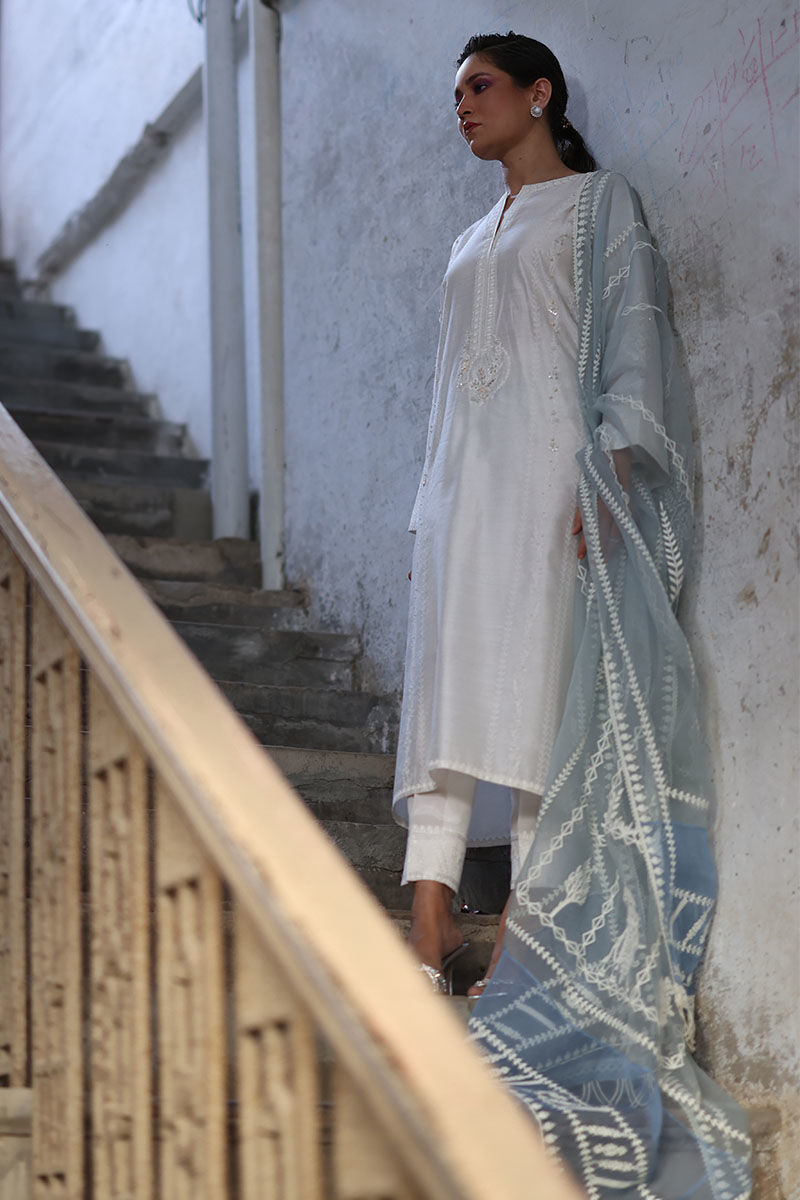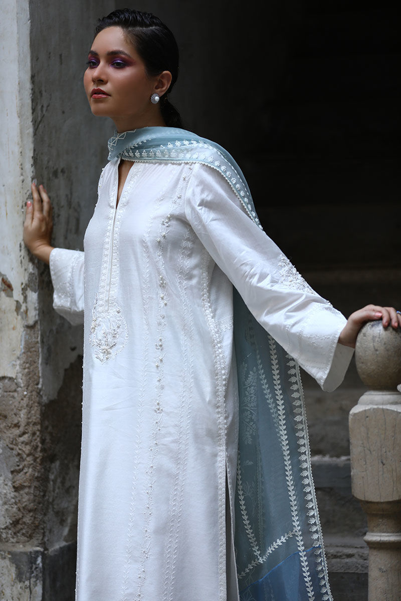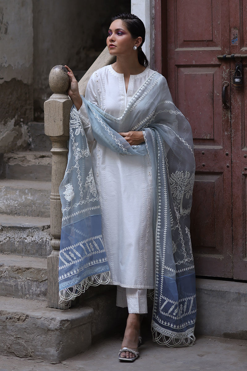 An eye catching straight shirt is made from high-quality cotton net, featuring a pristine Snow White color that radiates elegance and grace. The intricate detailing of resham, stones, and beads adds a touch of glamour to the shirt, while the pants are made of soft and comfortable viscose. The set comes with a two-tone blue pure organza dupatta with an embossed print, adding a pop of color and texture to the overall look.