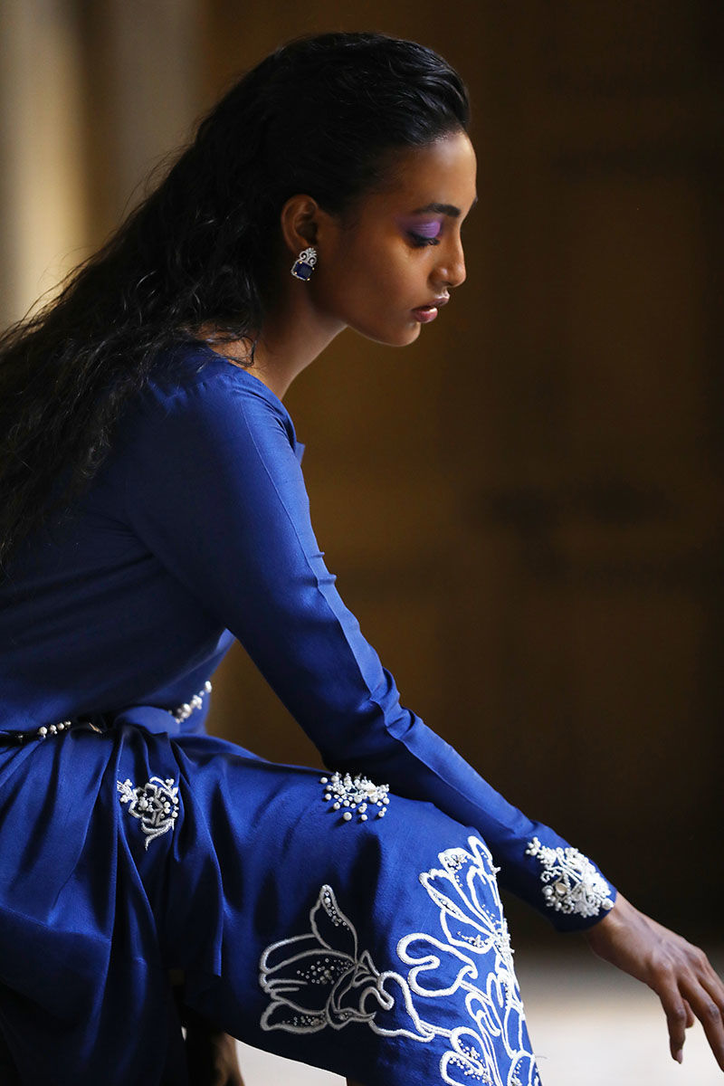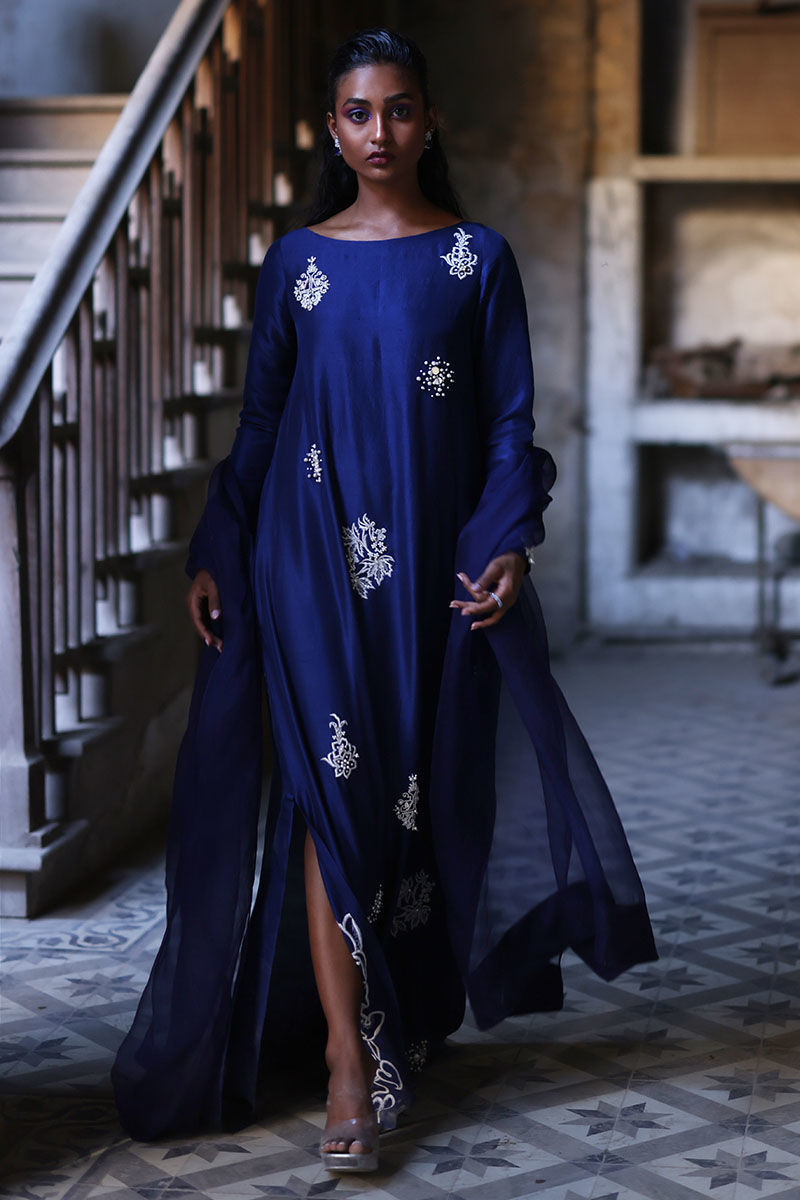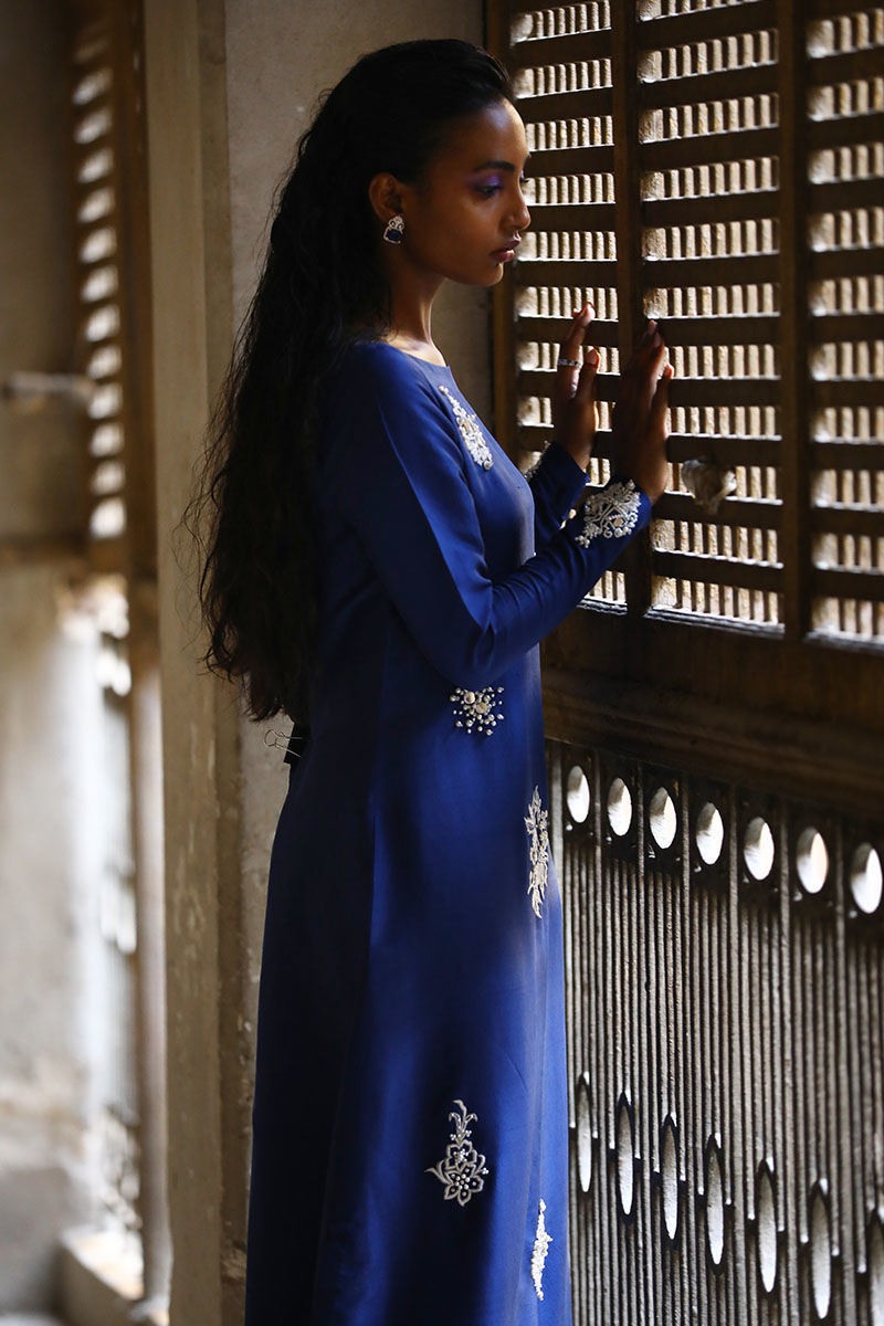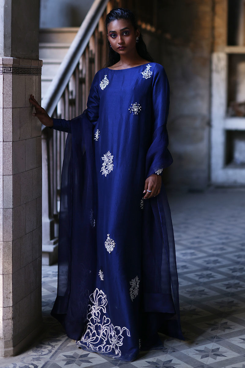 Introducing stunning Kaftan and Dupatta set, designed to elevate your style and add a touch of luxury to your wardrobe. The Kaftan is made from pure raw silk, and comes in a beautiful true blue shade that is perfect for any occasion. The intricate work of resham beads, mirrors, sequence, and pearls make it a true work of art.