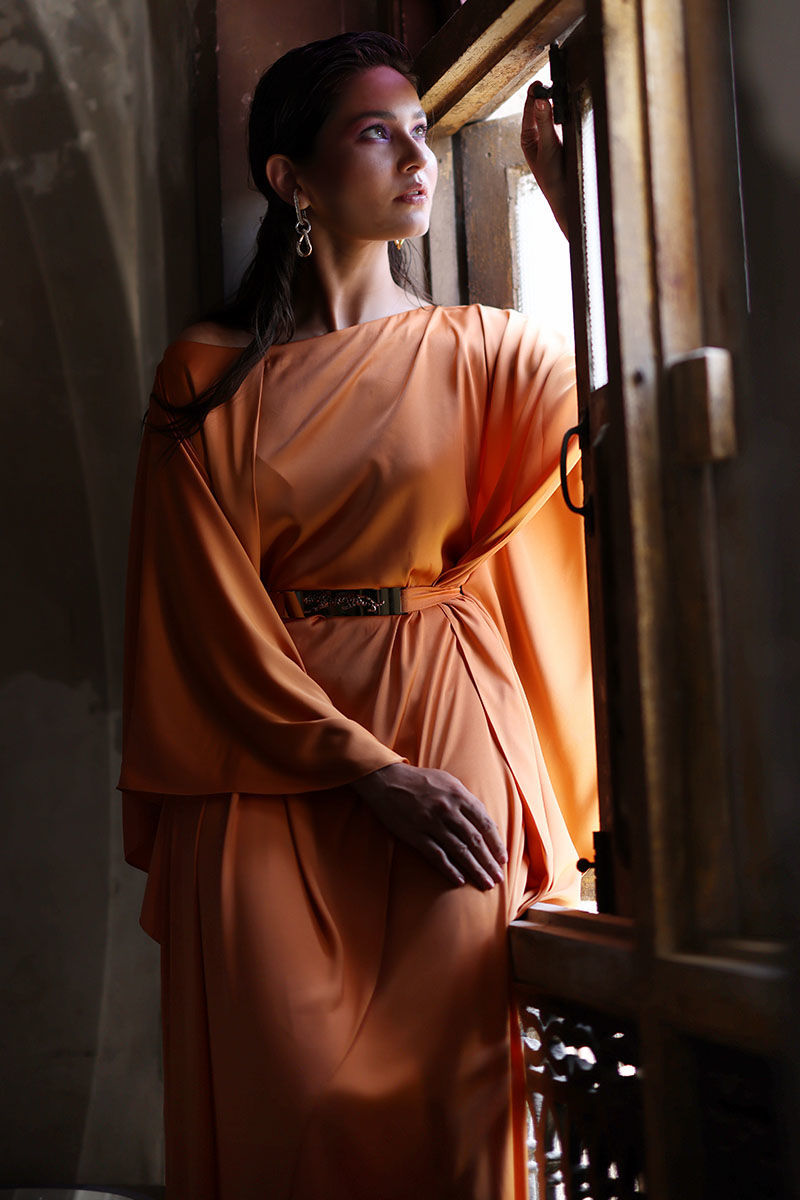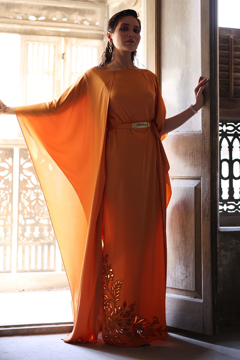 The kaftan is designed to drape beautifully, making it both comfortable and flattering. kaftan features a unique golden metal buckle with leopard detailing, adding a touch of edgy sophistication to the outfit. The exquisite embroidery work with resham cutwork elevates the kaftan to new heights. Don't miss out on this fashion-forward piece that's sure to make you feel confident, stylish, and beautiful.