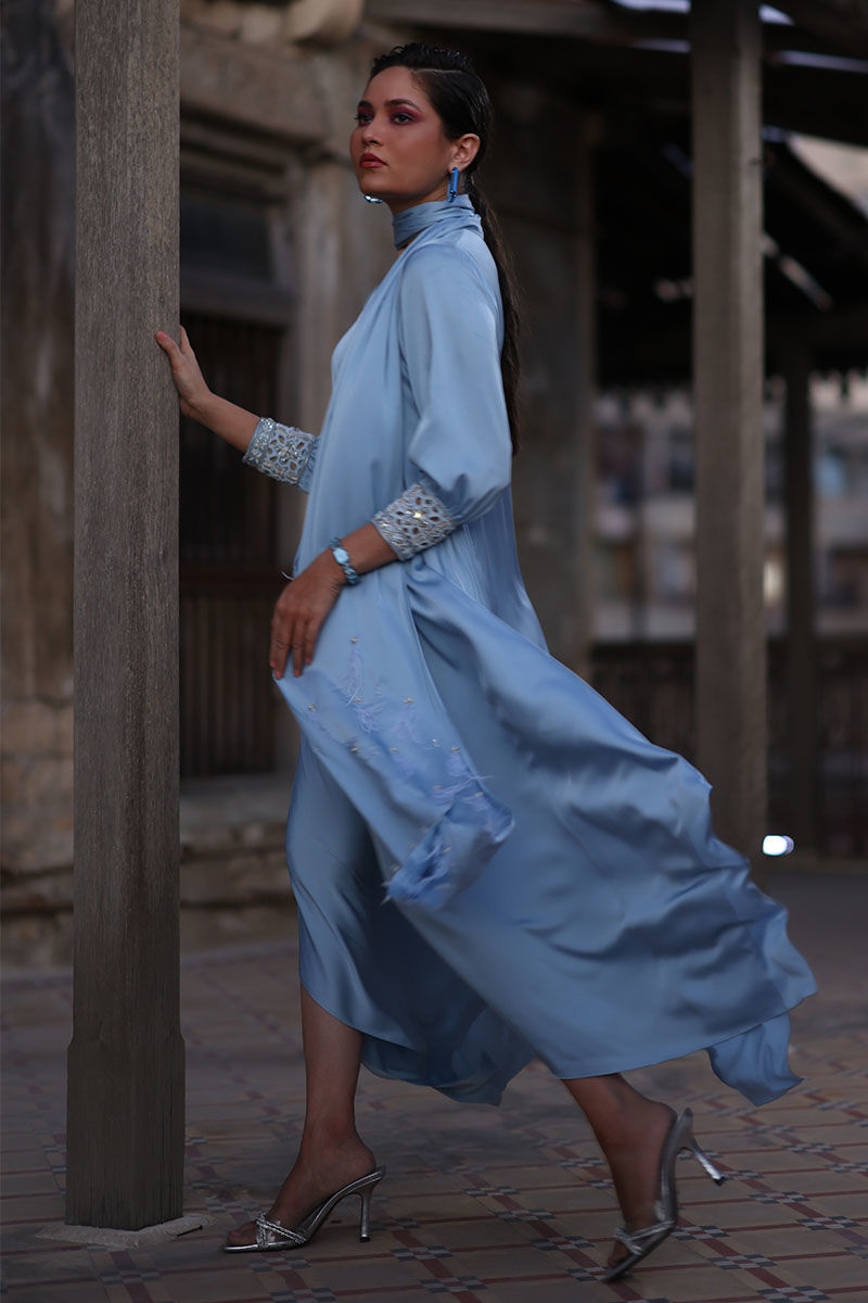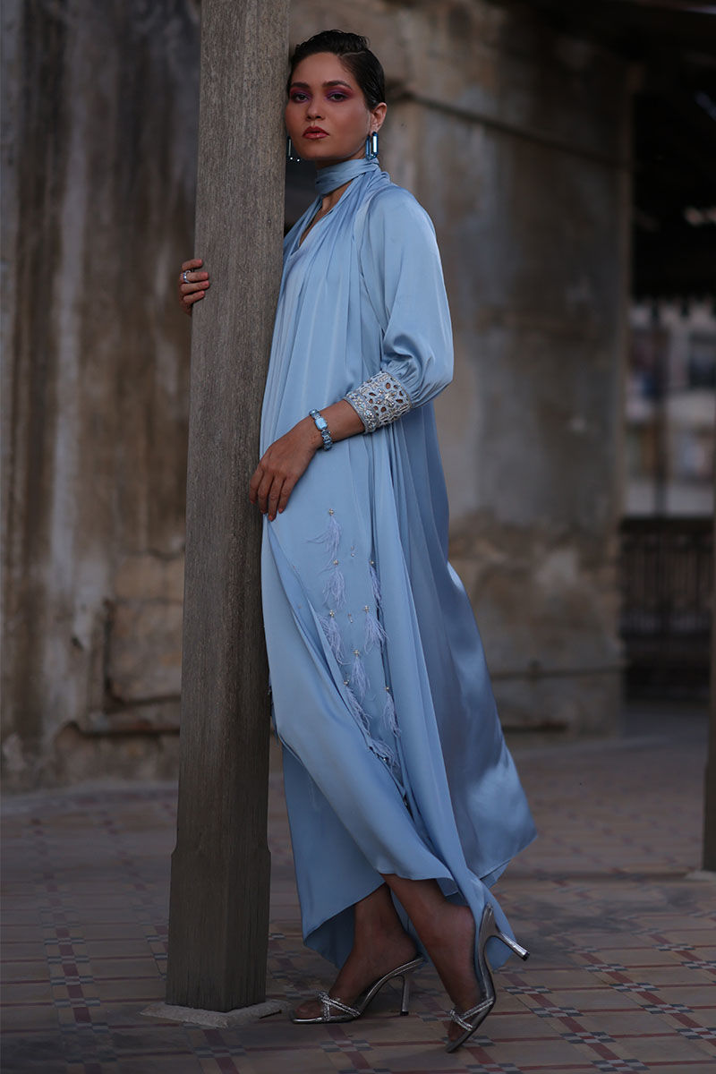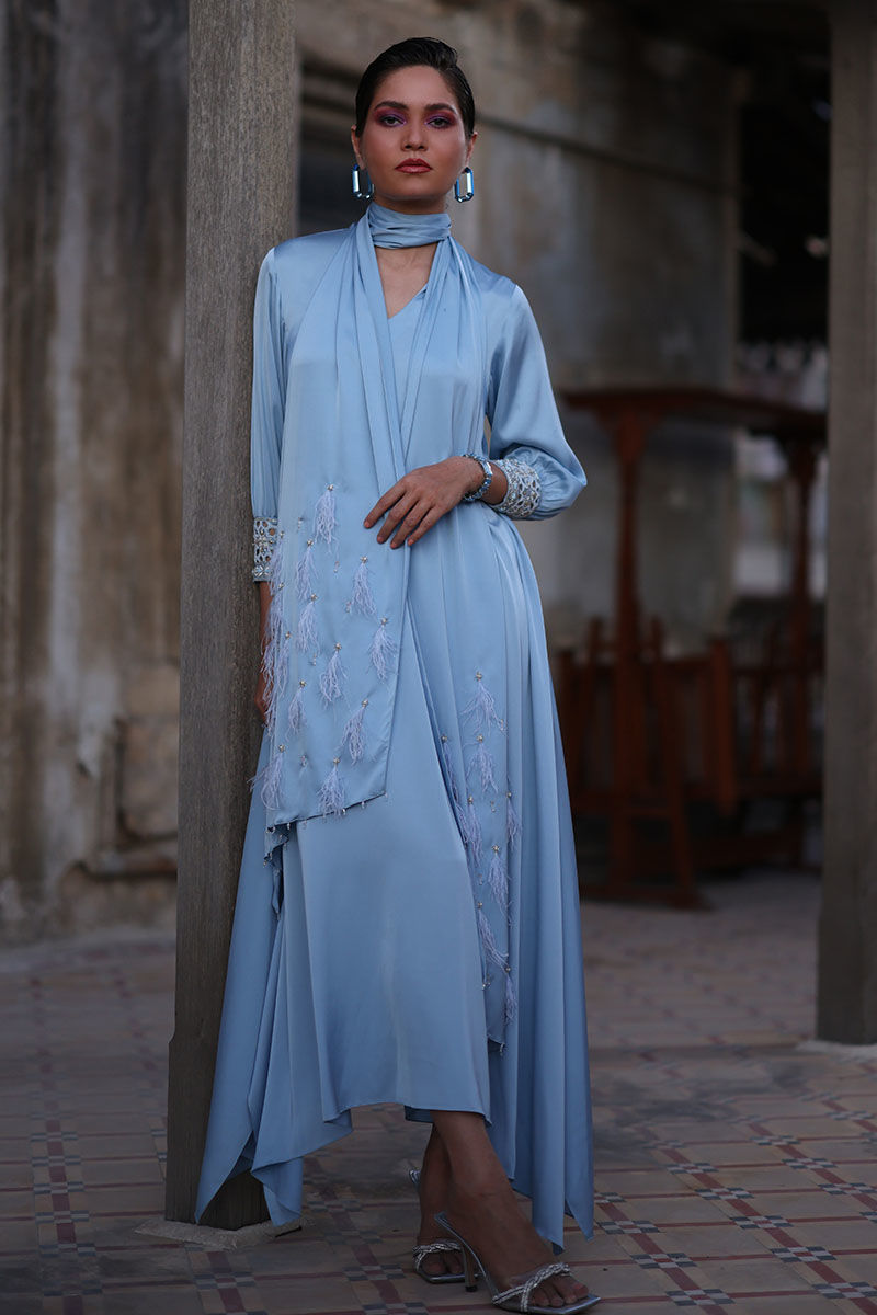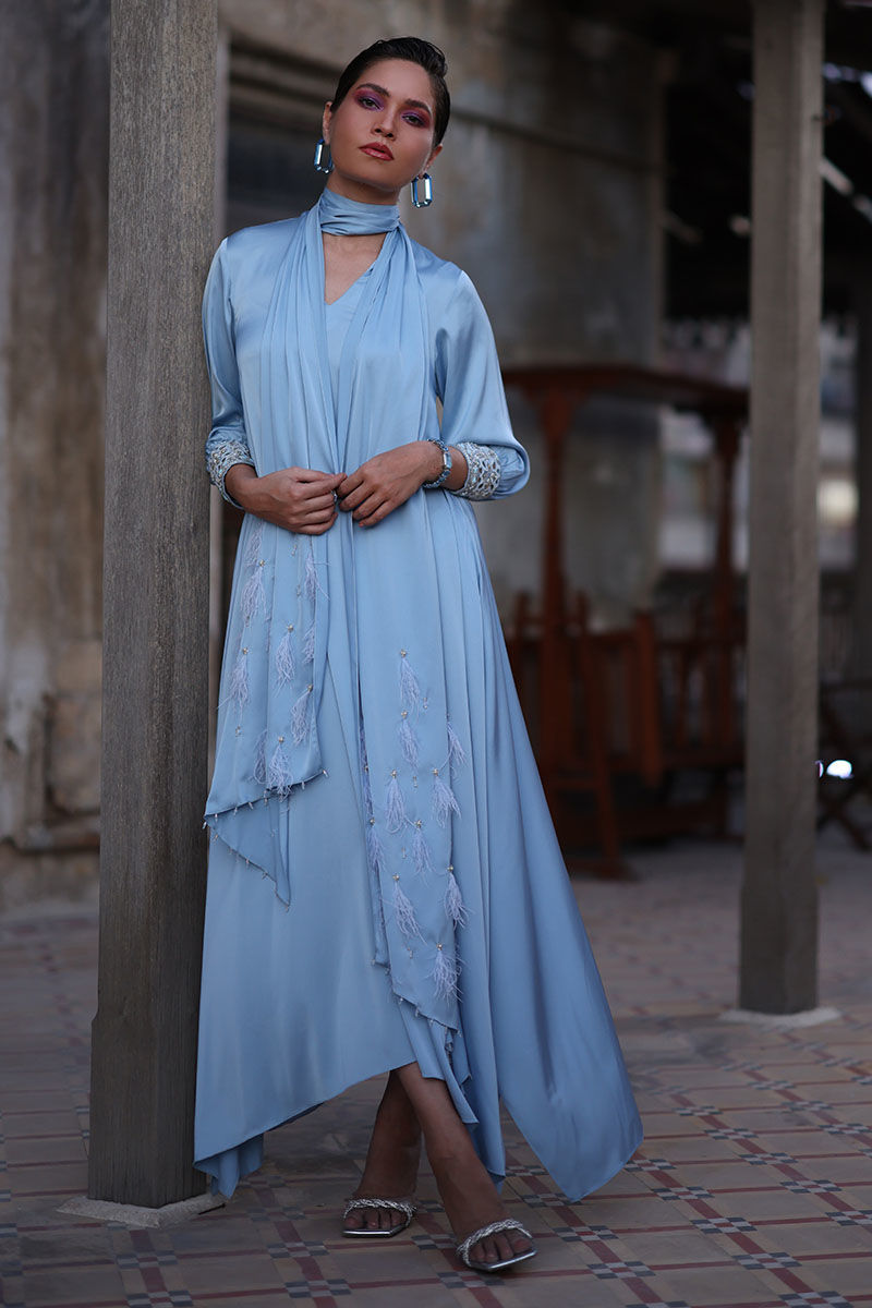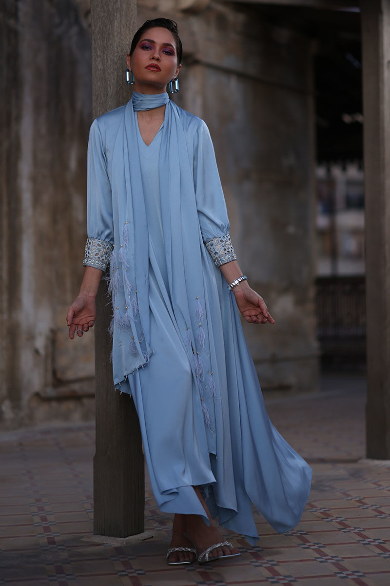 The top is made of sweet touch silk in a gorgeous sky light shade, and adorned with intricate detailing of zari, crystals, sequence, stones, feathers, and pearls. The straight pants complement the top perfectly, and together they create a stunning silhouette that is both flattering and comfortable. This set comes with an attached stole that drapes beautifully over the shoulders, adding an extra layer of elegance and sophistication.
