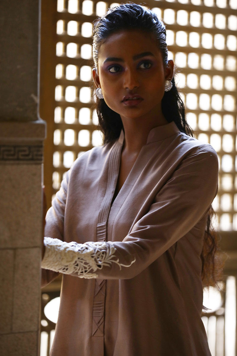 Introducing our stunning shirt made from pure raw silk 80, in a beautiful pinewood color, with a gorgeous fabric manipulation on the neckline and stunning resham and bead cutwork on the sleeves. The box pleat loose A-line cut is both comfortable and flattering, making this shirt a versatile addition to any wardrobe. The pants are available in two materials, shimmer silk and pure raw silk the shimmer silk adds a touch of glamour, while the pure raw silk ensures a comfortable and luxurious fit.