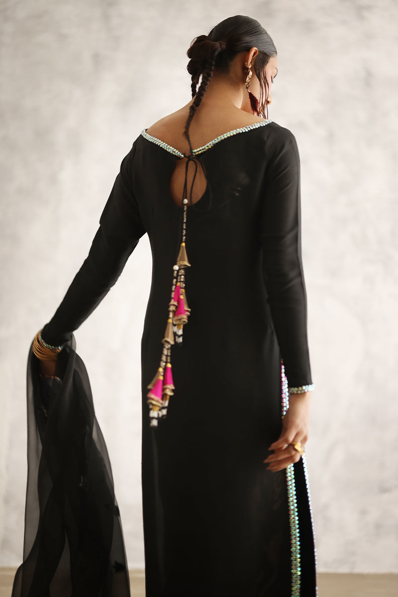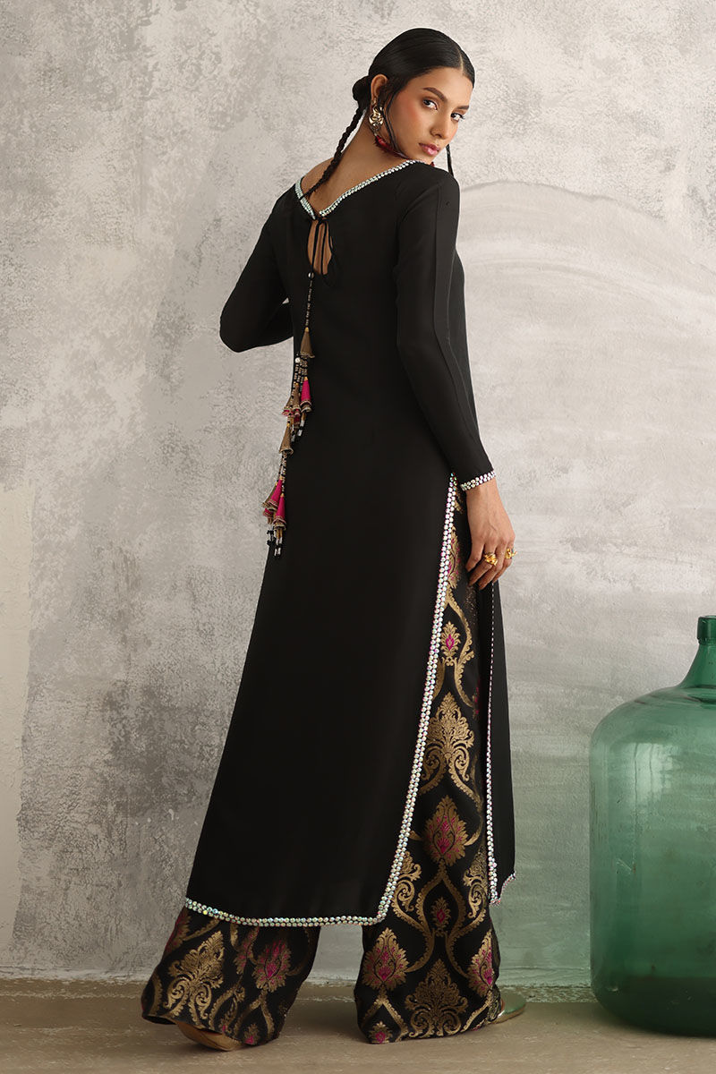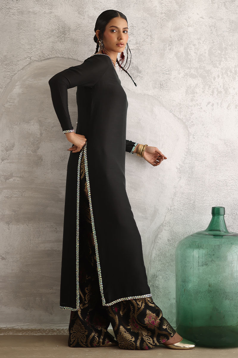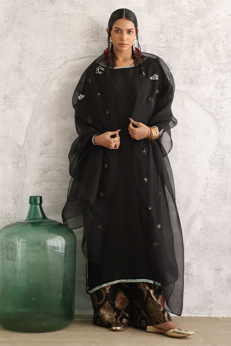 Introducing our after dark ensemble, featuring a pure raw silk straight shirt in a rich and elegant hue. adorned with exquisite tiki stone work on the neckline, sleeves, side slits, and daman, this shirt exudes sophistication and style. The addition of hand-made tassels at the back adds a touch of allure to the ensemble. Paired with banarsi culottes for a timeless appeal, and complemented by a pure organza dupatta embellished with handwork of tiki stones, stones, crystals, kora, and cut dana, this ensemble is perfect for any special occasion.