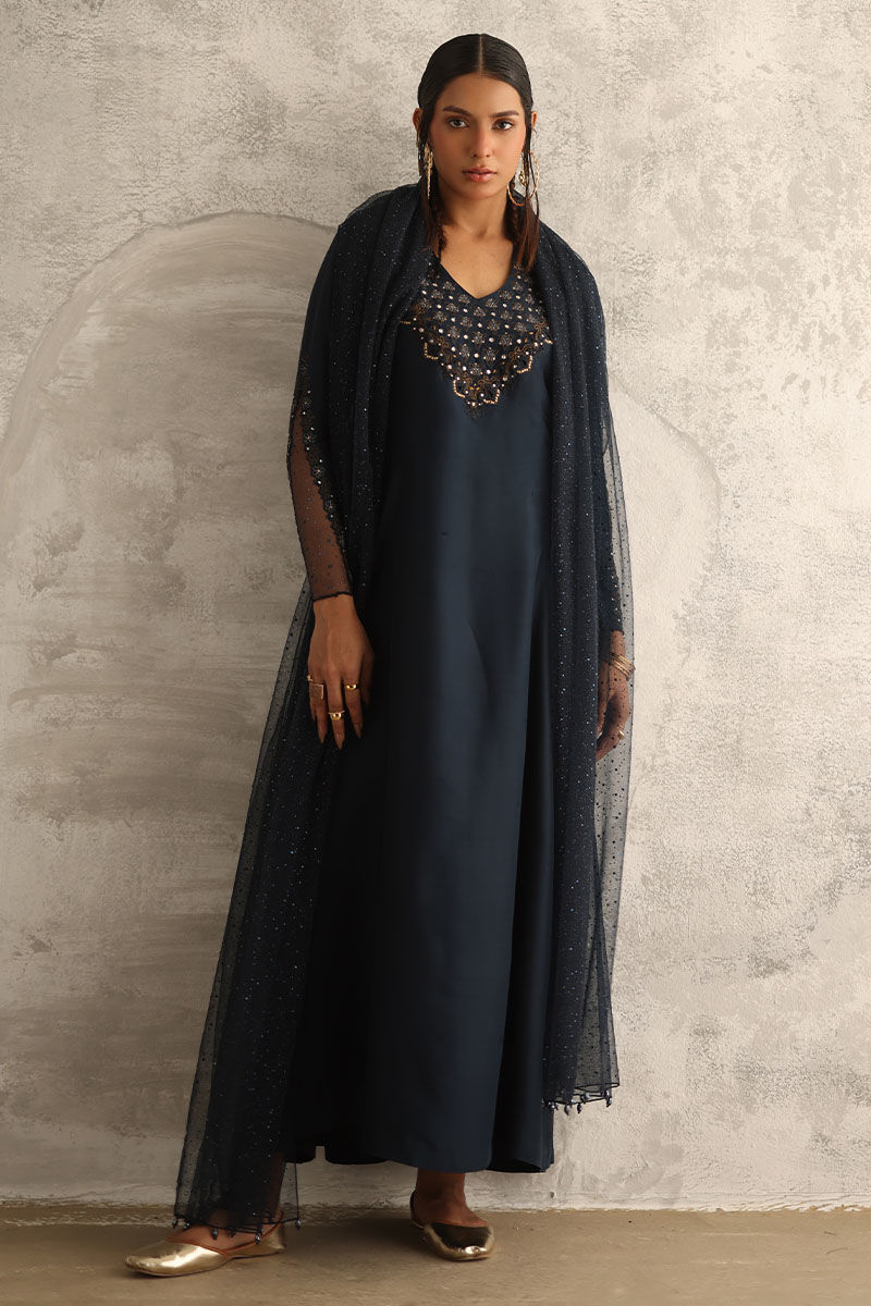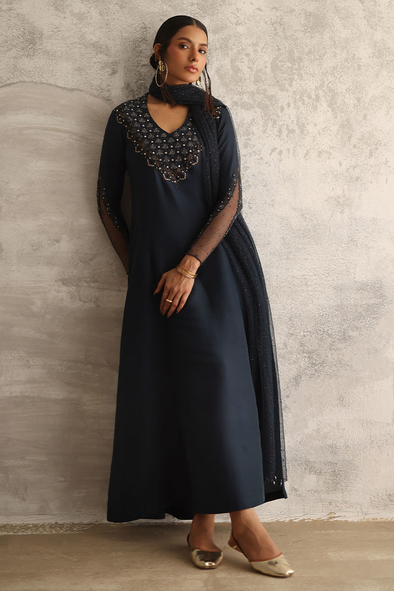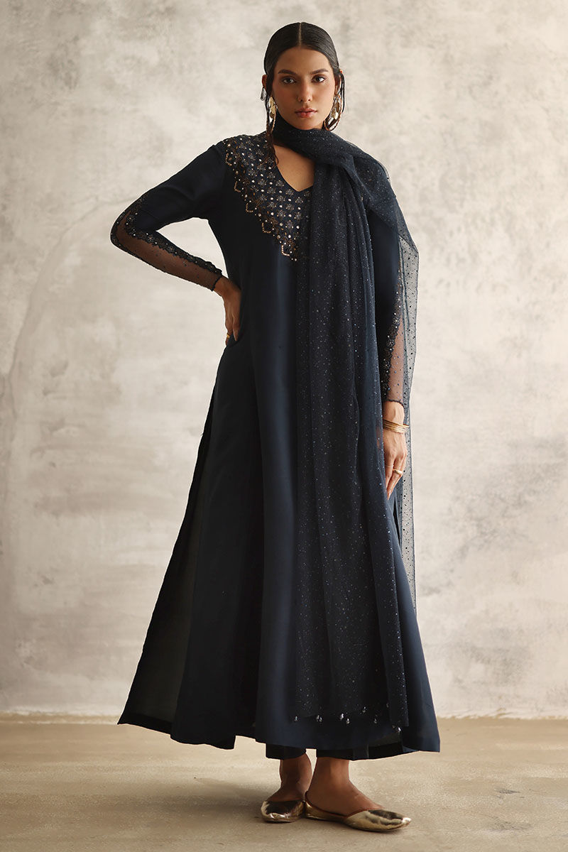 Dive into the enchanting allure of our night sky ensemble, a captivating blend of sophistication and elegance. Crafted from pure raw silk, the prince panel shirt boasts intricate resham and zari embroidery, adding a touch of regal charm. Adorned with delicate handwork of tikki stones and crystals, this ensemble exudes opulence and grace. Paired with semi-pure rotana pants for a refined silhouette. Complete the look with a net embellished dupatta featuring crystal hangings on the pallu, infusing it with celestial beauty.