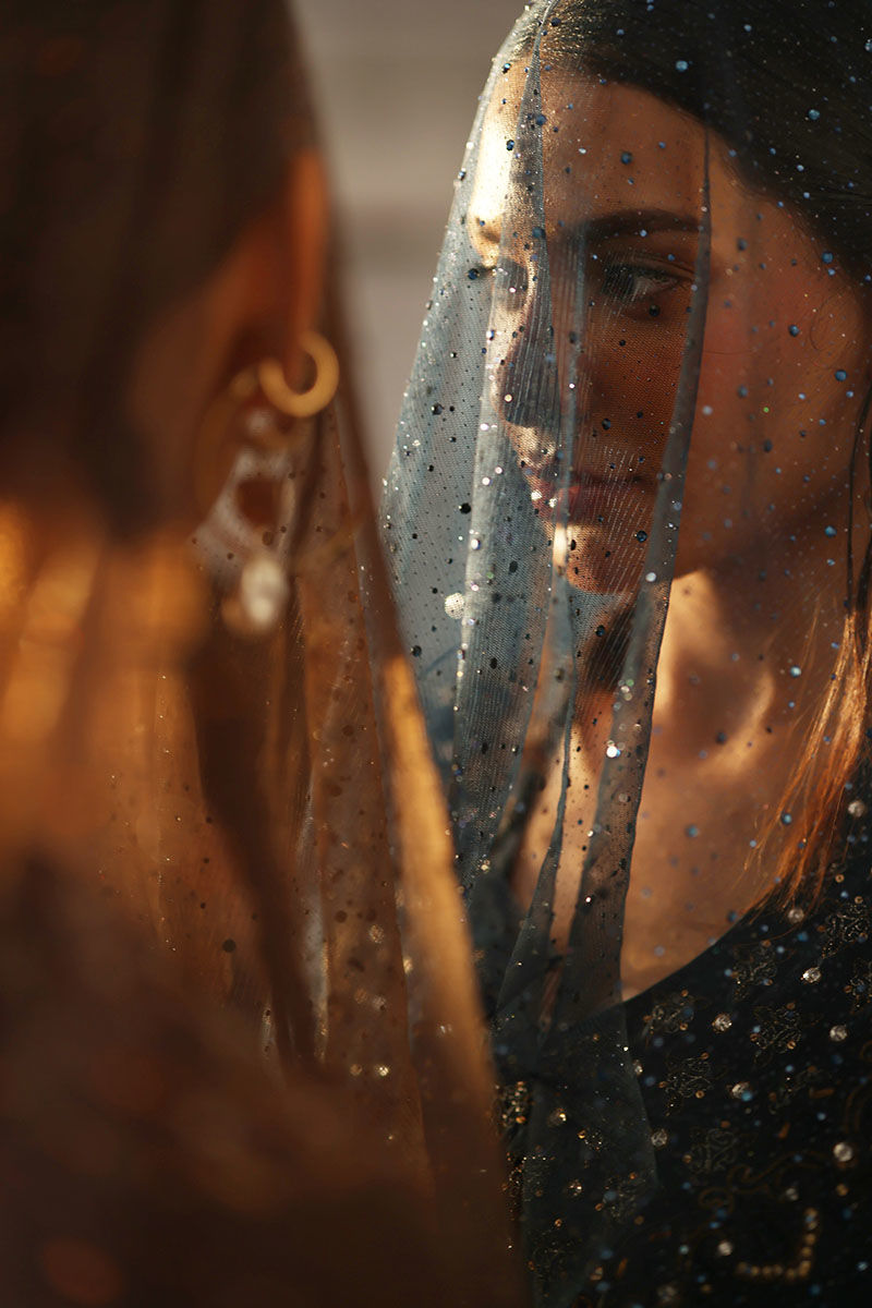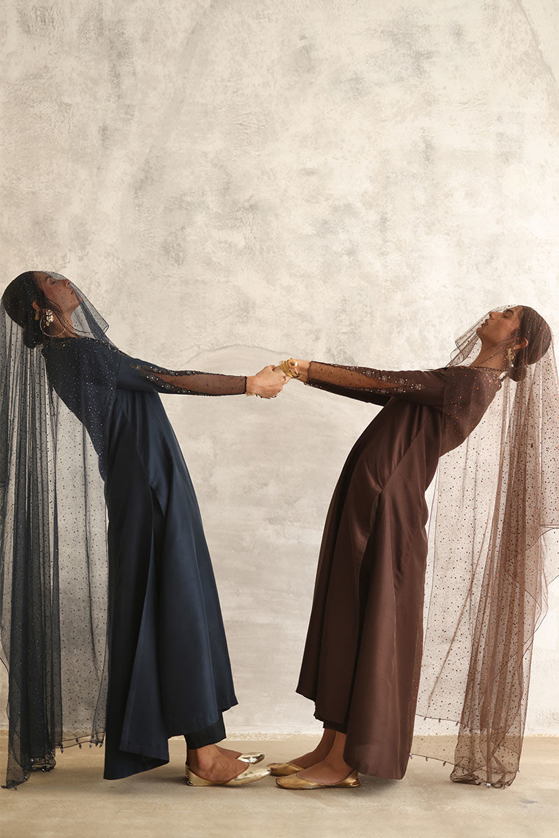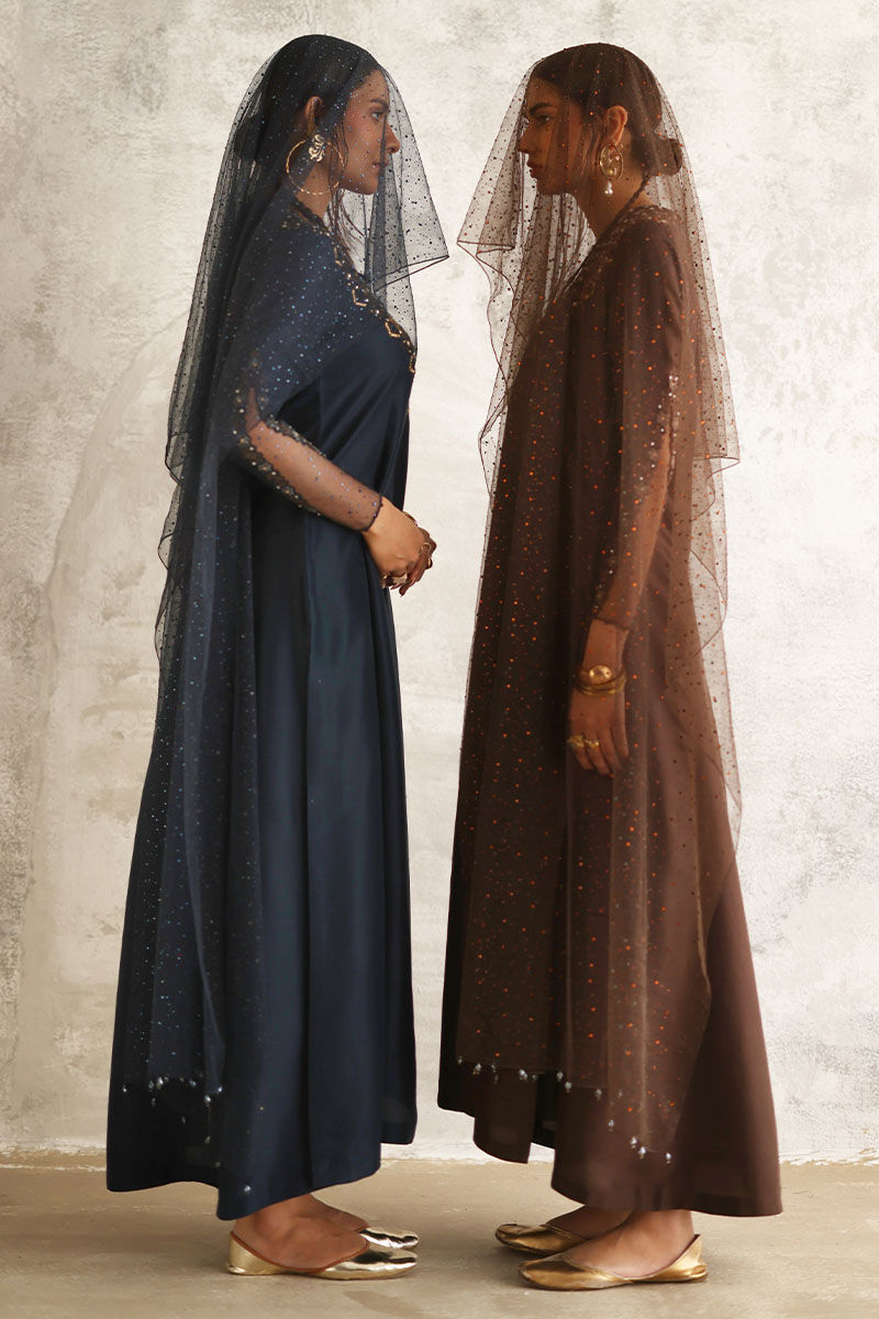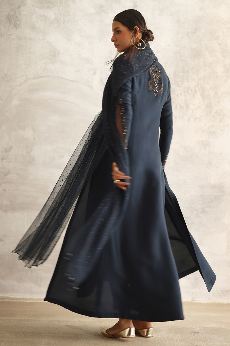 Dive into the enchanting allure of our night sky ensemble, a captivating blend of sophistication and elegance. Crafted from pure raw silk, the prince panel shirt boasts intricate resham and zari embroidery, adding a touch of regal charm. Adorned with delicate handwork of tikki stones and crystals, this ensemble exudes opulence and grace. Paired with semi-pure rotana pants for a refined silhouette. Complete the look with a net embellished dupatta featuring crystal hangings on the pallu, infusing it with celestial beauty.