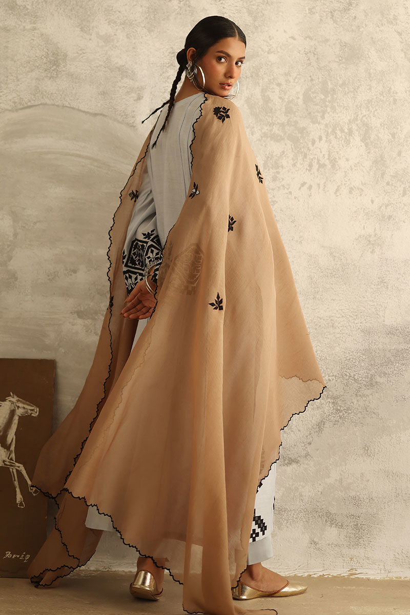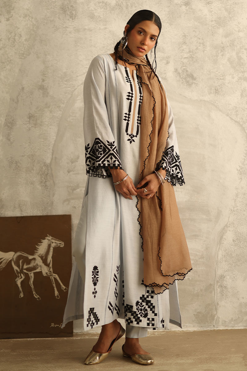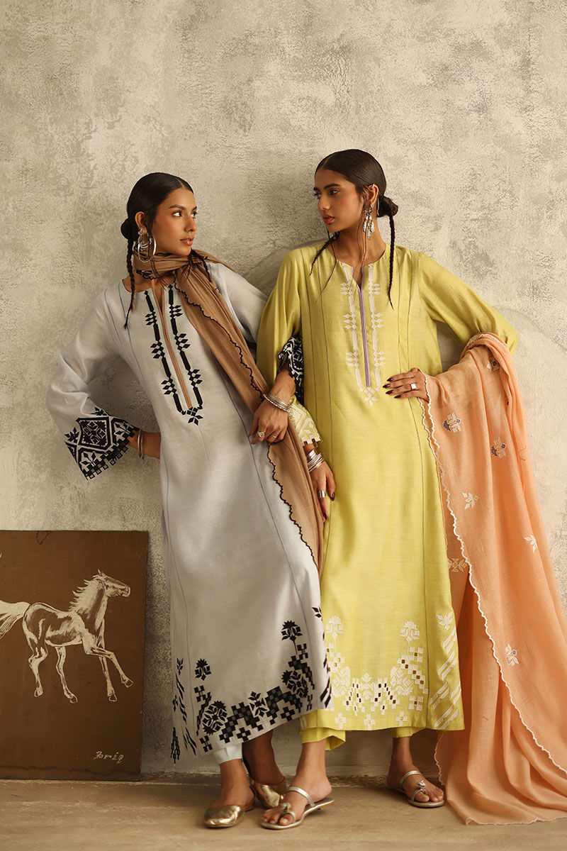 Elevate your wardrobe with the ethereal charm of our Power Blue ensemble. Tailored from pure premium khadi silk, the panel shirt boasts exquisite patchwork, lending an artisanal touch to its design. Paired with rayon satin pants for a seamless silhouette. Complete the look with a Swiss fabric dupatta, adorned with patchwork boti and delicate four-side scallops, exuding understated elegance.