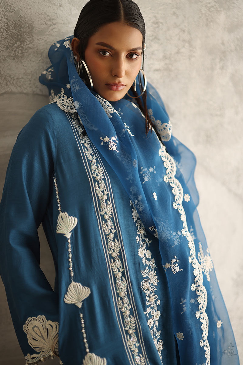 Elevate your style with our Sapphire ensemble. Crafted from pure premium khaadi silk, the shirt boasts resplendent resham embroidery, meticulously adorned with pearls, sequins, moti, tiki stones, kora, and dabka, offering a touch of opulence. Paired with candy crepe culottes, providing both comfort and sophistication. Complete your look with a pure organza dupatta, featuring resham embroidery scallops and delicate booties, adding a timeless charm to your ensemble.