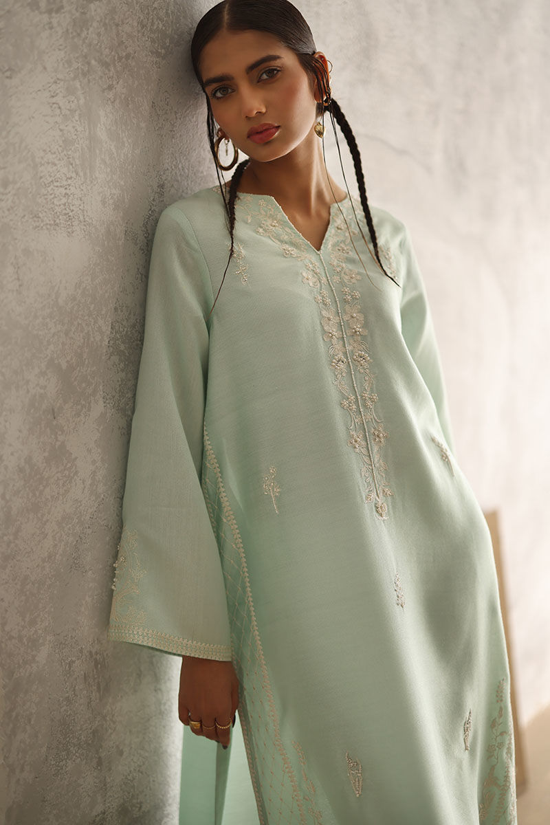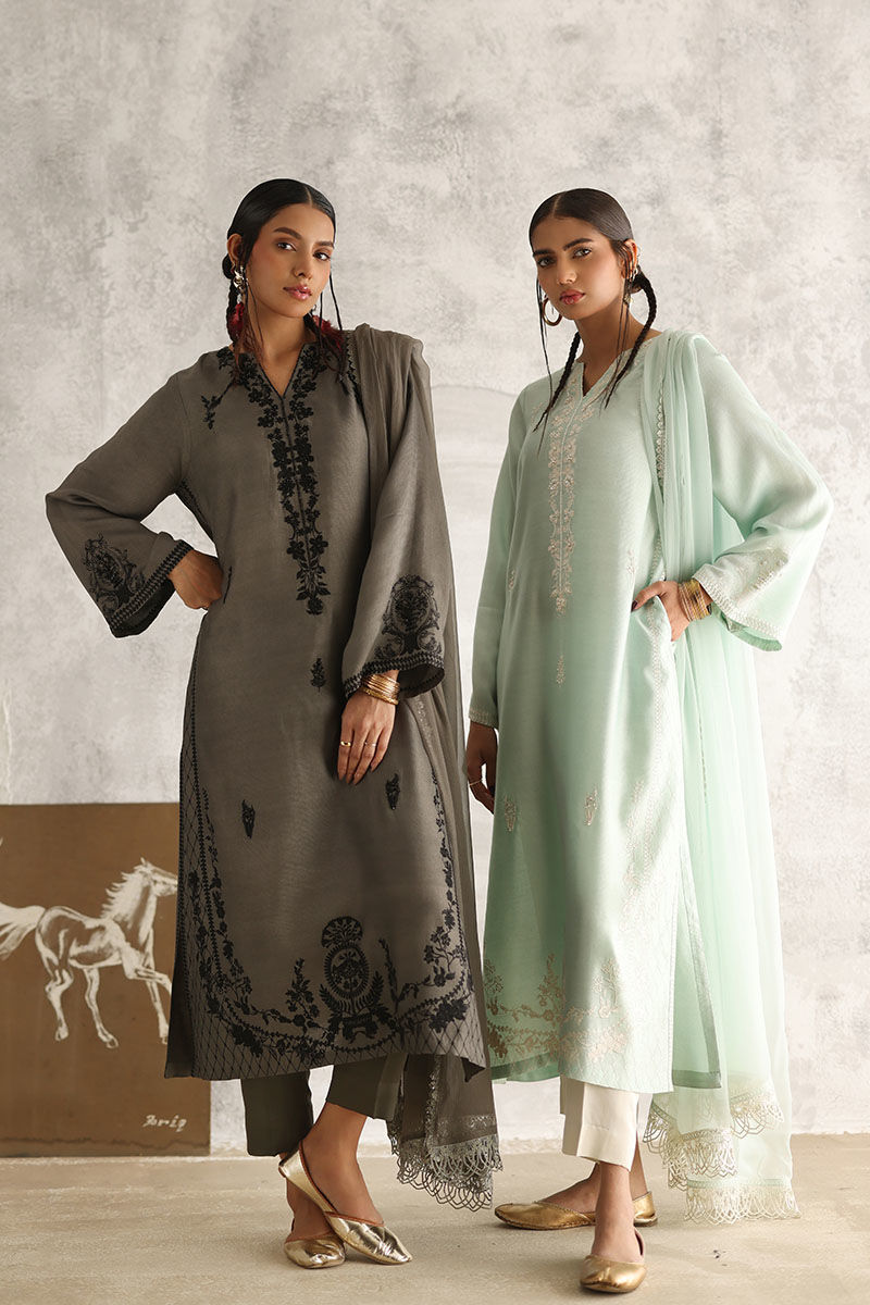 Indulge in the serene elegance of our Misty Aqua ensemble. The plain Khadi shirt is adorned with allover resham embroidery, enhanced by delicate touches of pearls, sequins, cutdana, moti, and naqshi, exuding an ethereal charm. Complemented by comfortable rayon satin pants for effortless grace. Complete your look with a chiffon dupatta featuring intricate lace detailing on all four sides, adding a touch of sophistication to your attire.