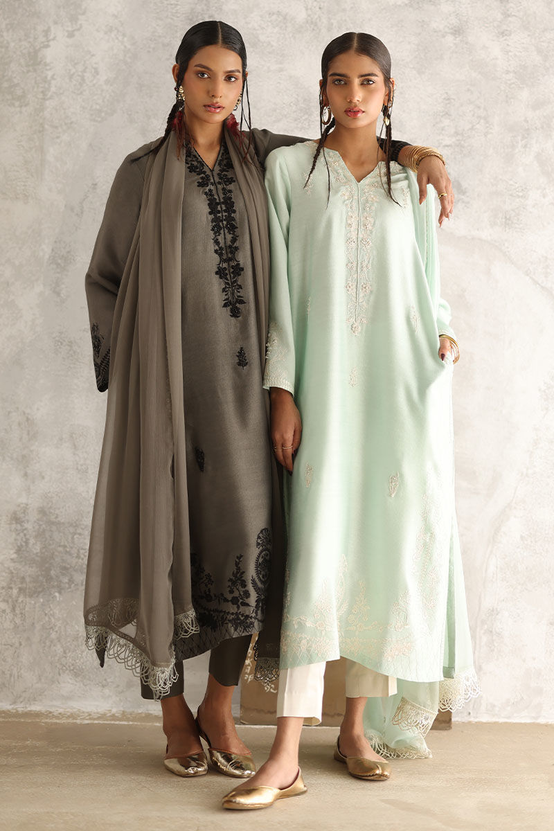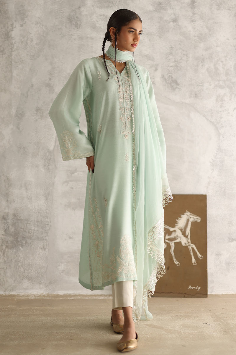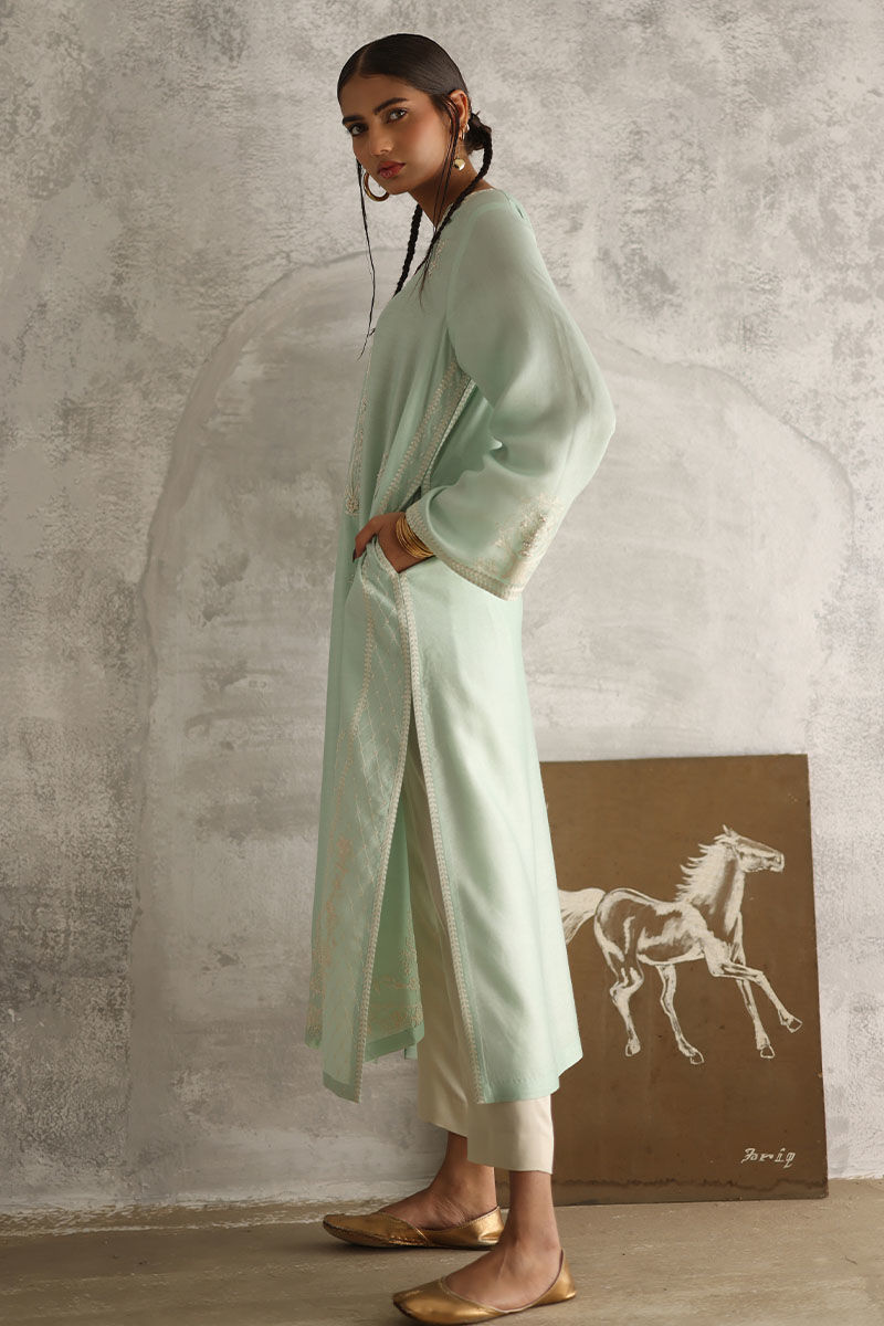 Indulge in the serene elegance of our Misty Aqua ensemble. The plain Khadi shirt is adorned with allover resham embroidery, enhanced by delicate touches of pearls, sequins, cutdana, moti, and naqshi, exuding an ethereal charm. Complemented by comfortable rayon satin pants for effortless grace. Complete your look with a chiffon dupatta featuring intricate lace detailing on all four sides, adding a touch of sophistication to your attire. The model's shirt length is 47 and culottes length is 36.