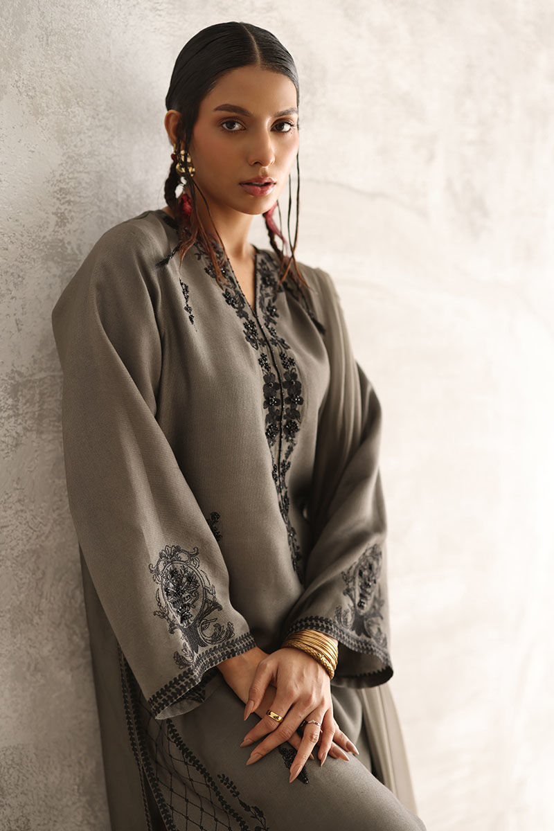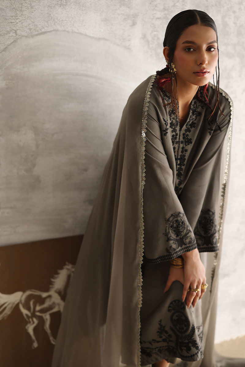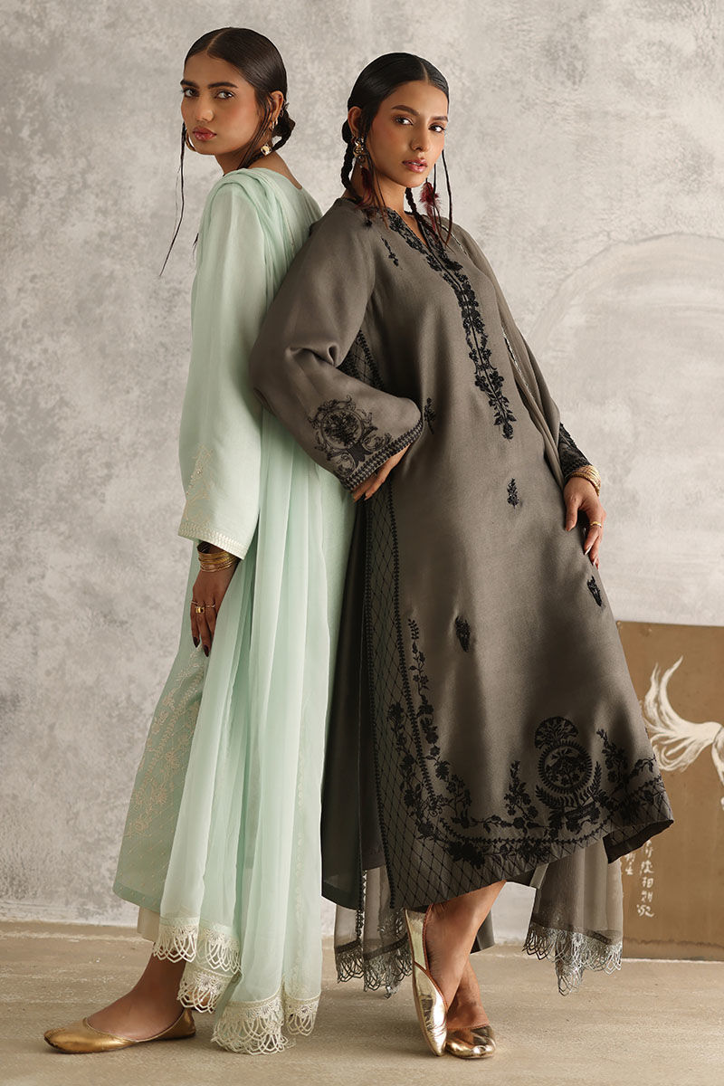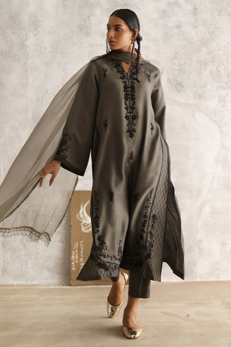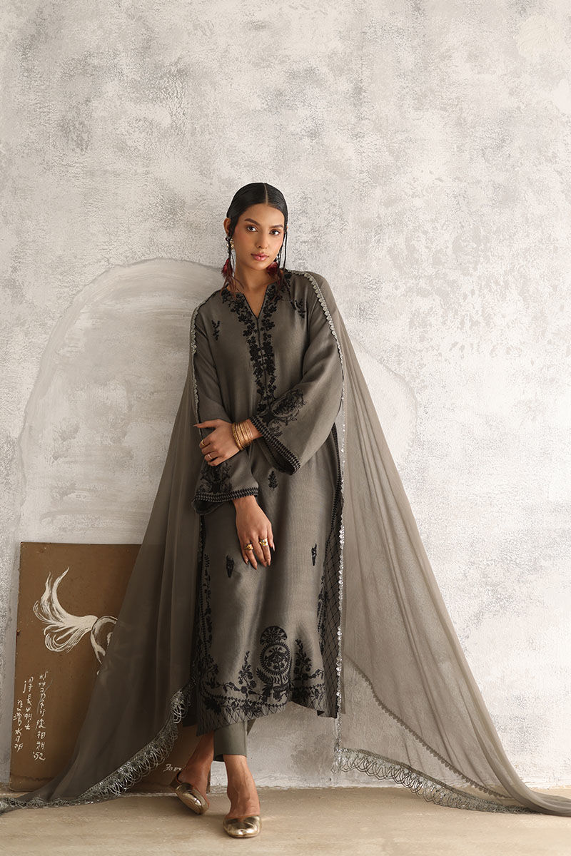 Experience understated sophistication with our gull grey ensemble. The plain Khadi shirt boasts allover resham embroidery, delicately accented with pearls, sequins, cutdana, moti, and naqshi, lending an exquisite touch to your look. Paired with comfortable rayon satin pants for effortless elegance. Complete your ensemble with a chiffon dupatta featuring intricate lace detailing on all four sides, adding a subtle yet refined finish to your attire.