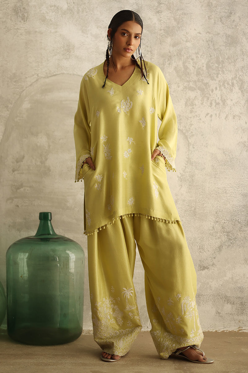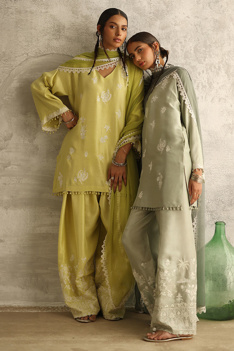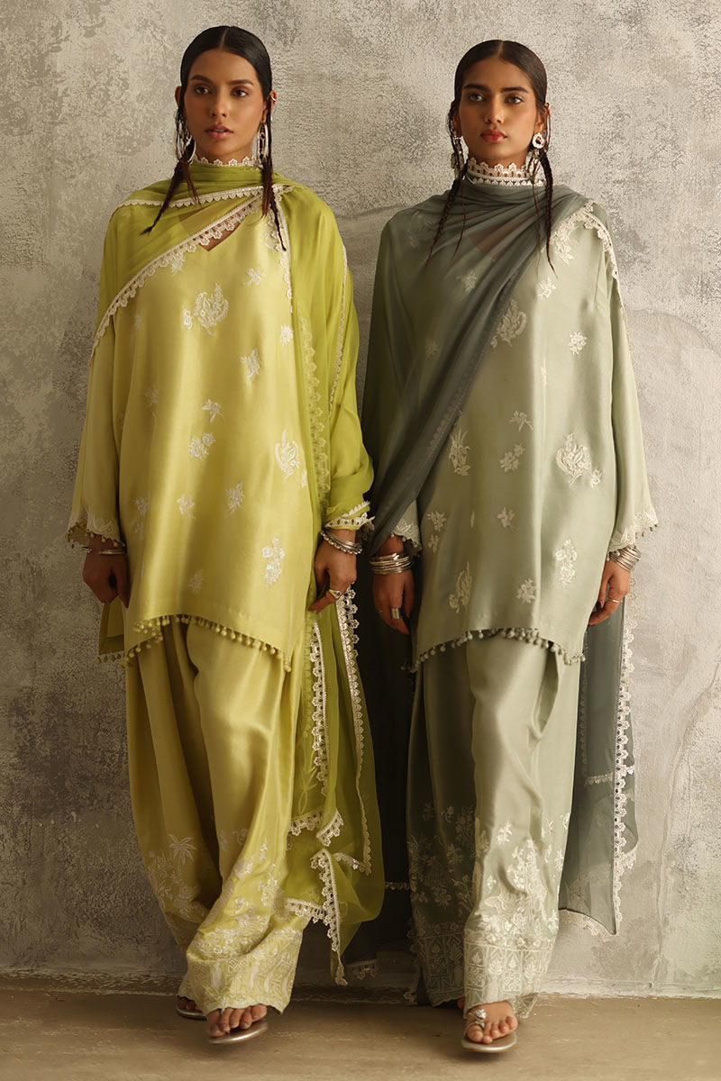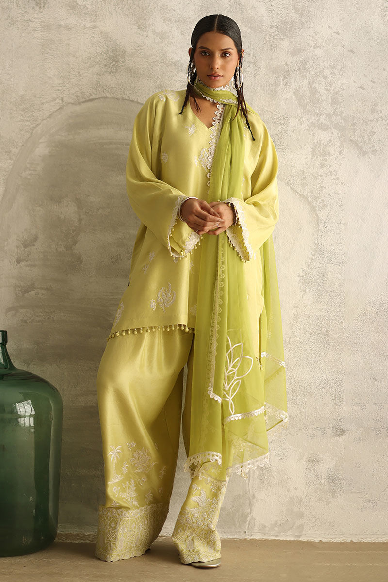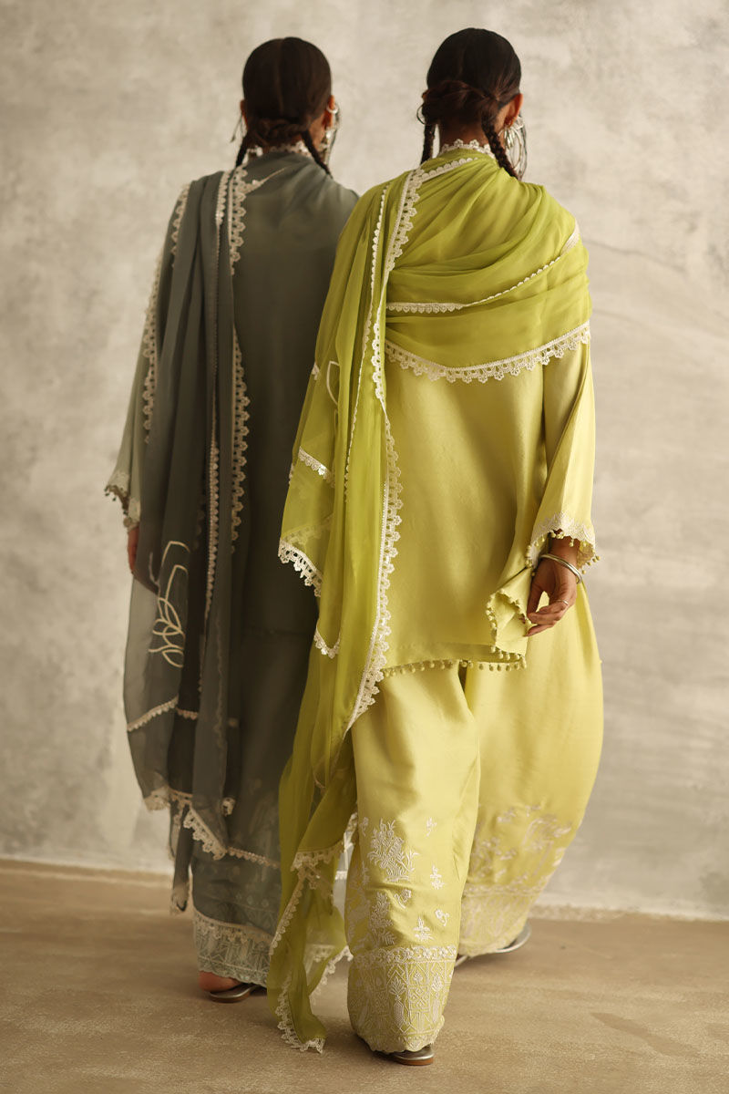 Introducing our vibrant Sunny Lime ensemble, featuring a pure raw silk 80 gms straight short shirt adorned with intricate Resham embroidery boti. The shirt boasts embroidered sleeves borders, adorned with delicate crystals and pearls, exuding elegance and charm. Paired with pure raw silk bottoms, fully embroidered for added allure, and complemented by a chiffon dupatta featuring intricate embroidery and delicate lace detailing on all four sides.