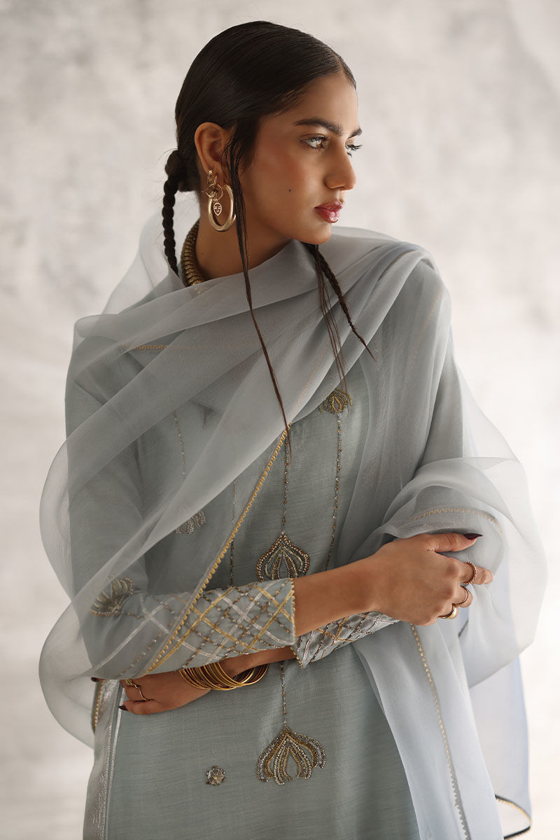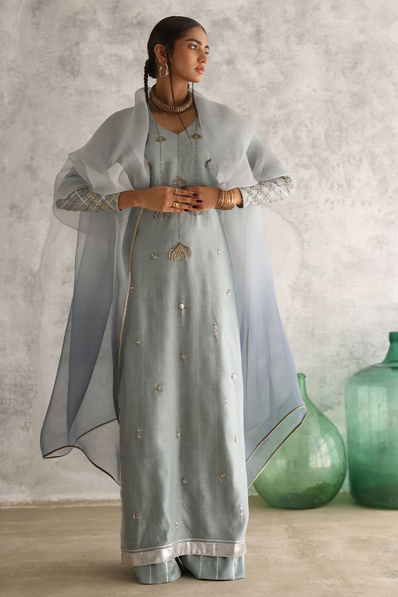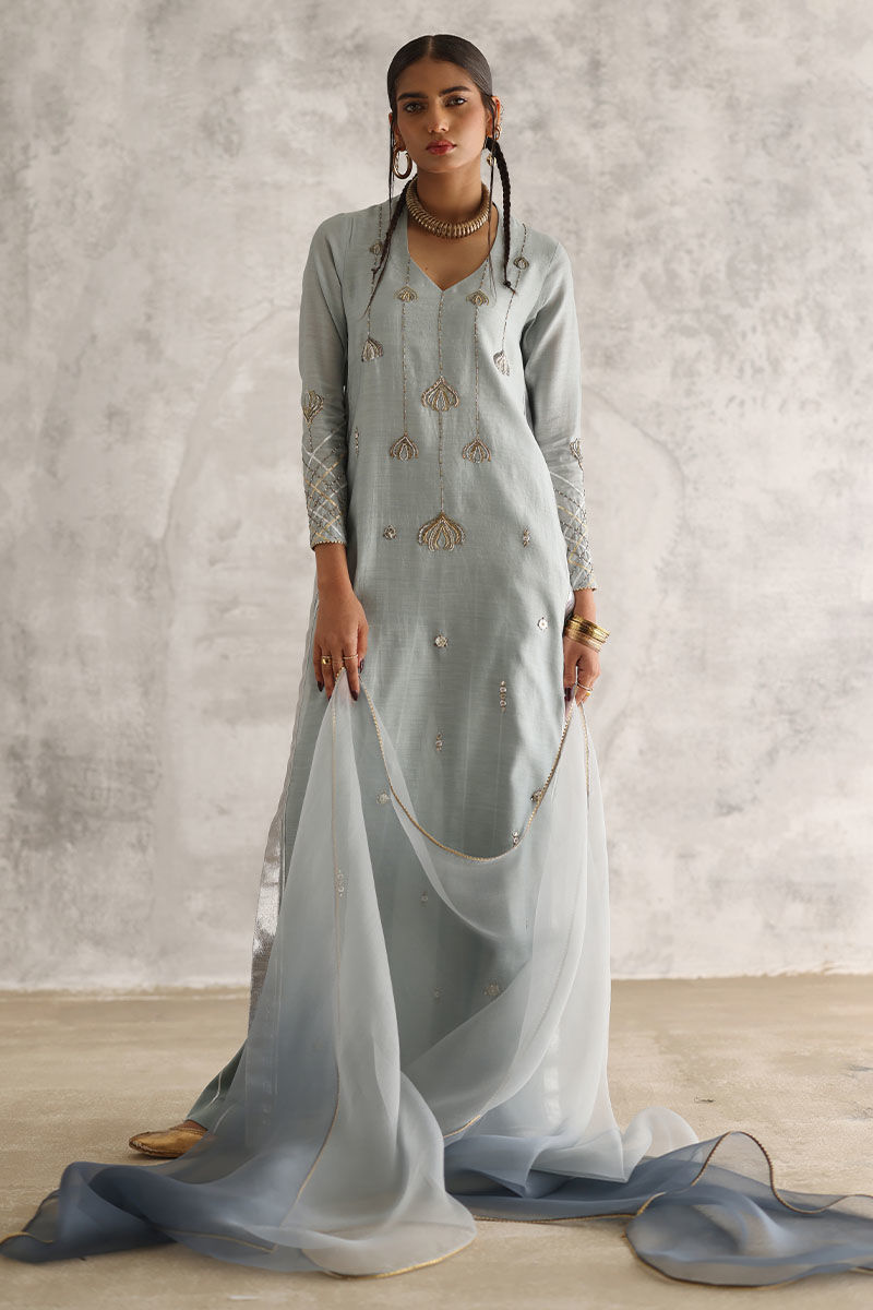 Introducing our cloud blue ensemble, designed to exude elegance and grace. Crafted from pure premium khadi silk, the straight shirt features intricate handiwork of cutdana, gota, sequins, moti, tiki stones, kora, and dapka, adding a touch of opulence to your attire. Paired with buffin satin culottes adorned with dhanak embellishments, offering a perfect blend of style and comfort. Complete your look with a pure organza ombré dupatta, elegantly finished with lace detailing on all four sides, adding a touch of sophistication to your ensemble. Ideal for making a statement at any special occasion.