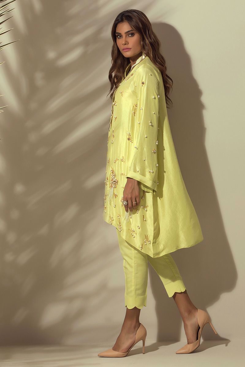 Lime Green colored pure raw silk Top with all over hand worked bunches and Chan.