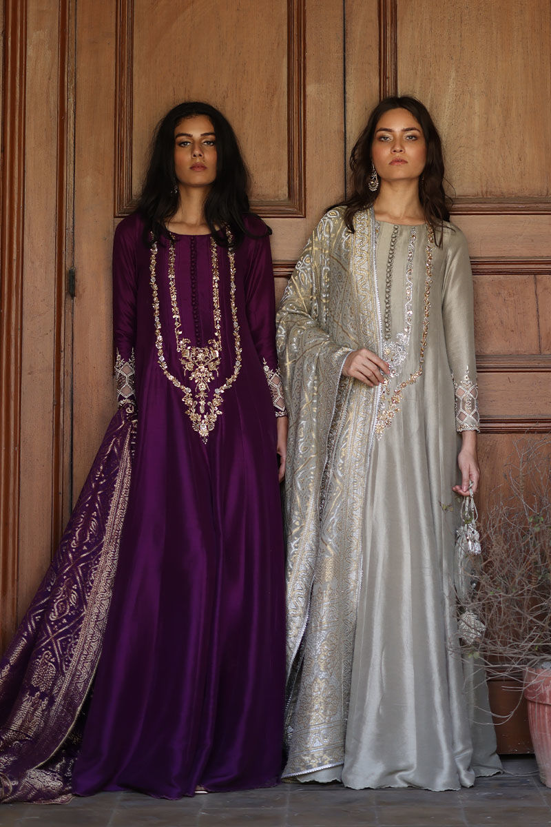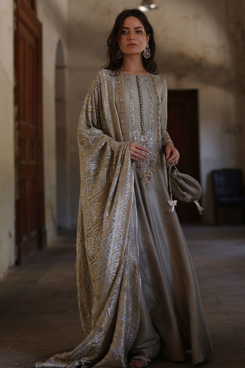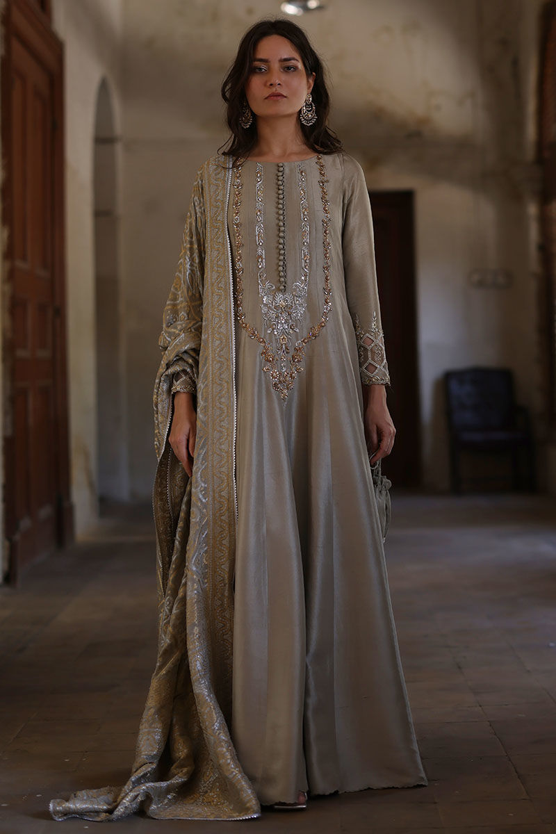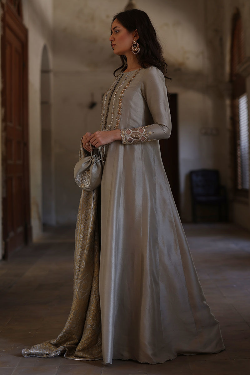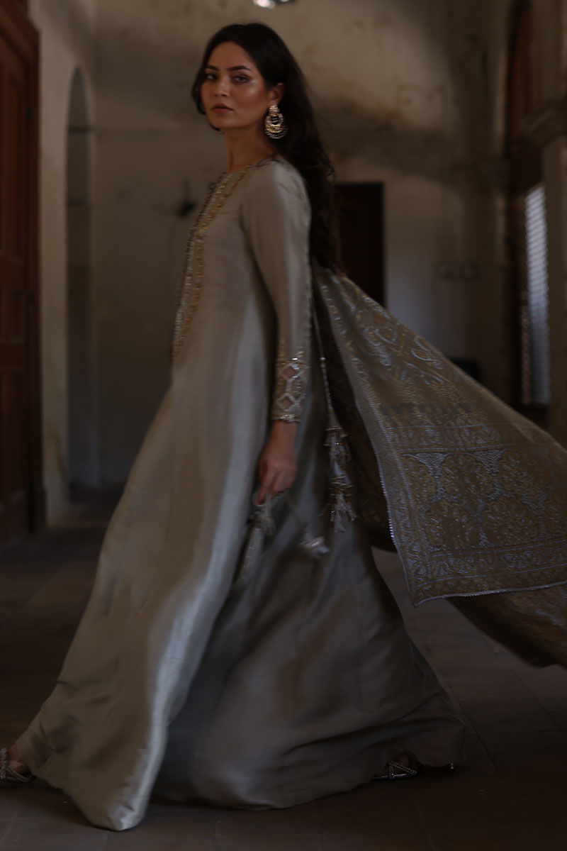 A canvas of silver sage pure raw silk adorned with finest zardozi work in front and resham and zari work on sleeves. The elegant shirt is paired with matching Potli pouch. Finish the look with pure banarsi dupatta with fine antique lace on edging.