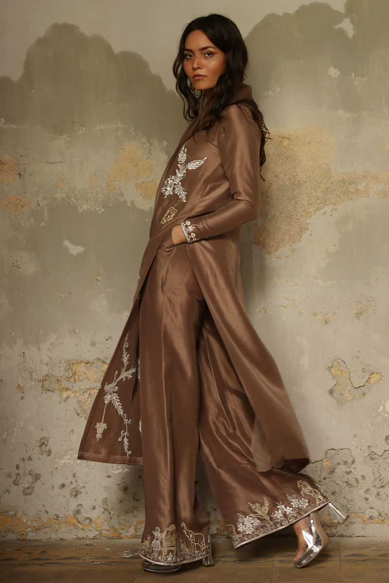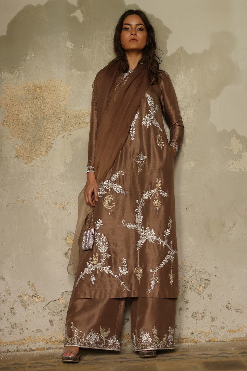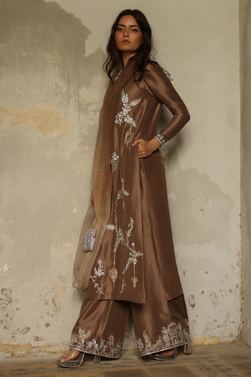Stand out in a stunning pinewood color with zari resham and zardozi work on all over the shirt,and sleeves. The outfit can be paired with shimmer silk pants embroidery on bottoms or Shimmer silk with embroidery on bottoms. Complete the pure organza dupatta in two tone with embroidered scallops.