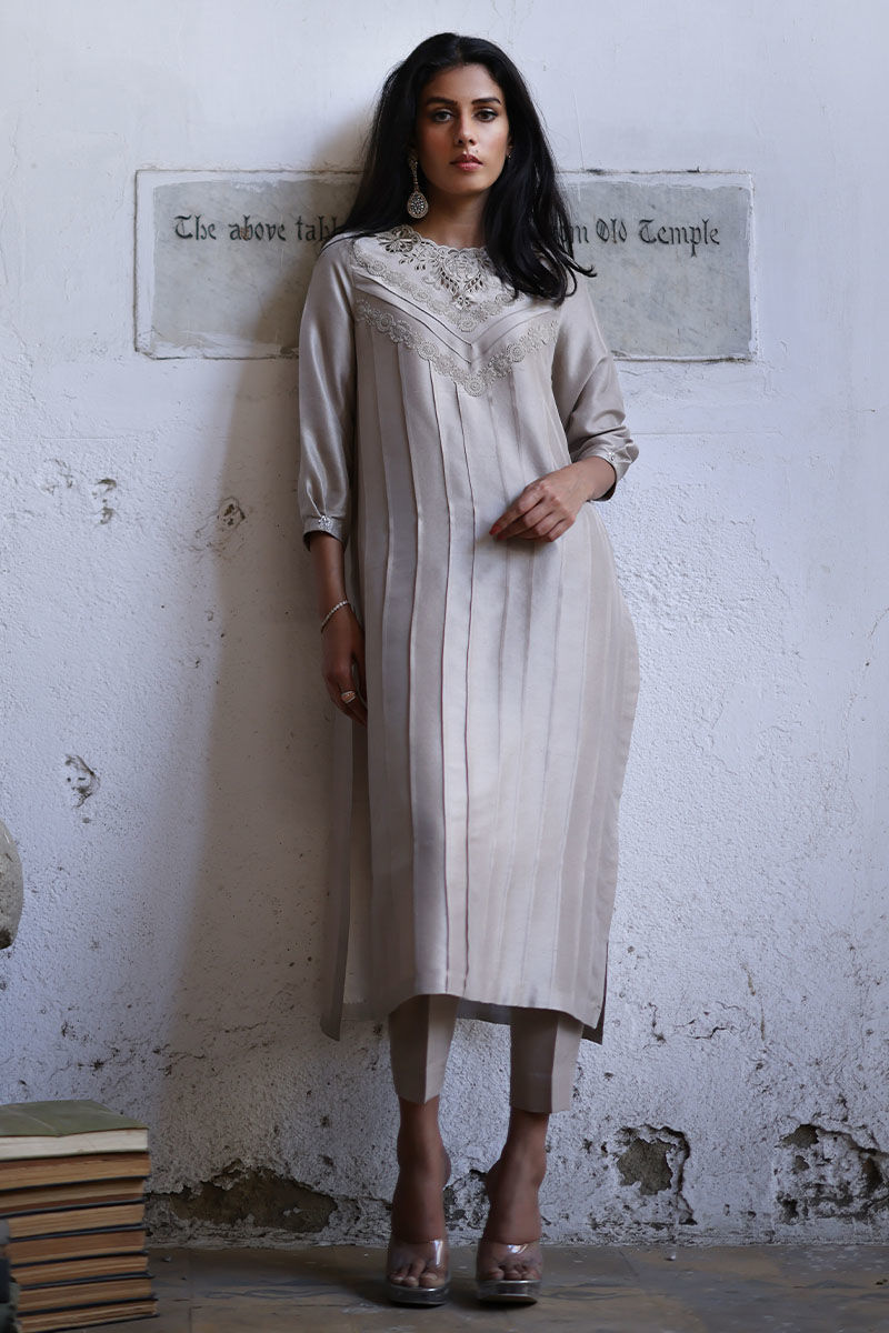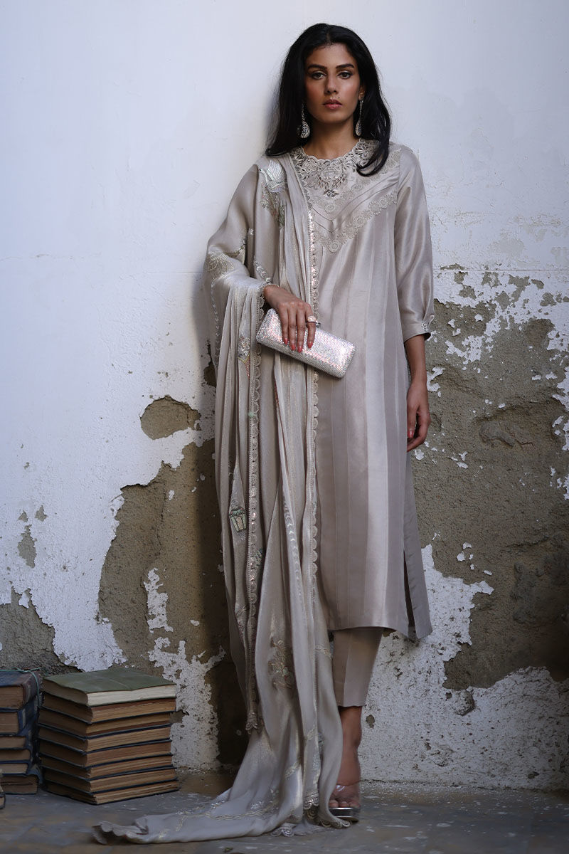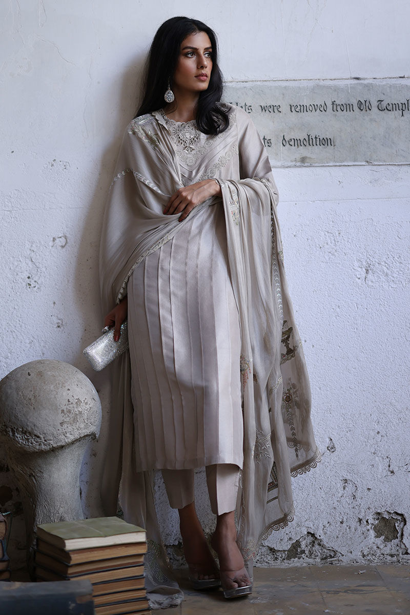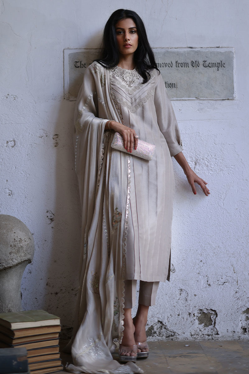 Cut from pure raw silk this oyster beige loose-cut straight shirt is decorated with pleats, pin tucks, and laces all over the shirt and details with cutwork embroidery paired with pure raw silk straight pants. A coordinating, roseya silk dupatta with pastel resham shades and laces on all four sides completes the look. You can also style it with a pure organza dupatta which has resham embroidered scallops.