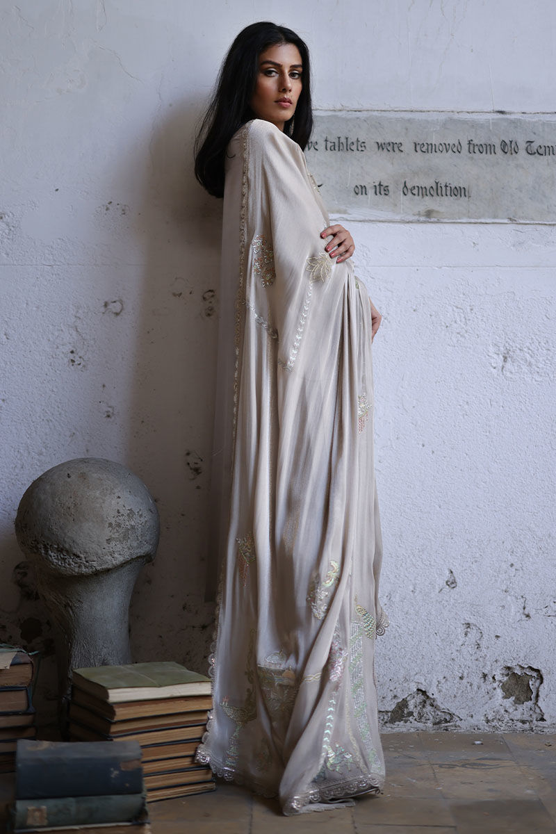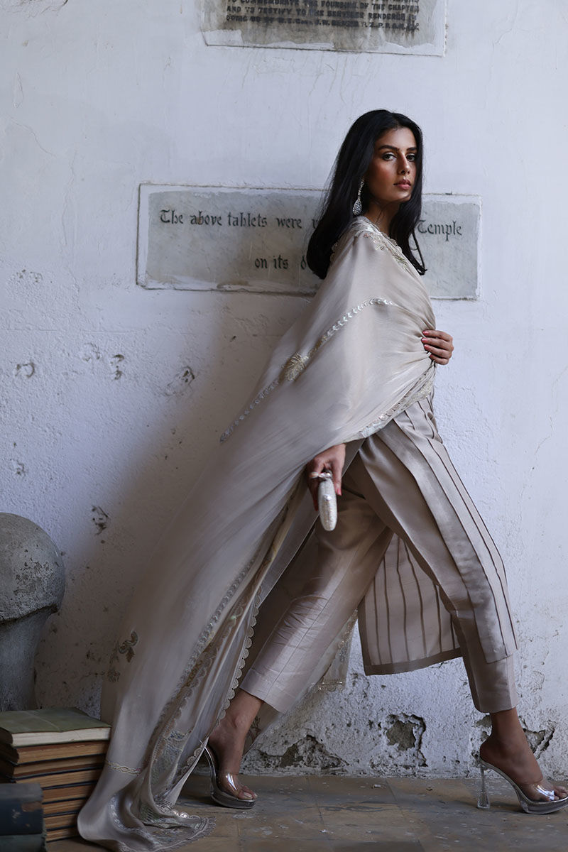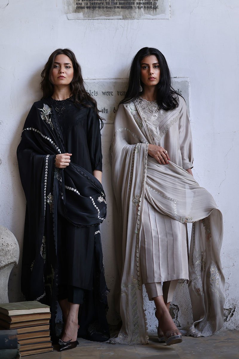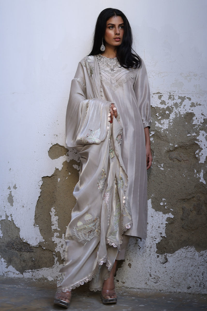 Cut from pure raw silk this oyster beige loose-cut straight shirt is decorated with pleats, pin tucks, and laces all over the shirt and details with cutwork embroidery paired with pure raw silk straight pants. A coordinating, roseya silk dupatta with pastel resham shades and laces on all four sides completes the look. You can also style it with a pure organza dupatta which has resham embroidered scallops.
