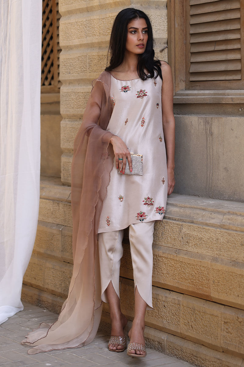 The gilded beige pure raw silk short shirt with spaghetti straps and hand work of resham and beads, zari, dabka, and naqshi.  Complete your set with a shimmer fall silk skinny shalwar.It includes shirt and shalwar.