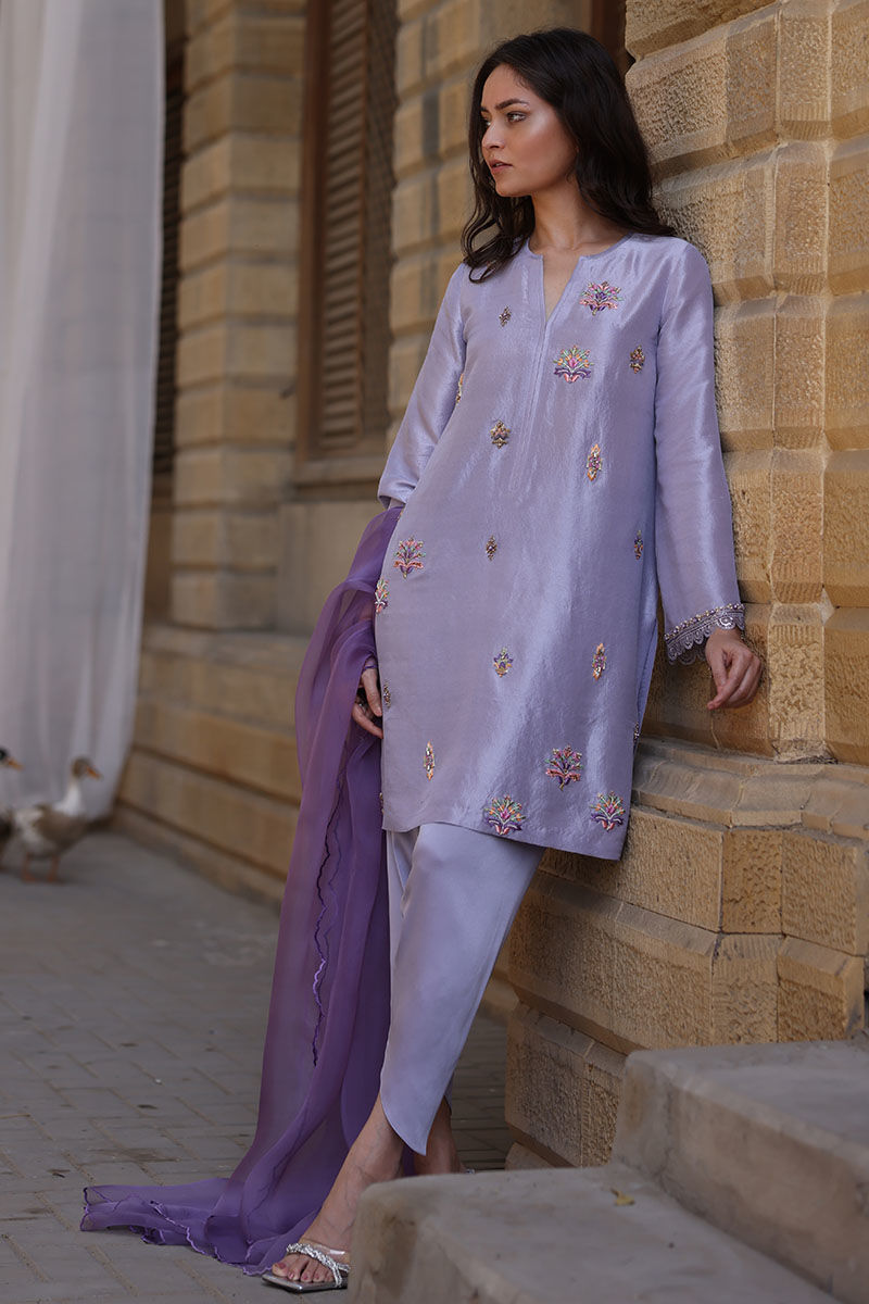 A beautiful shade of lavender aura with a lovely handwork of resham and beads, zari, dabka, and naqshi. Additionally, a beautiful two-tone panel silk organza dupatta adds class to the look. Complete your set with a shimmer fall silk skinny shalwar.