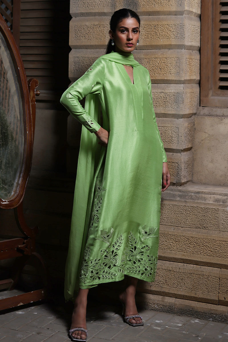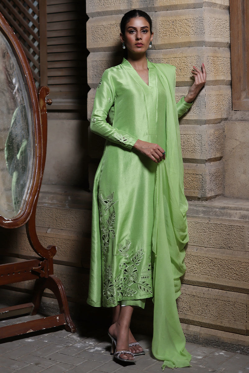 Cut from pure raw silk, the kiwi color silhouette will become your forever favorite, with eye-catching same-color resham embroidery with cutwork on daman and sleeves. Delicate A Line Long Shirt with pure chiffon with Pearl hangings dupatta, completes your ensemble for a stand-out look. Complete your look with our shimmer silk straight pants.