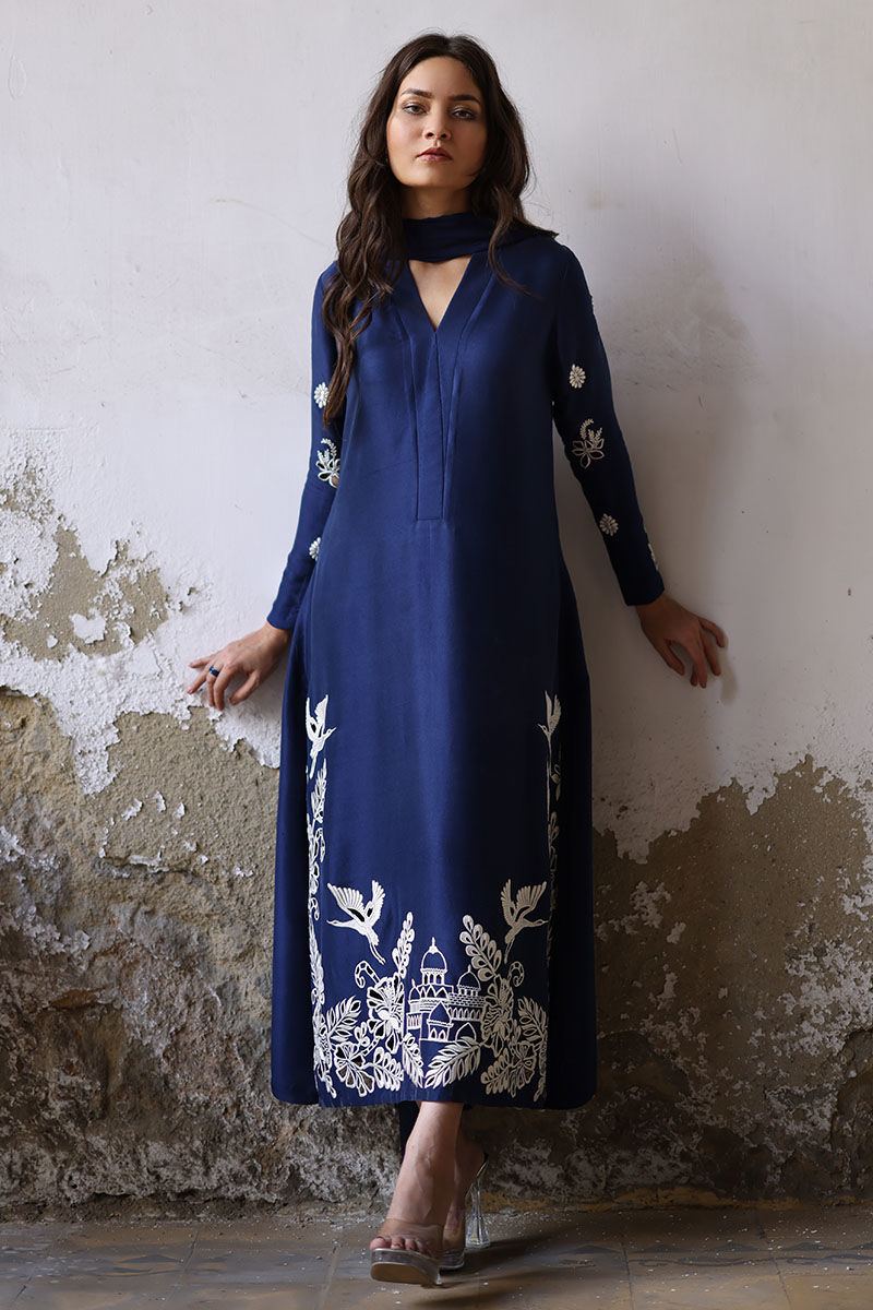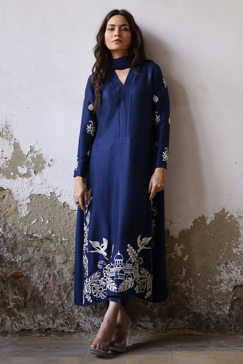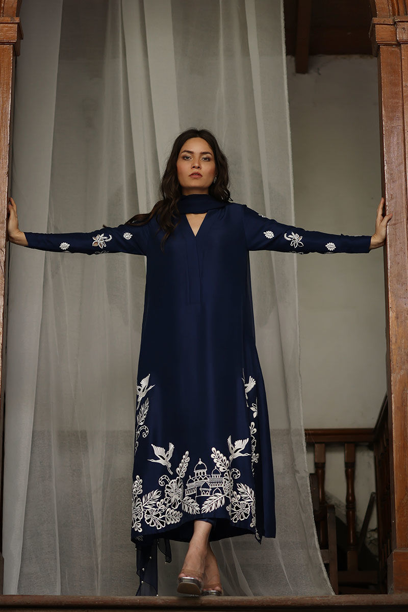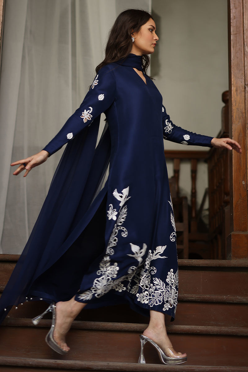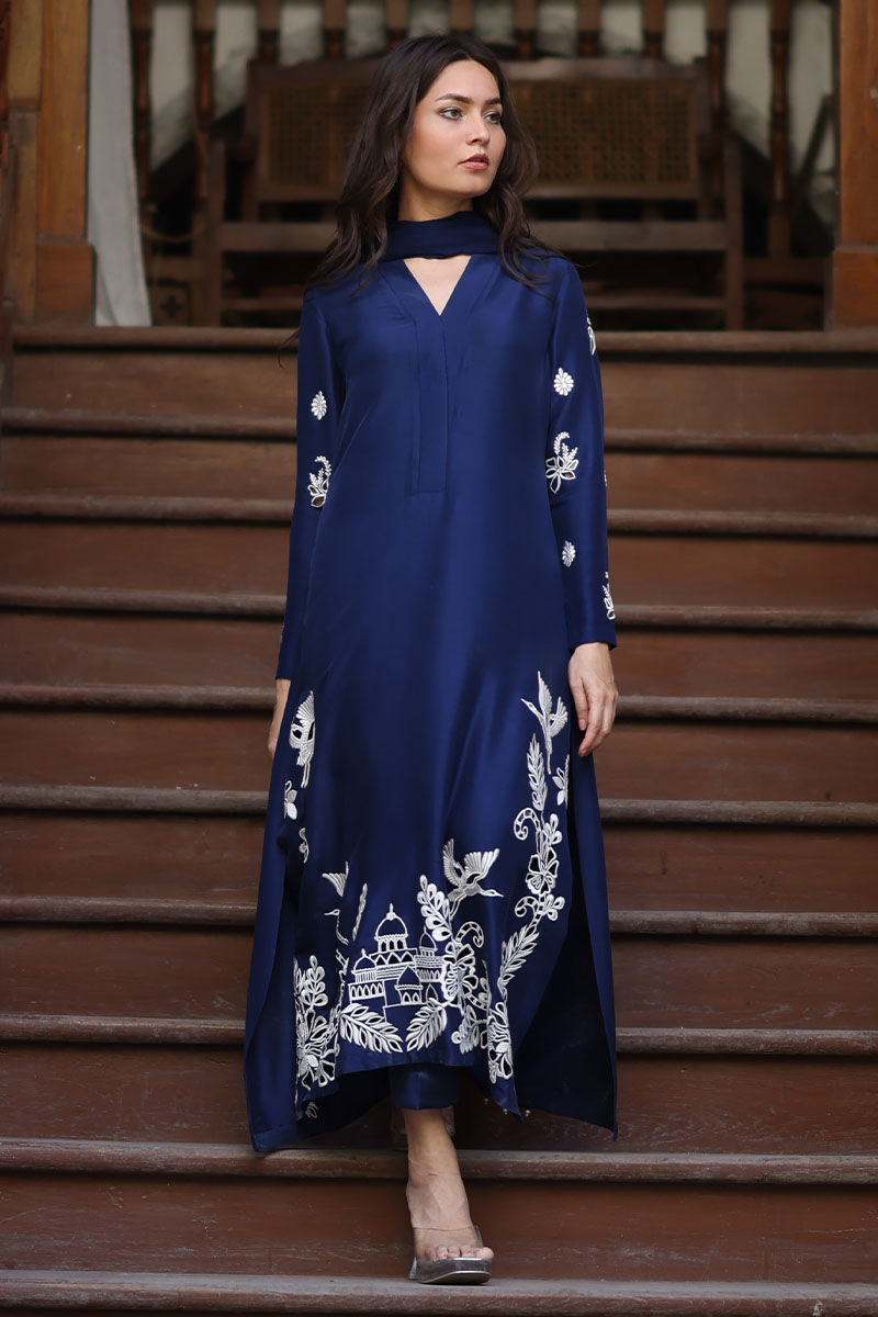 The pure raw silk A-line long shirt with the same color resham embroidery with cutwork on daman and sleeves. The pure chiffon dupatta with pearl hangings gives your outfit that extra touch of glamour. Pair your ensemble with the matching shimmer silk straight pants for a perfectly chic style dapper.