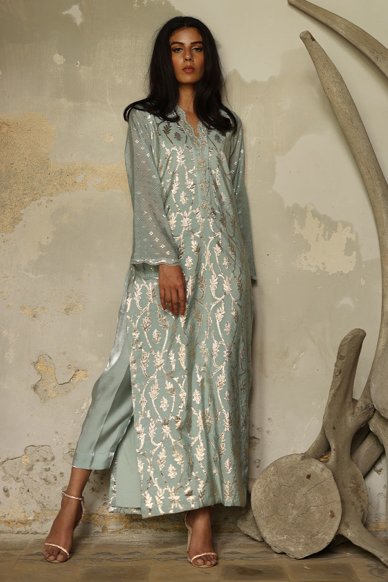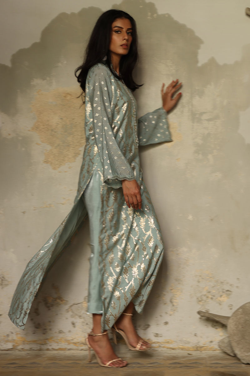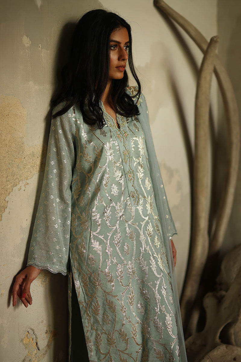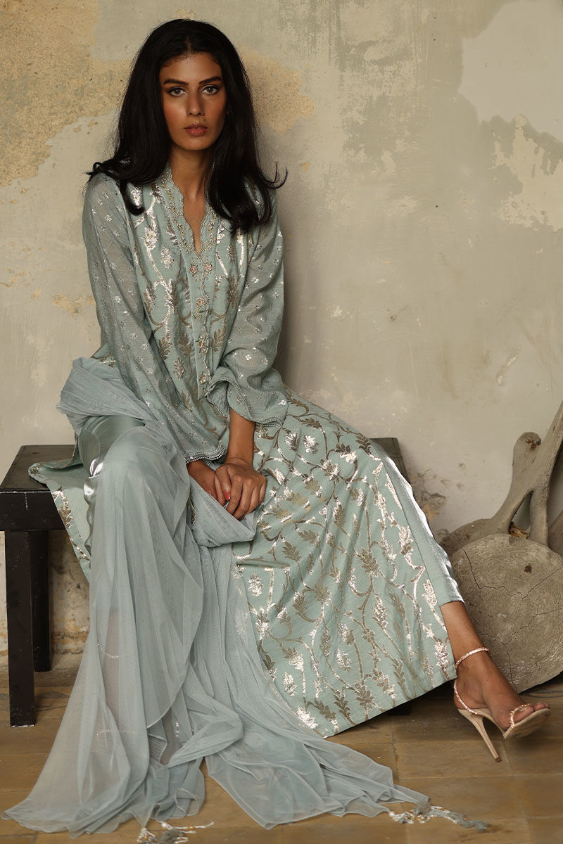 A refreshing cloud blue khaadi long straight shirt with high slits adorned with pastel resham embroidery and beaded handwork on an overlapping neckline. Pair your outfit with our shimmer straight pants. A same color dupatta also embroidered shoulder bunch with resham and beads hangings on pallu.
